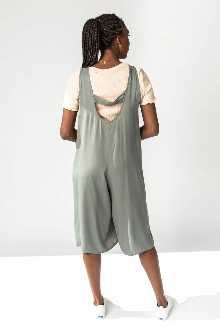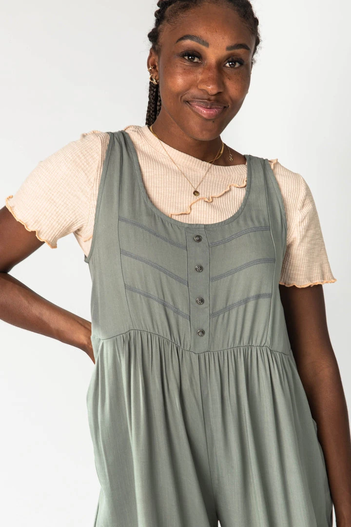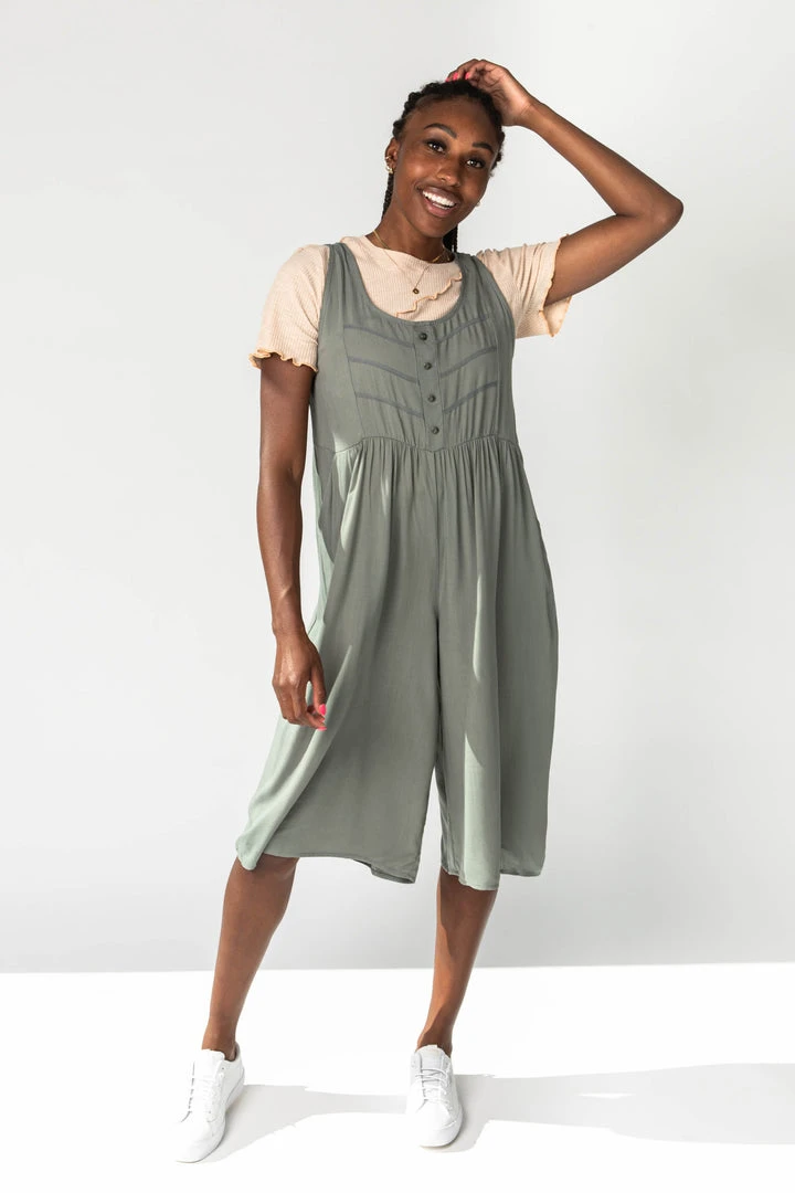 The Gerard Button Jumpsuit has trim detailing + false buttons on the top half. It is a tank style with an elastic waistline. The legs are wide + cropped. It is an earthy olive that is a versatile neutral color.Â