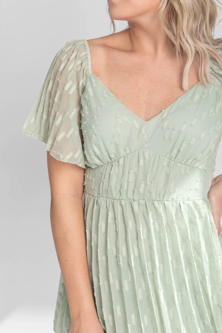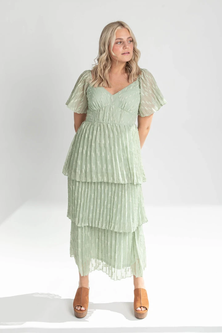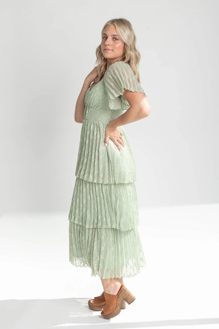 A perfectly pleated pastel pistachio dress. The Gunner Tiered Maxi Dress has sheer sleeves + a structured silhouette with a zipper closure at the back. It has a textural overlay + tiered skirt.Â