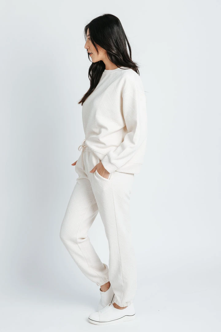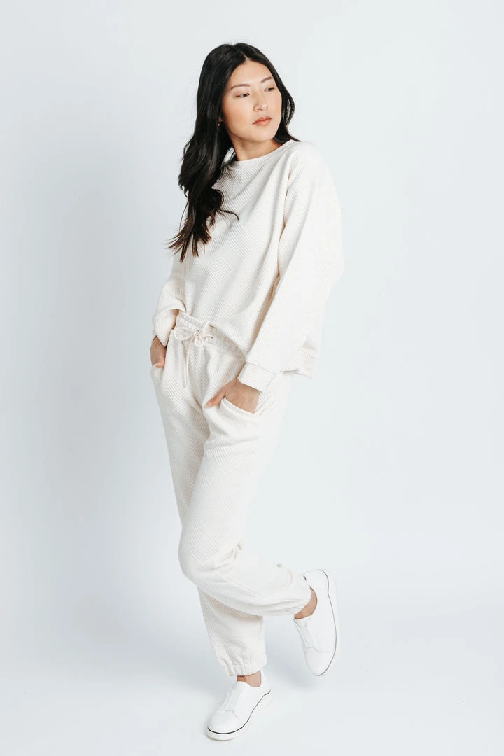 The Hailey Textured Joggers are a comfy + cute option with lots of versatility. They have an elastic waistline. They’re made from a stretchy + textured fabric. Pair with The Justin Textured Crewneck to make it a set.Â