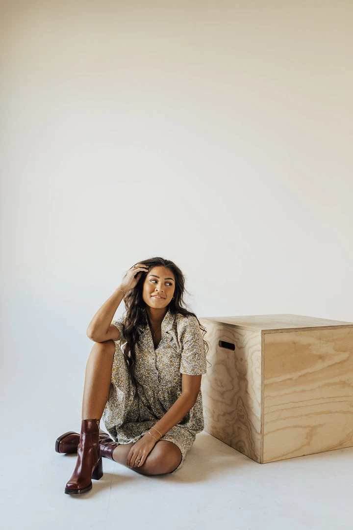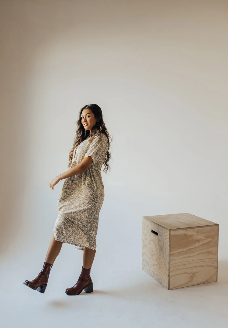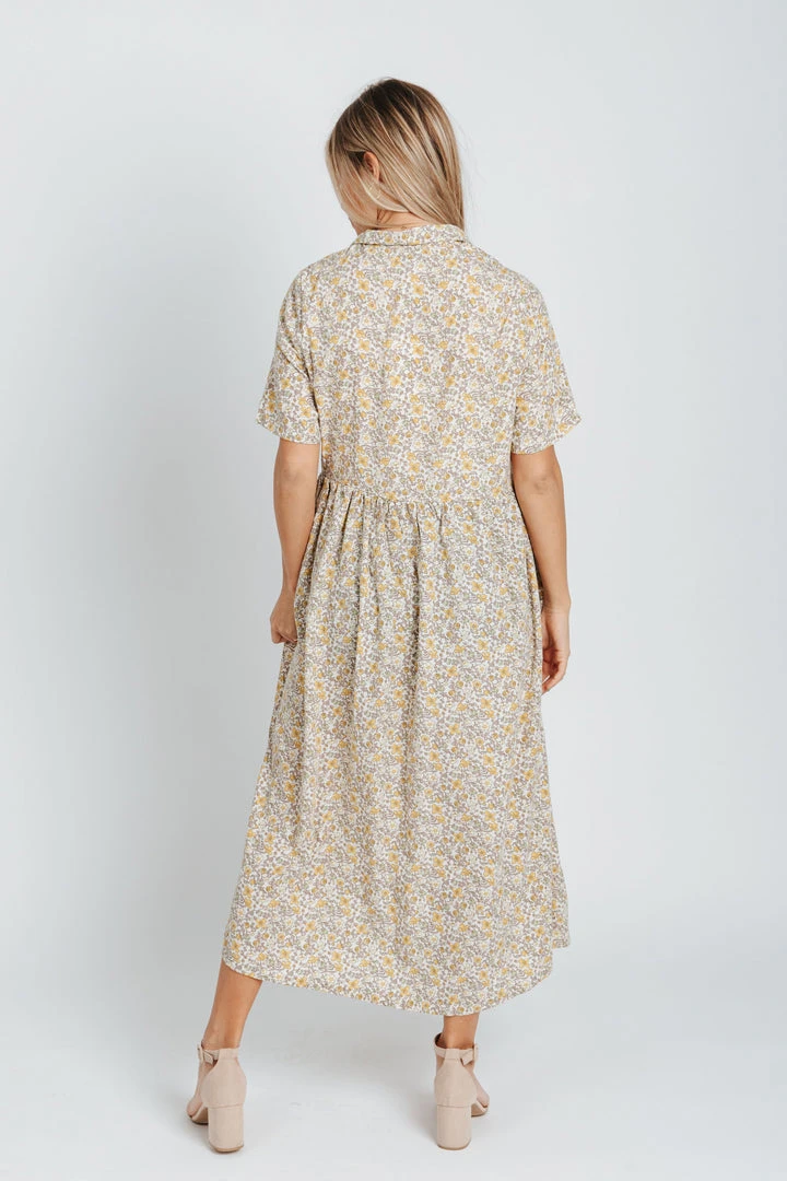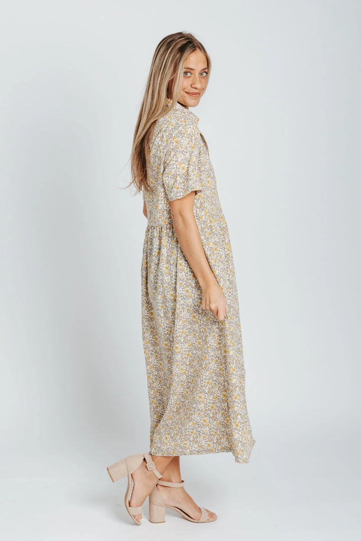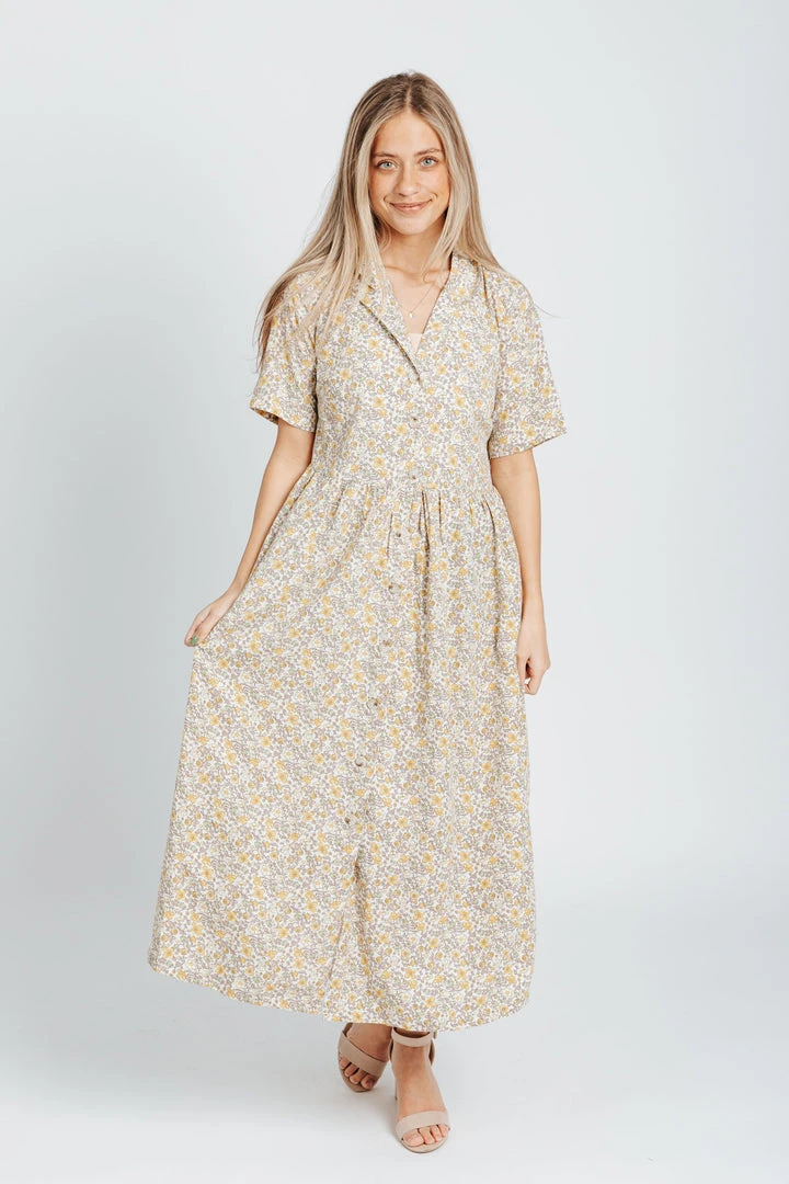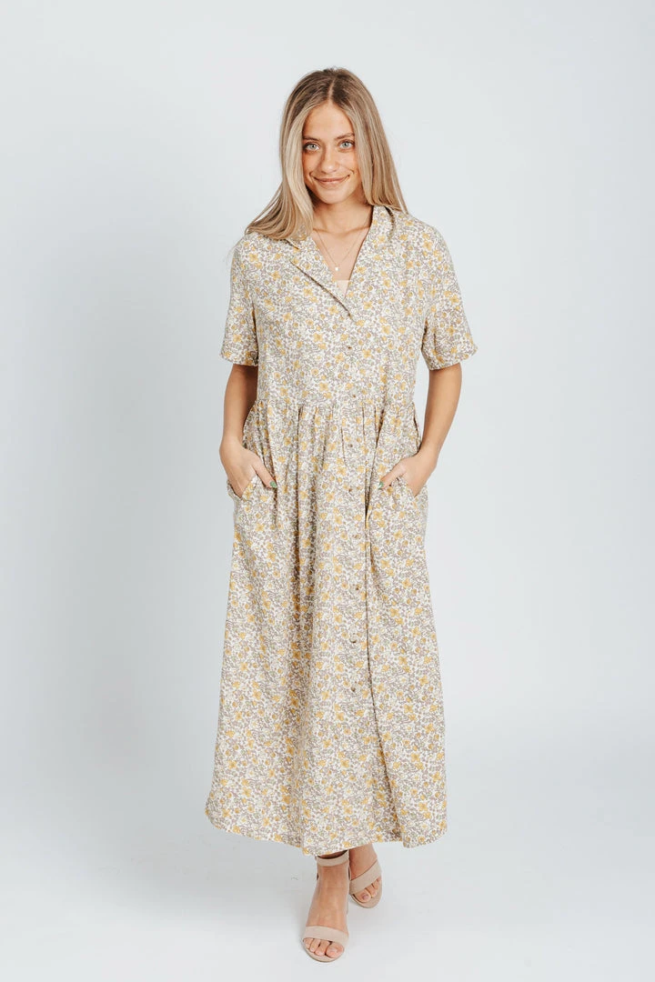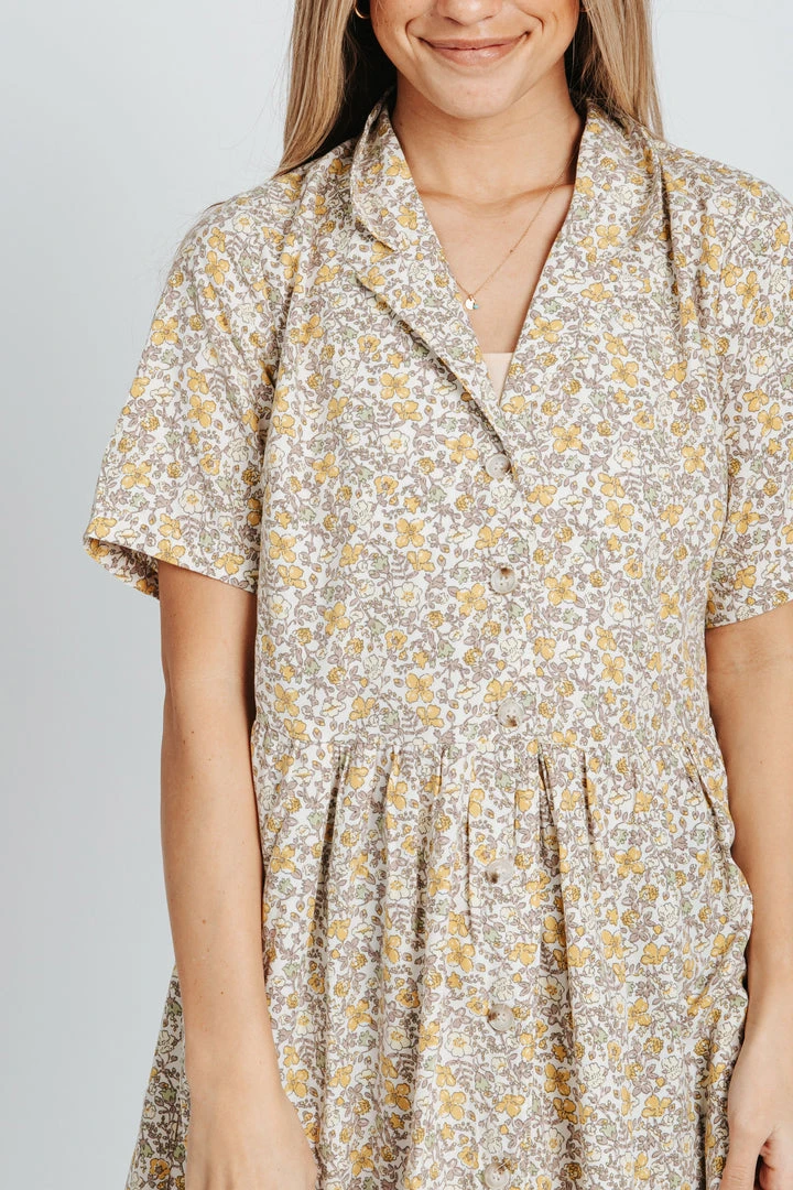 Retro + ready to go. The Heidi Collar Dress has warm neutral colors in a throwback floral print. It has buttons down the front, hidden side pockets, and comes lined. It has a structured waistline that offers a flattering fit.Â