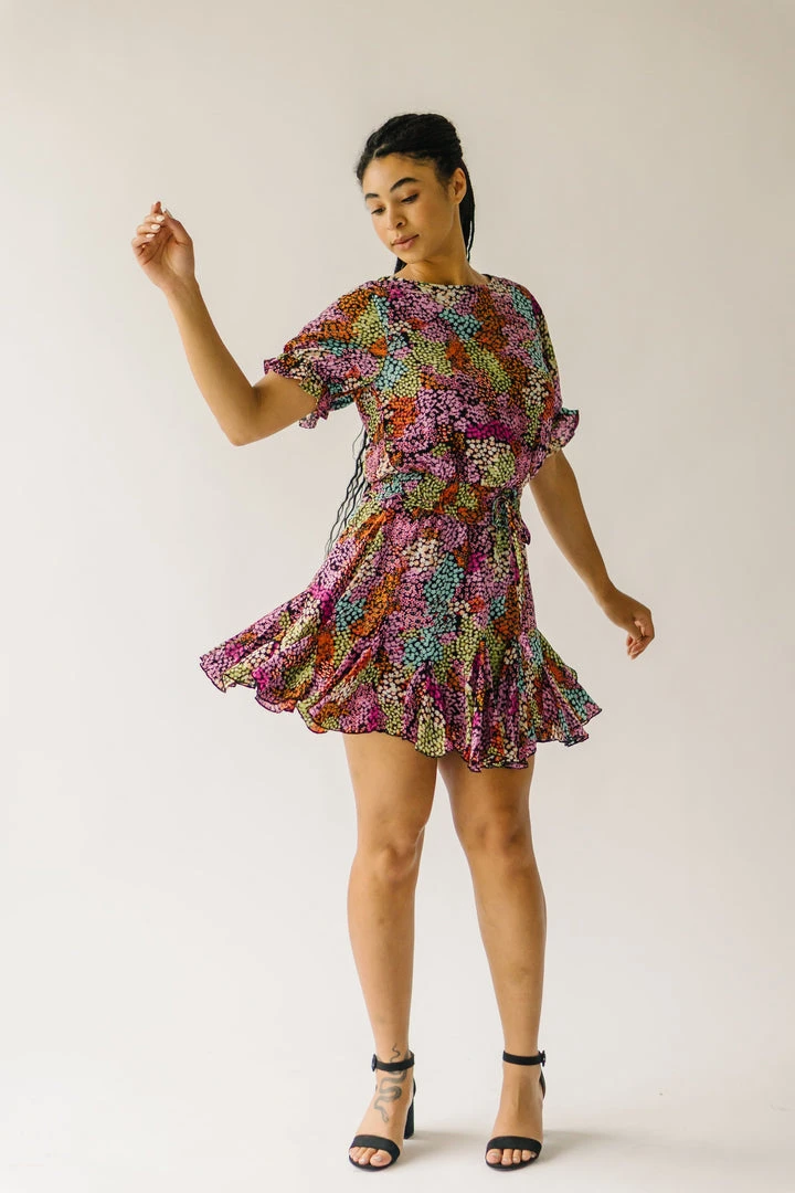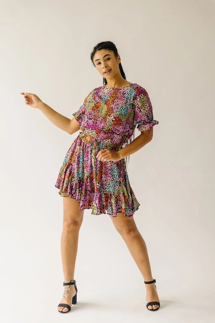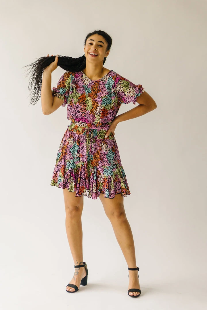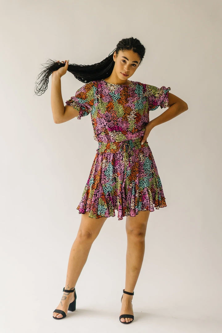 The Higham Pleated Dress has a fun floral print with ruffle sleeves + a ruffled hemline. The waistline is ruffled + flexible. It is a shorter style.Â