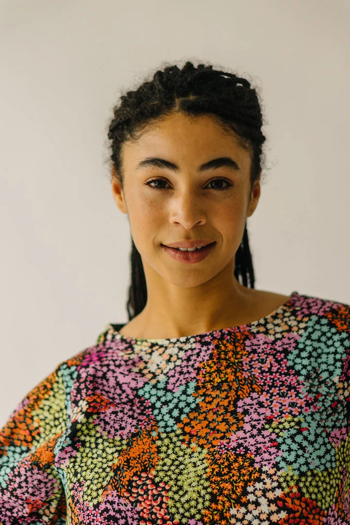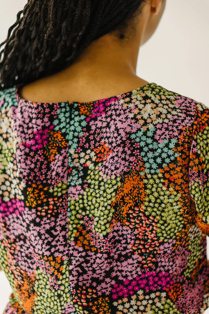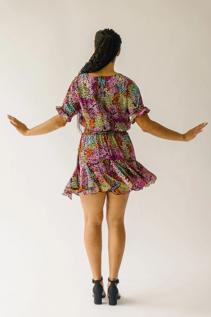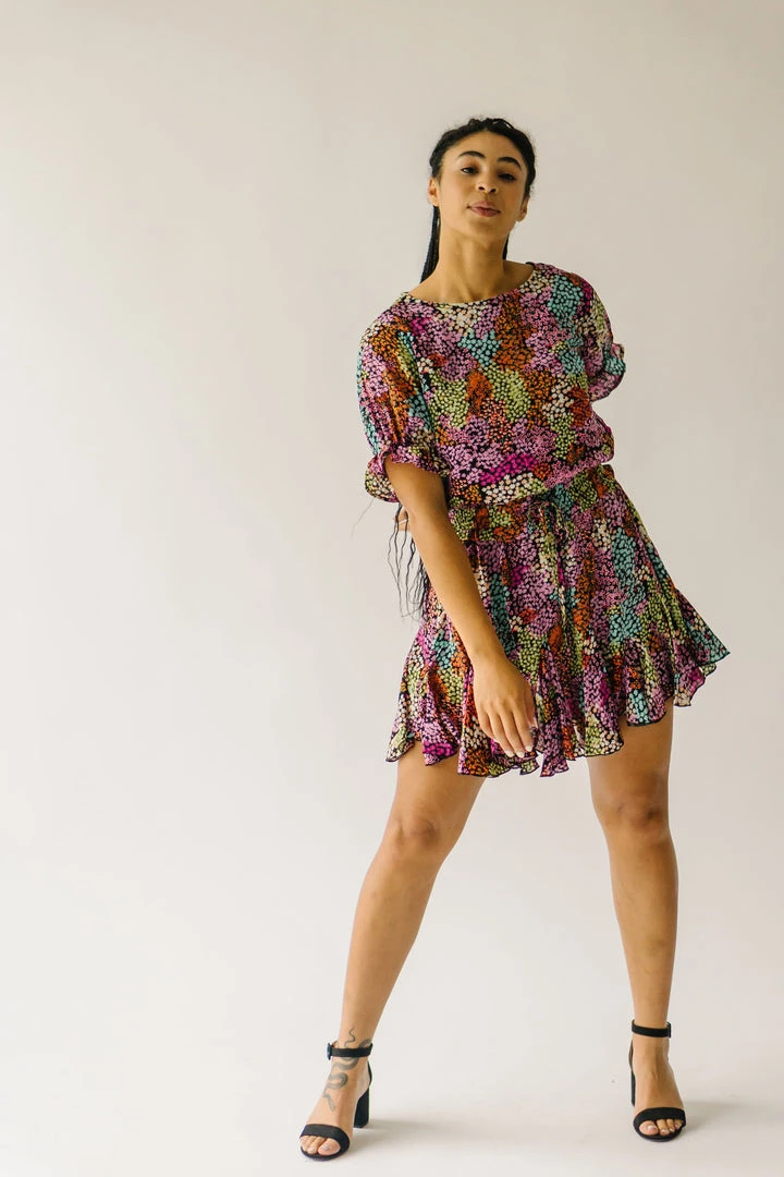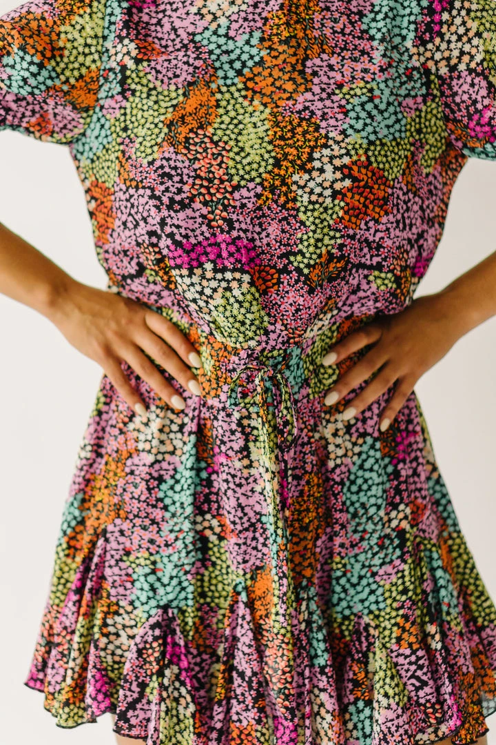 The Higham Pleated Dress has a fun floral print with ruffle sleeves + a ruffled hemline. The waistline is ruffled + flexible. It is a shorter style.Â