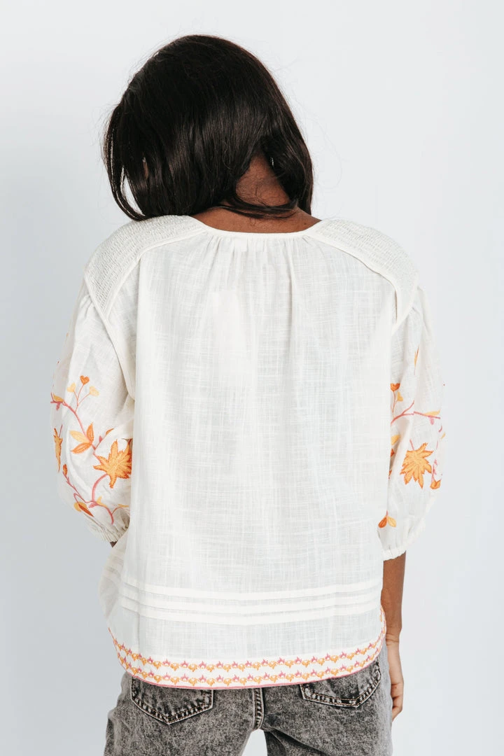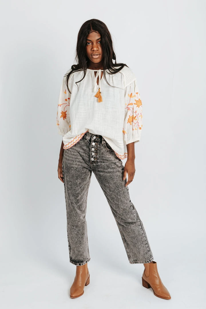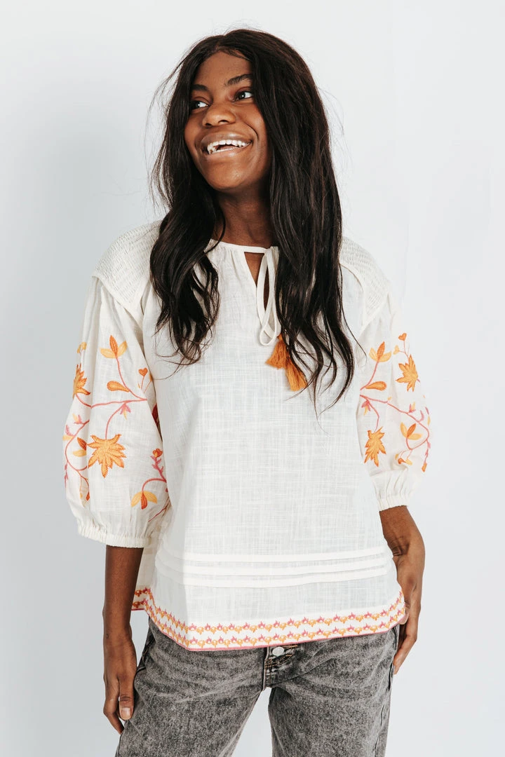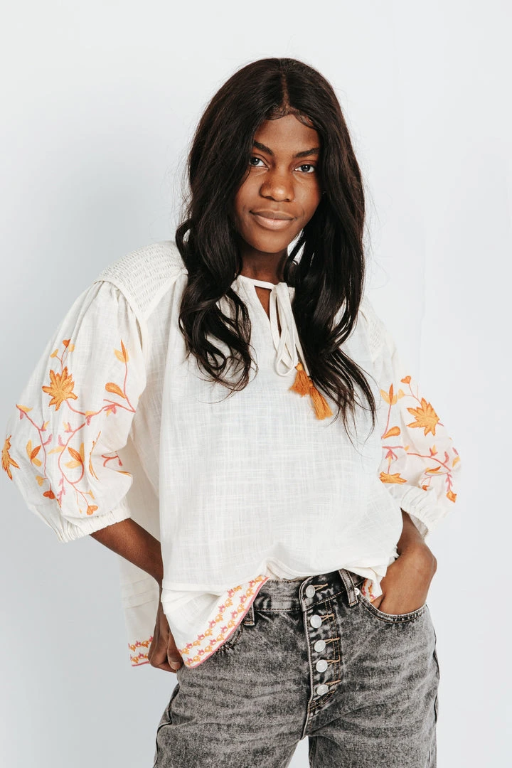 Textural detail + color makes this blouse stand out. The Hilma Embroidered Blouse is cream-colored with colorful floral embroidery on the sleeves, tassel ties, and embroidered hemline. It has textured shoulder panels with a panel of pleats above the hemline. It has a swingy fit + a traditional length.Â