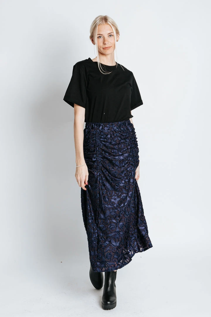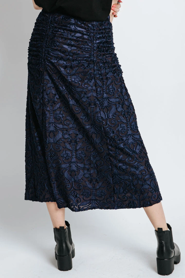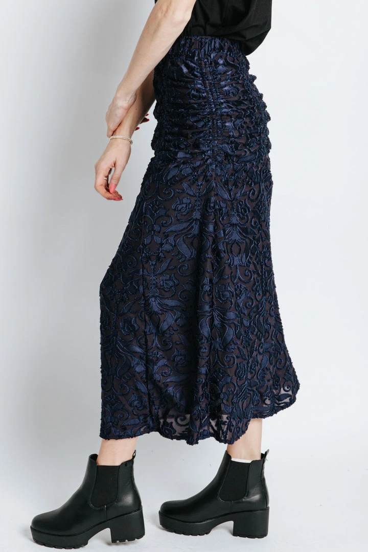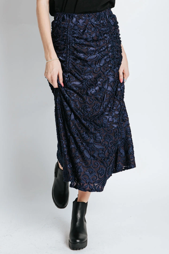 Elegance with an edge. The Hinckley Ruched Textured Skirt has a slim fit with a lace overlay + dark liner. It hits past the knee. Dress it up or down.Â