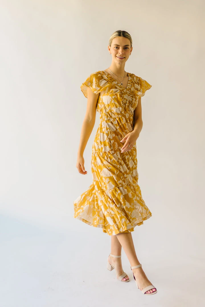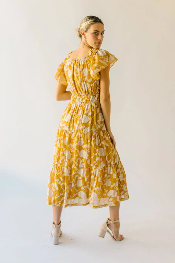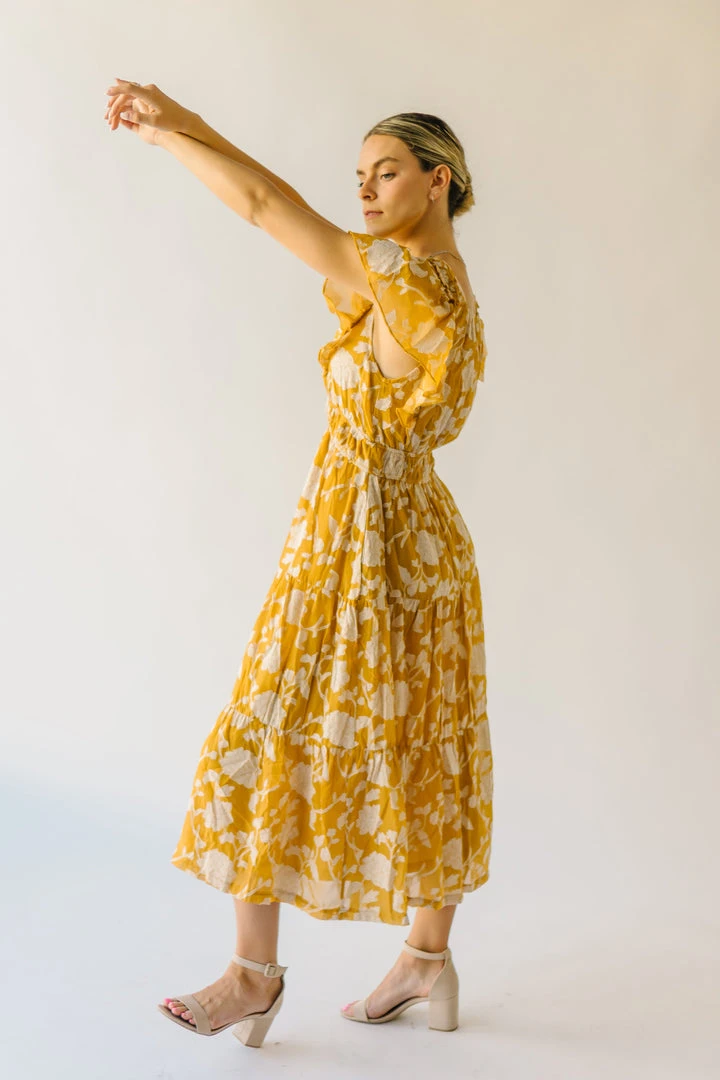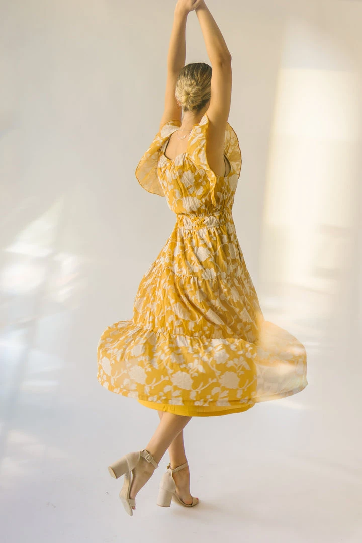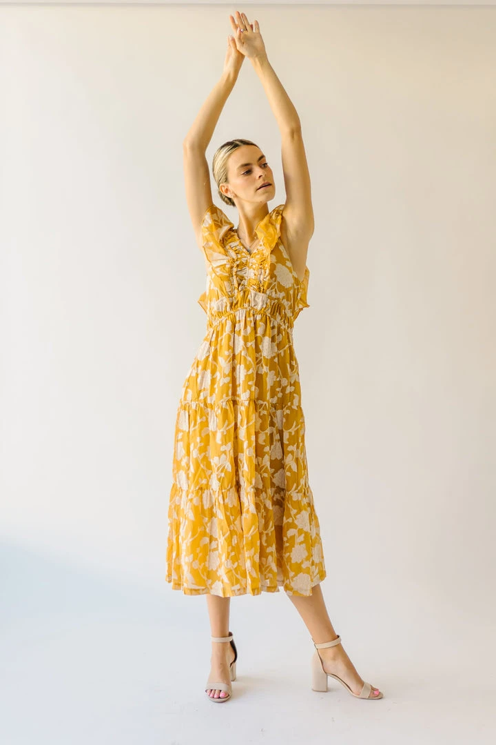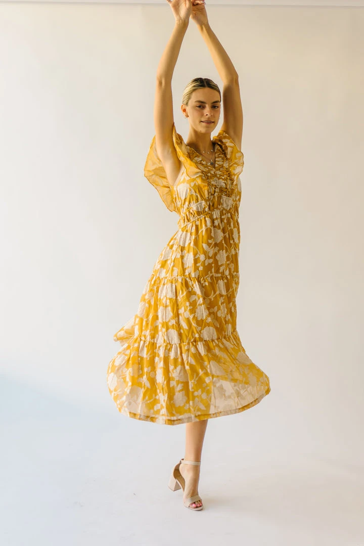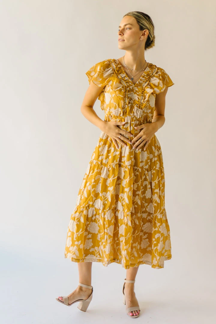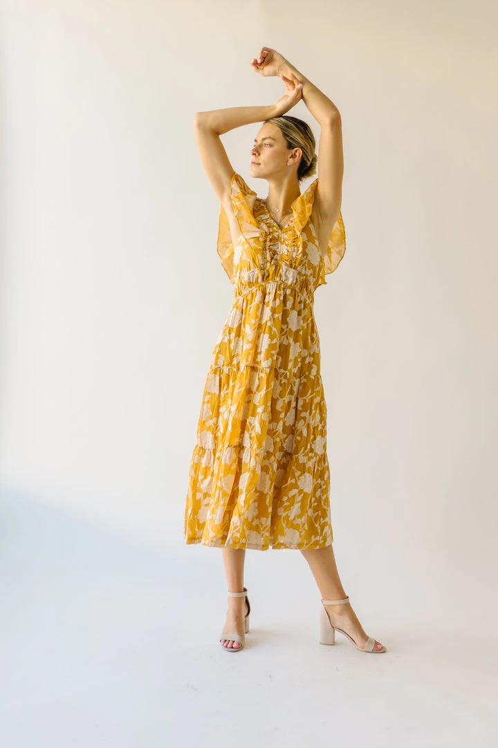 The Imara V-Neck Floral Midi Dress has fine-detailing + a fantastic floral print that takes it to the next level. The v-neckline + ruffles provide a flattering + flexible fit. It is lined.Â