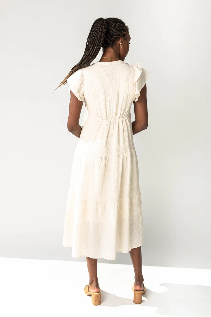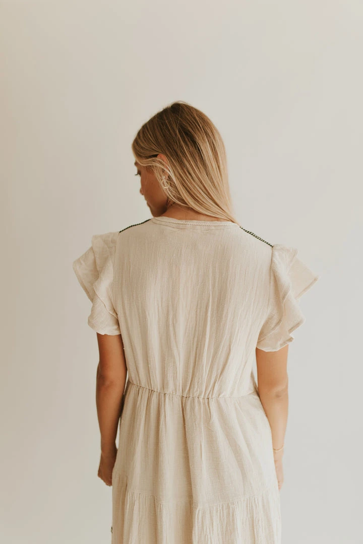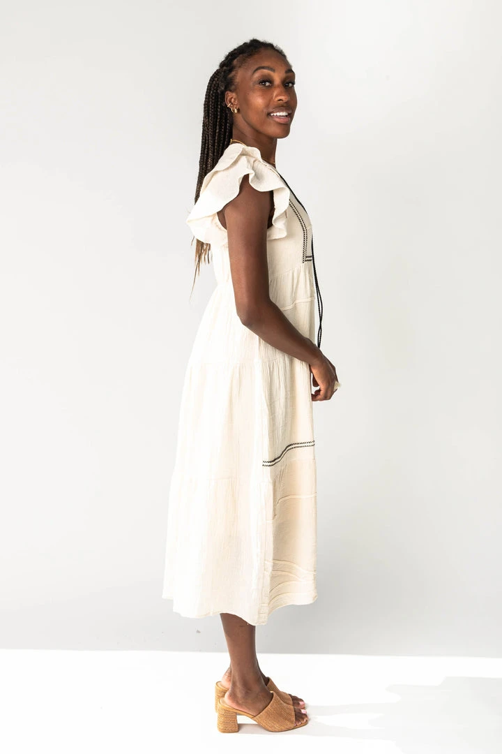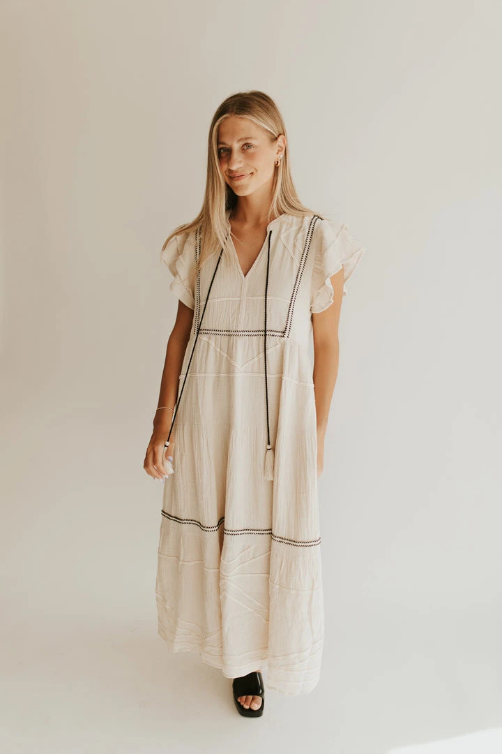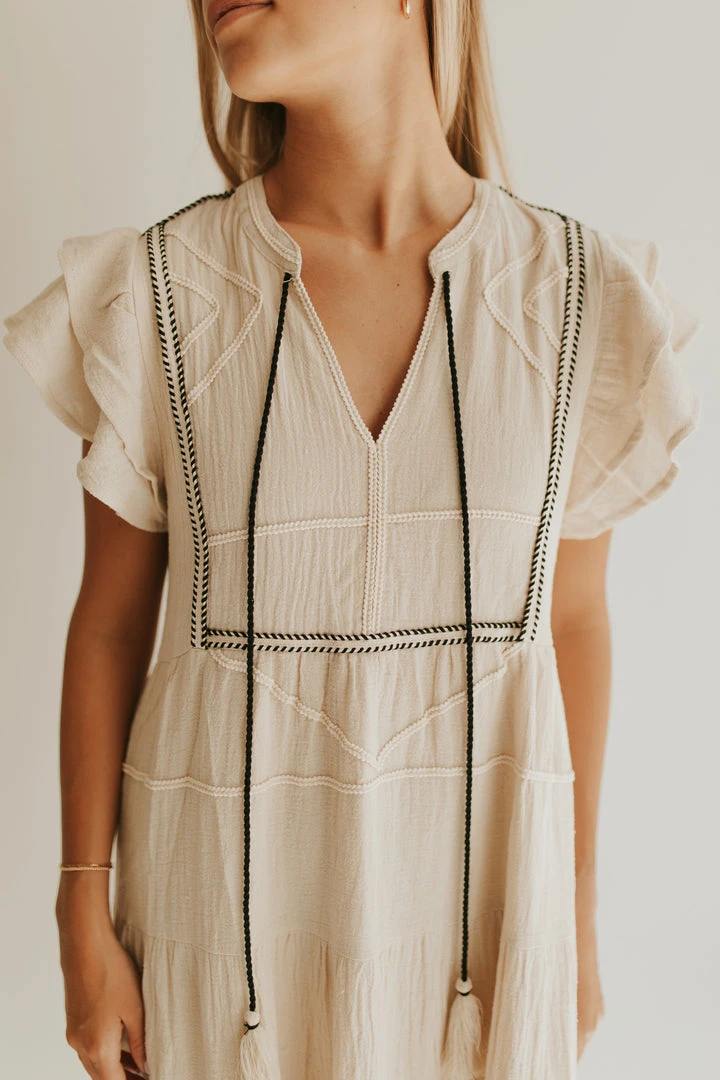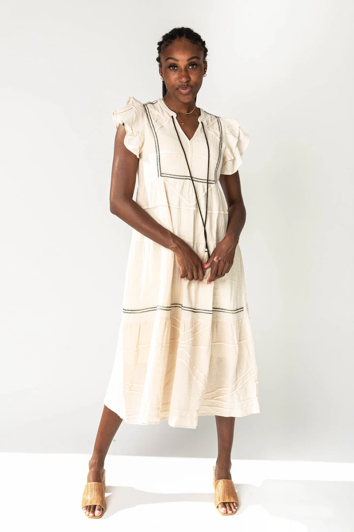 The Jennings Tassel Dress has black trim detailing that pairs perfectly with the cream embroidery. It has a tassel tie neckline with tiered ruffle short sleeves. It has visual + textural interests that make this dress an easy option.