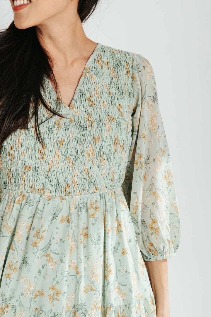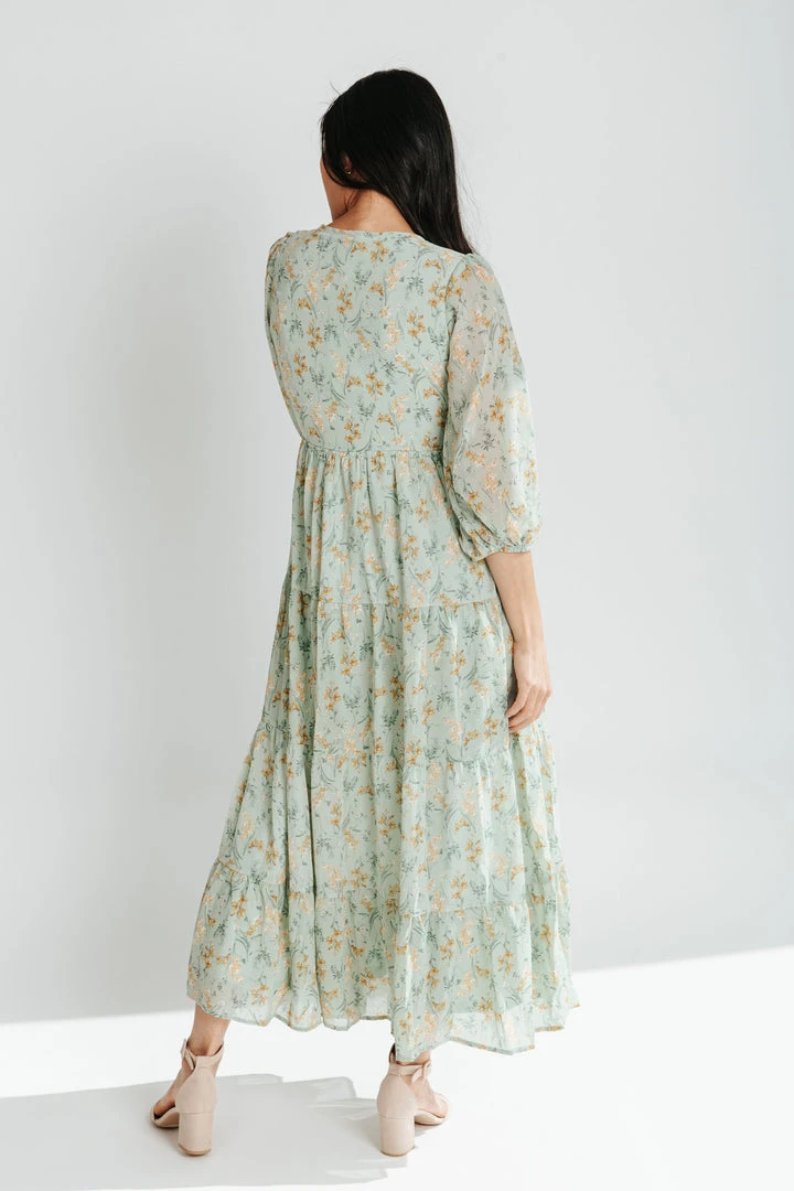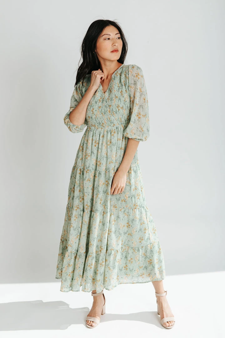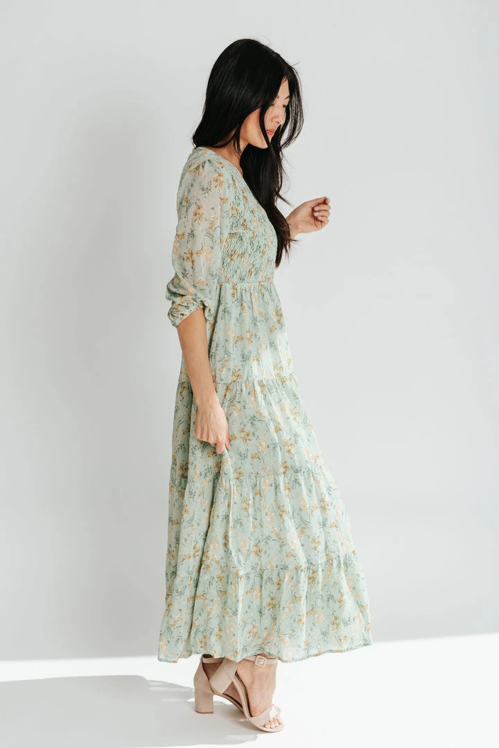 The Jessa Smocked Maxi Dress is a dusty sage that pairs easily with other colors. It has a smocked wrap-style bodice with sheer sleeves. It has an elastic waistline, a tiered skirt, and comes lined.Â