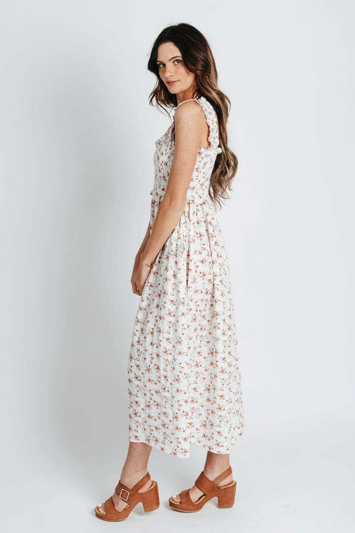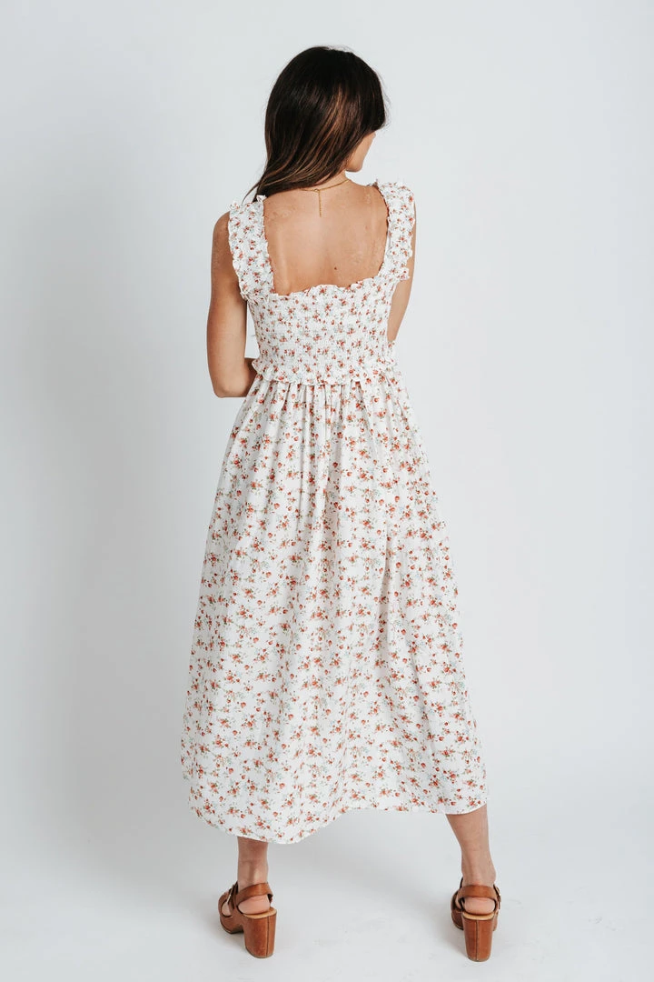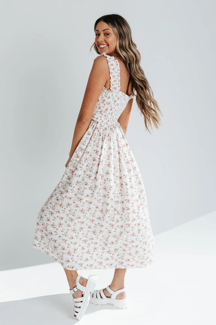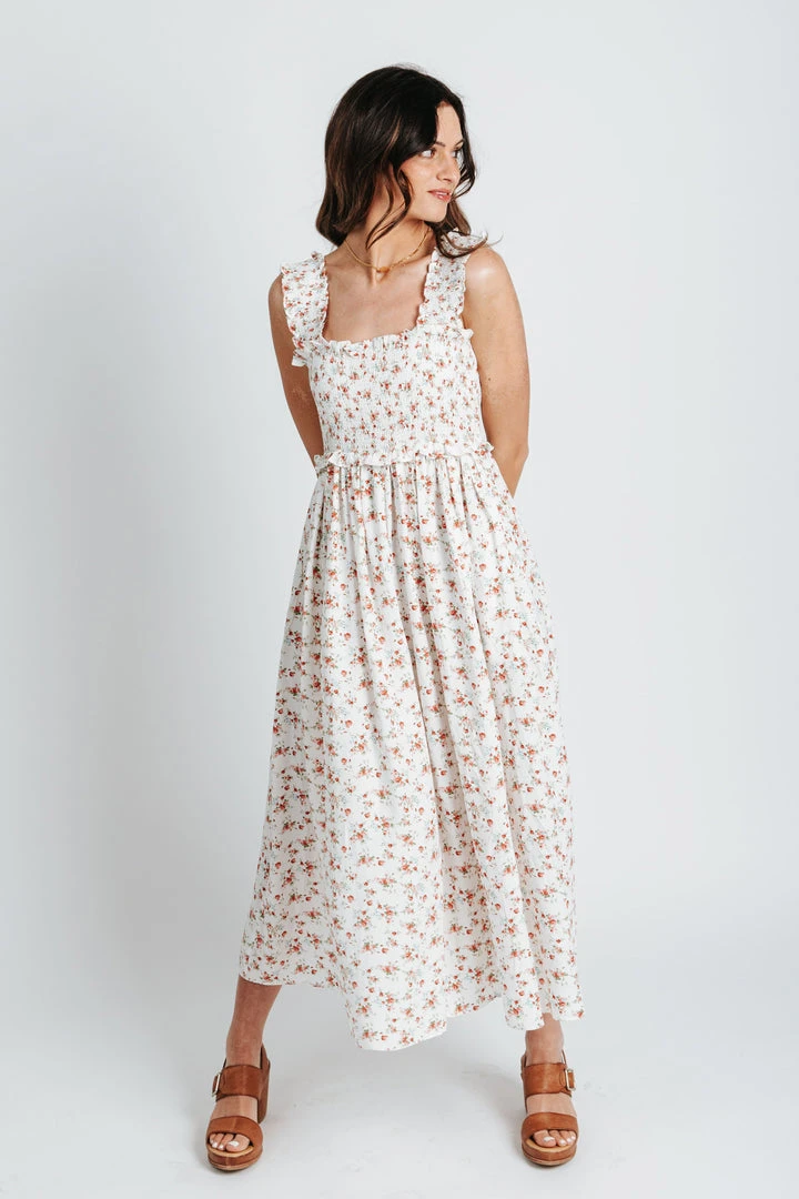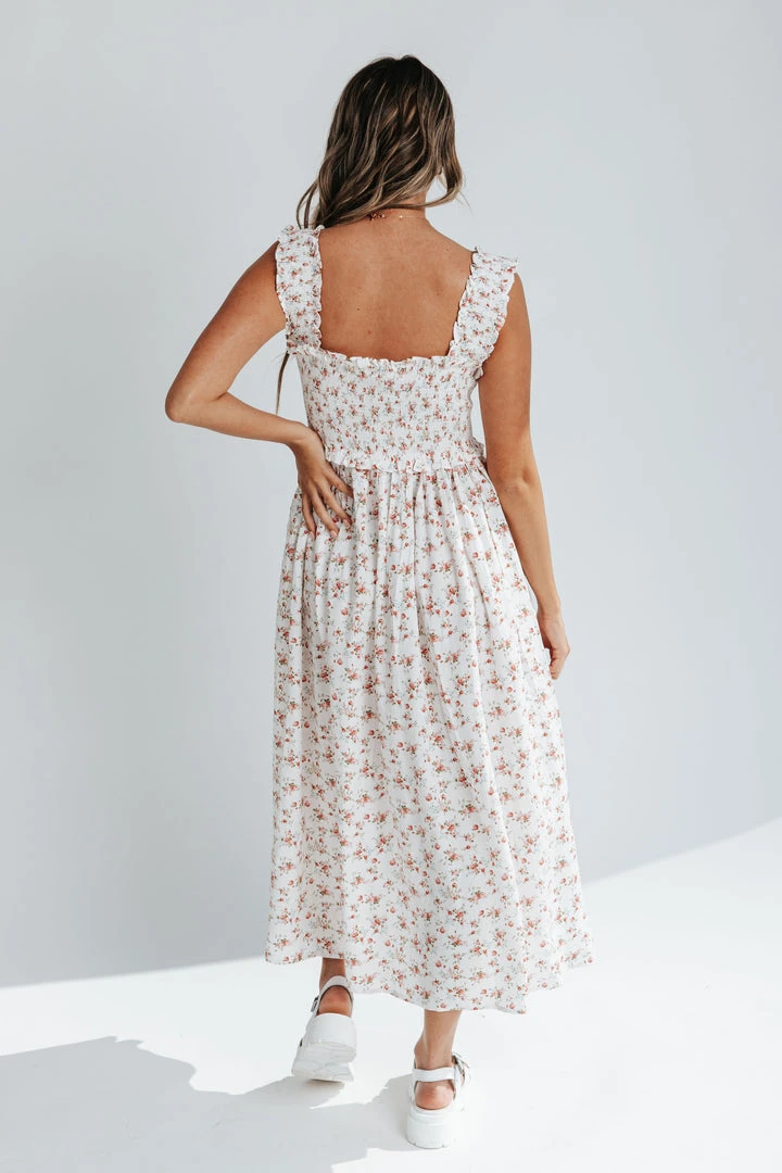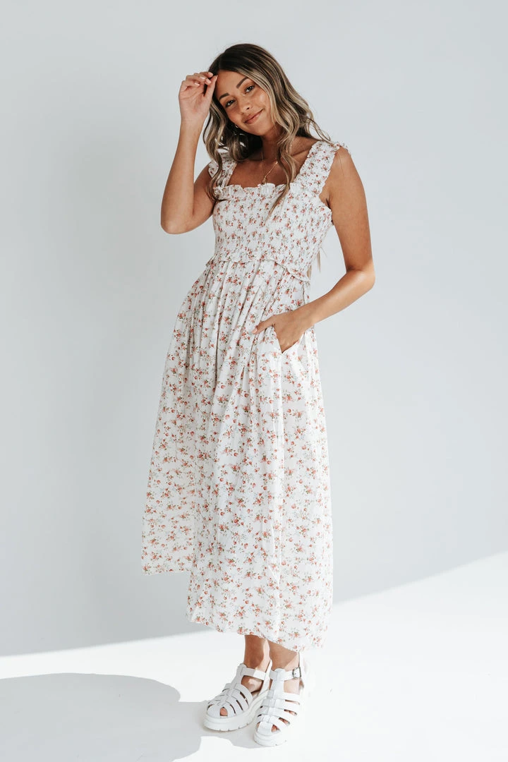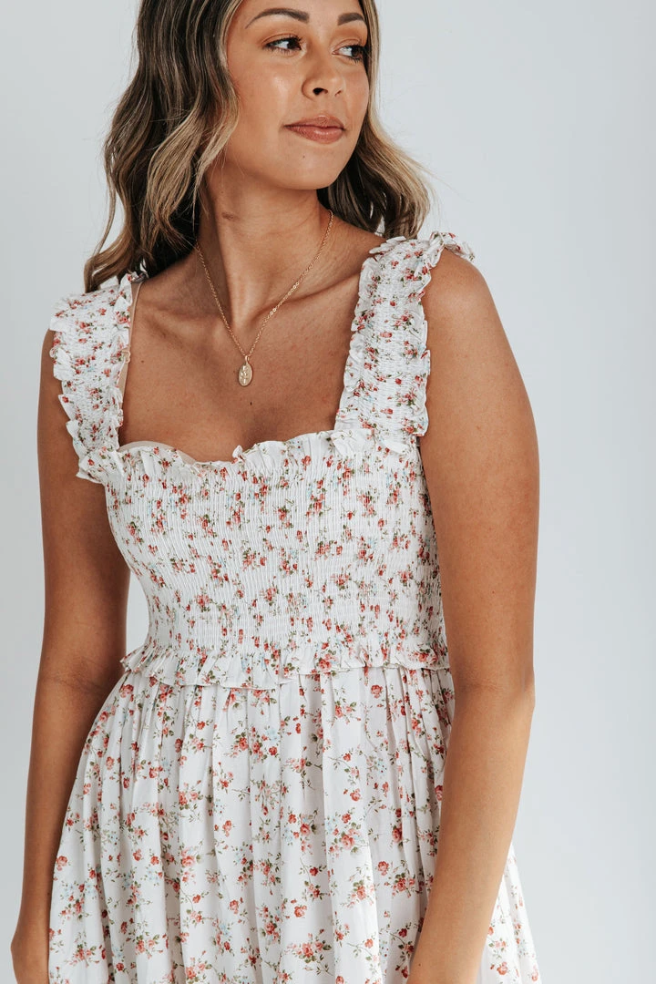 The Joan Floral Tank Dress has a flexible smocked bodice. It has ruffle tank sleeves with a square neckline + back. It is warm-weather-ready with its fantastic floral print + spring vibes.Â