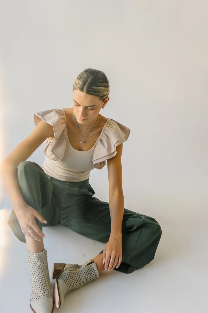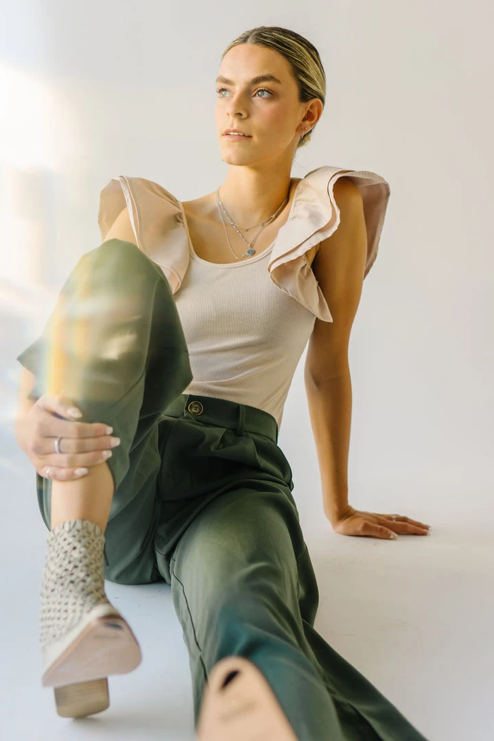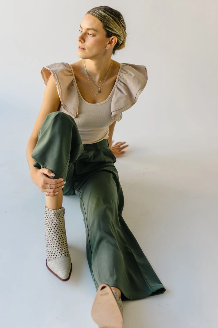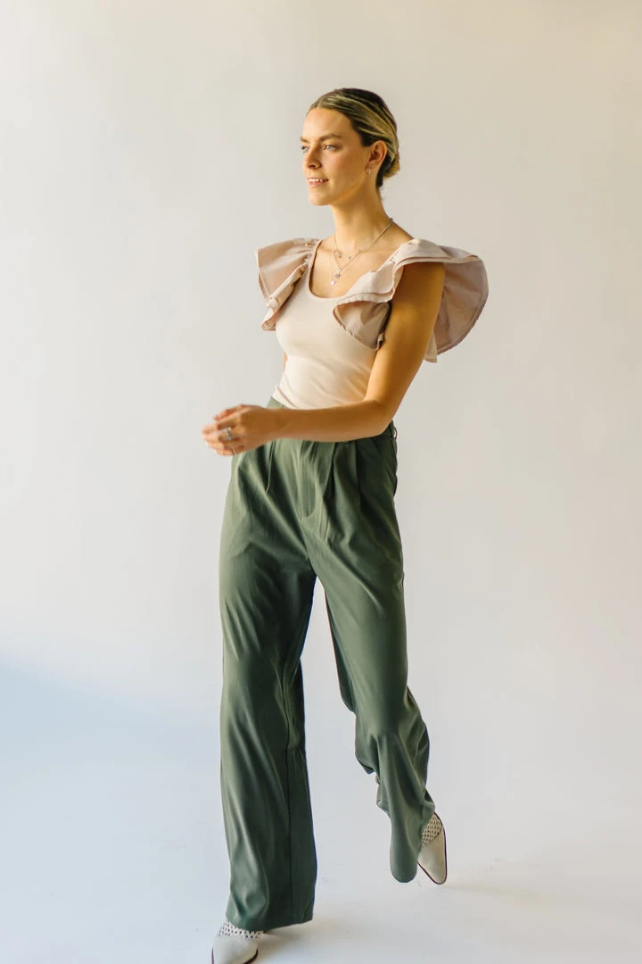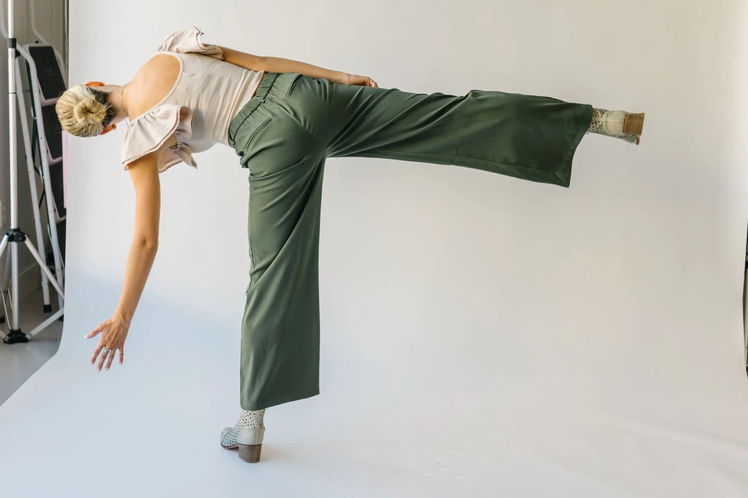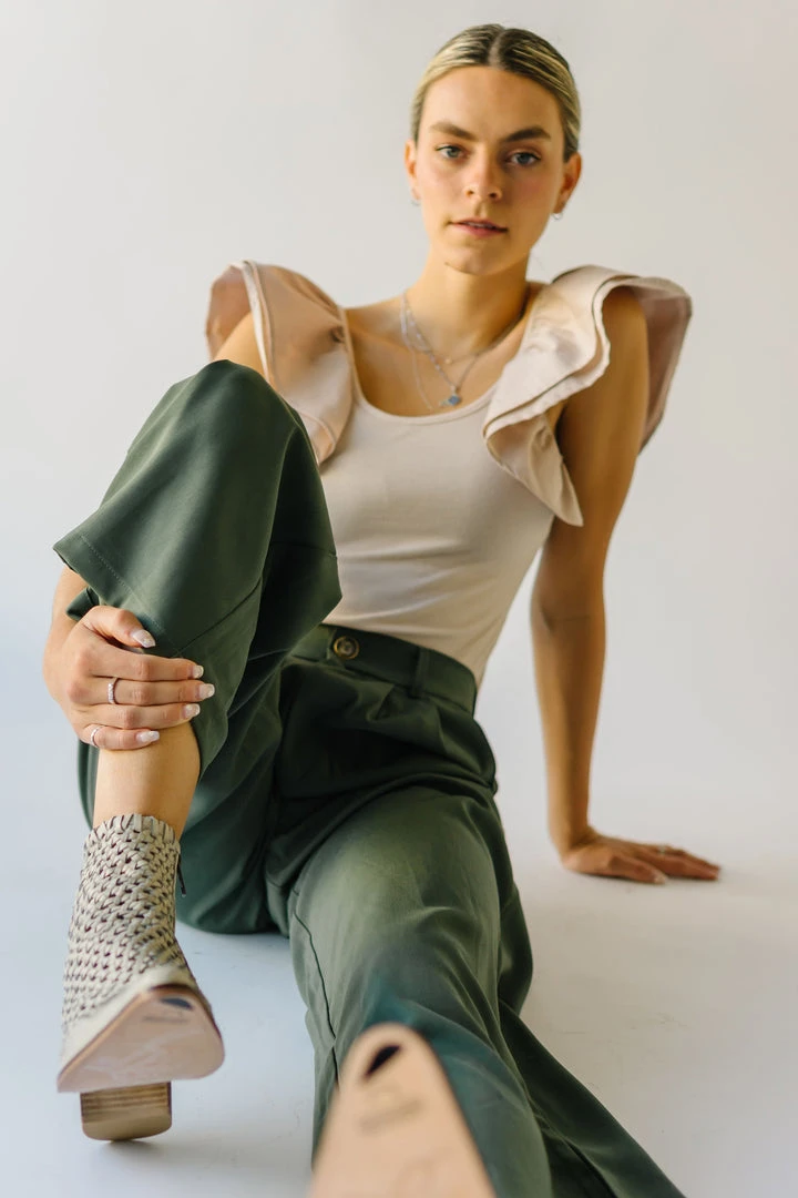 From school, to work, and wherever else you might have to go…the Jorah Pleated Trousers are IT. They have a higher waistline with a pleated front. They have an elastic band on the back of the waistline. They are a straight-leg style in a neutral olive color.Â
