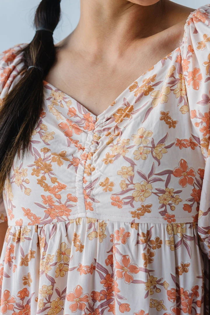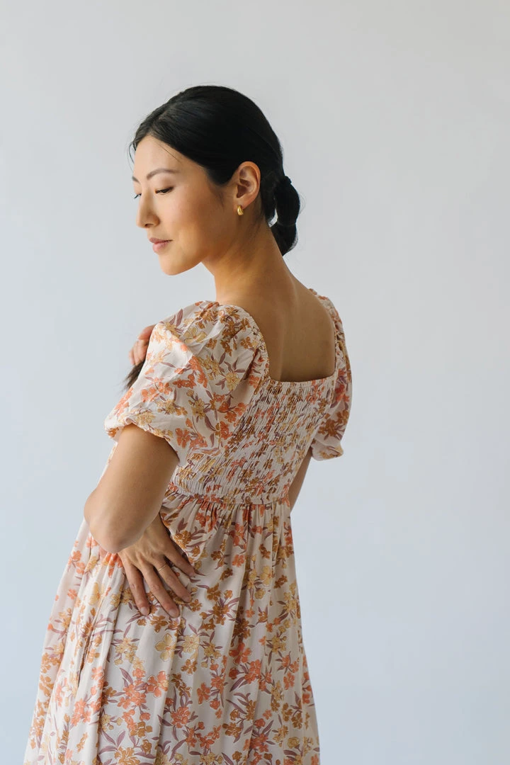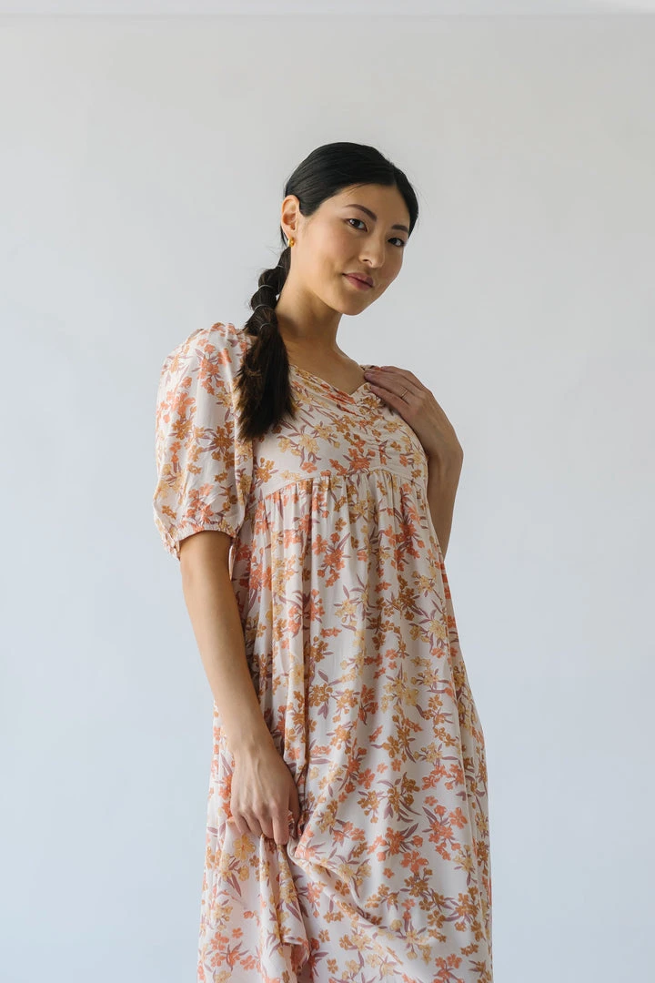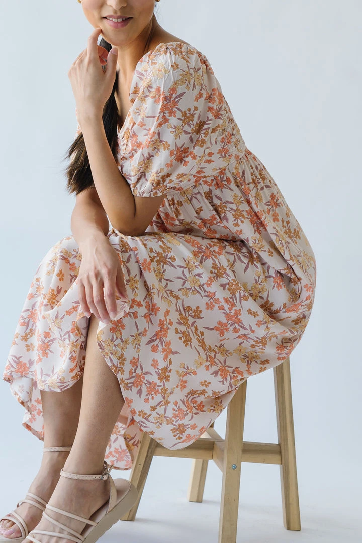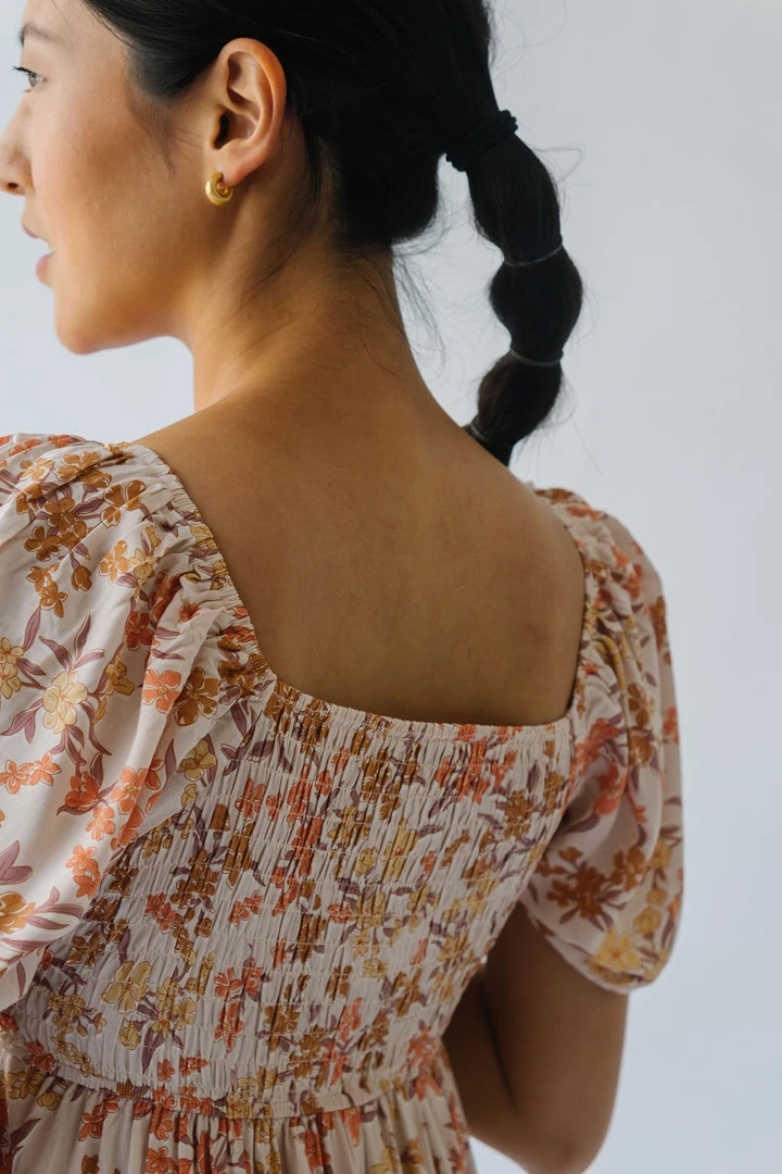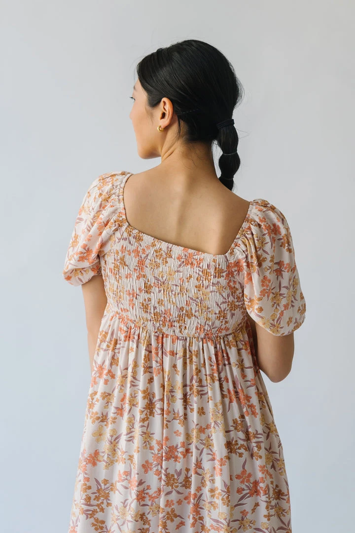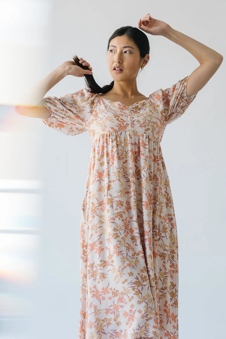 The Kepler Floral Midi Dress has a ruched neckline with a flexible smocked panel in the back. The empire waistline provides a flattering + flowy silhouette with a tiered skirt. It is maternity-friendly.