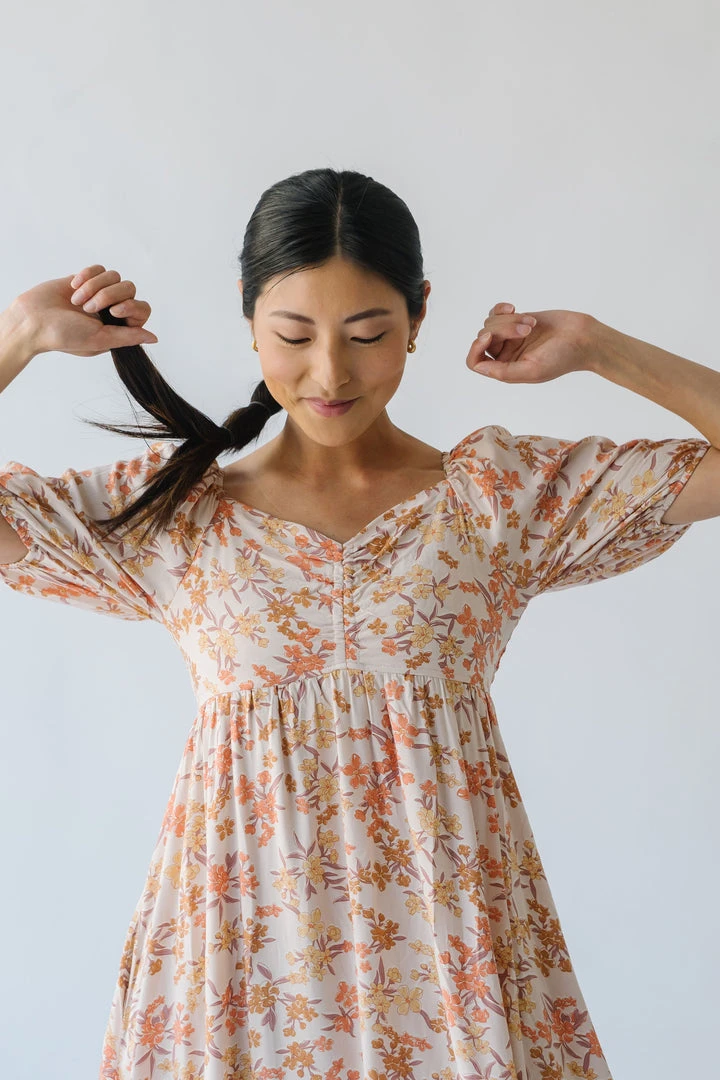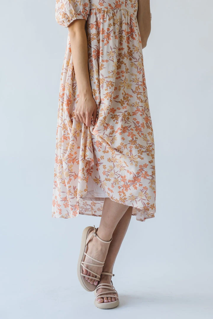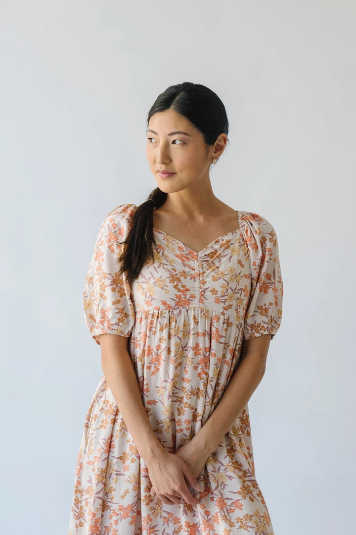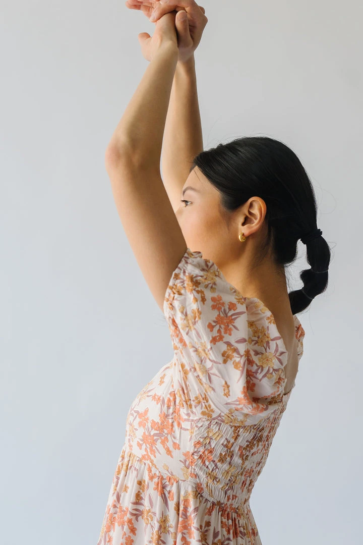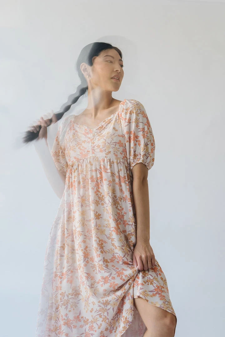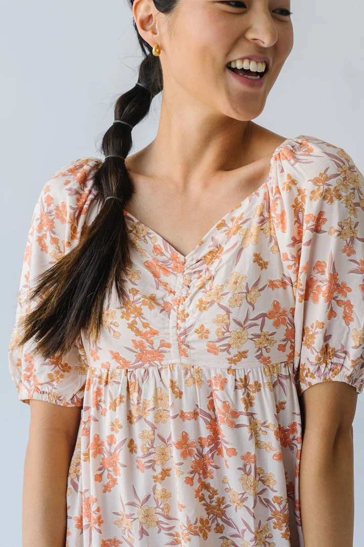 The Kepler Floral Midi Dress has a ruched neckline with a flexible smocked panel in the back. The empire waistline provides a flattering + flowy silhouette with a tiered skirt. It is maternity-friendly.
