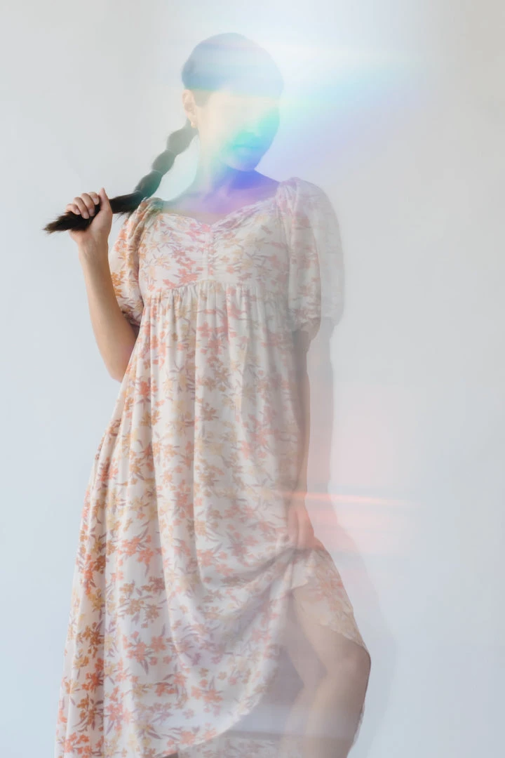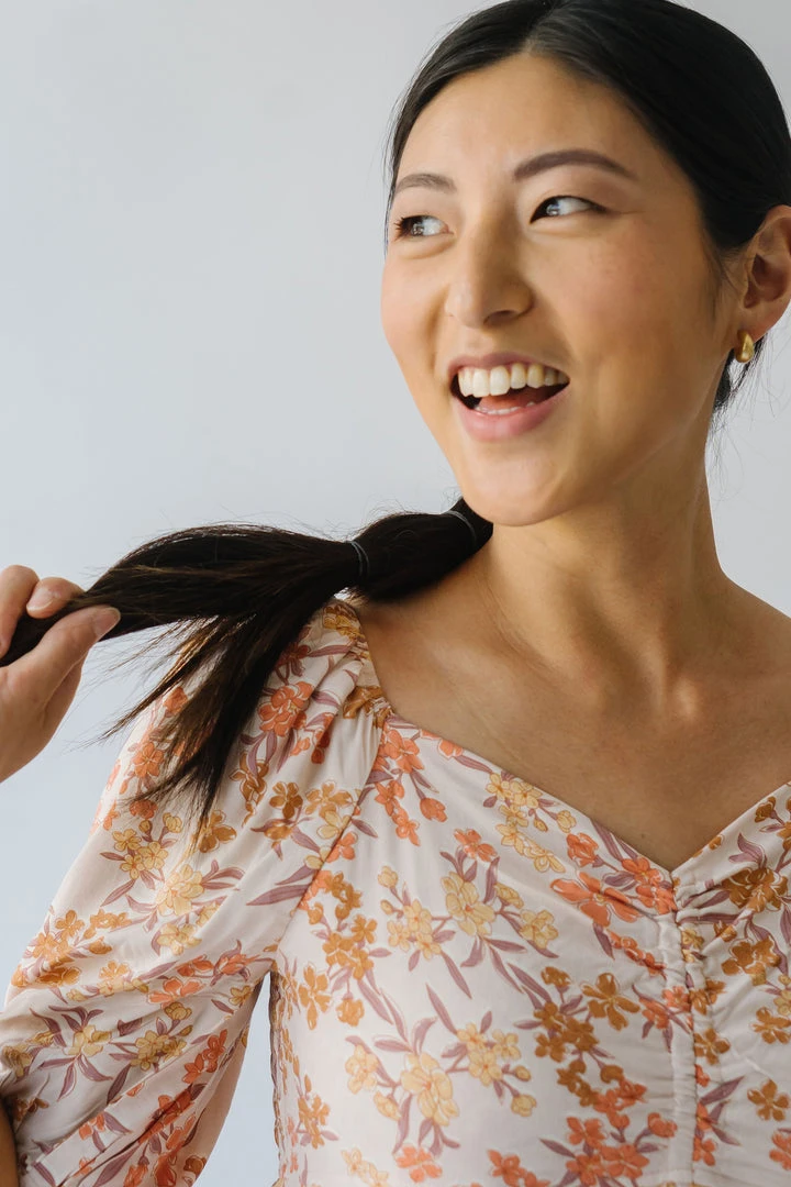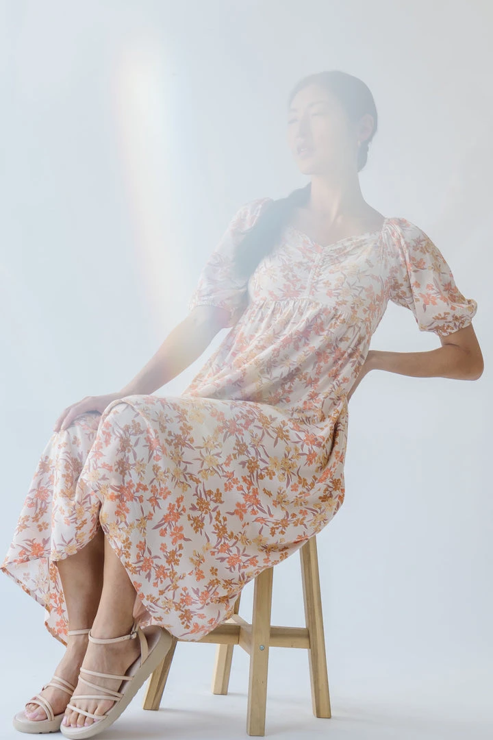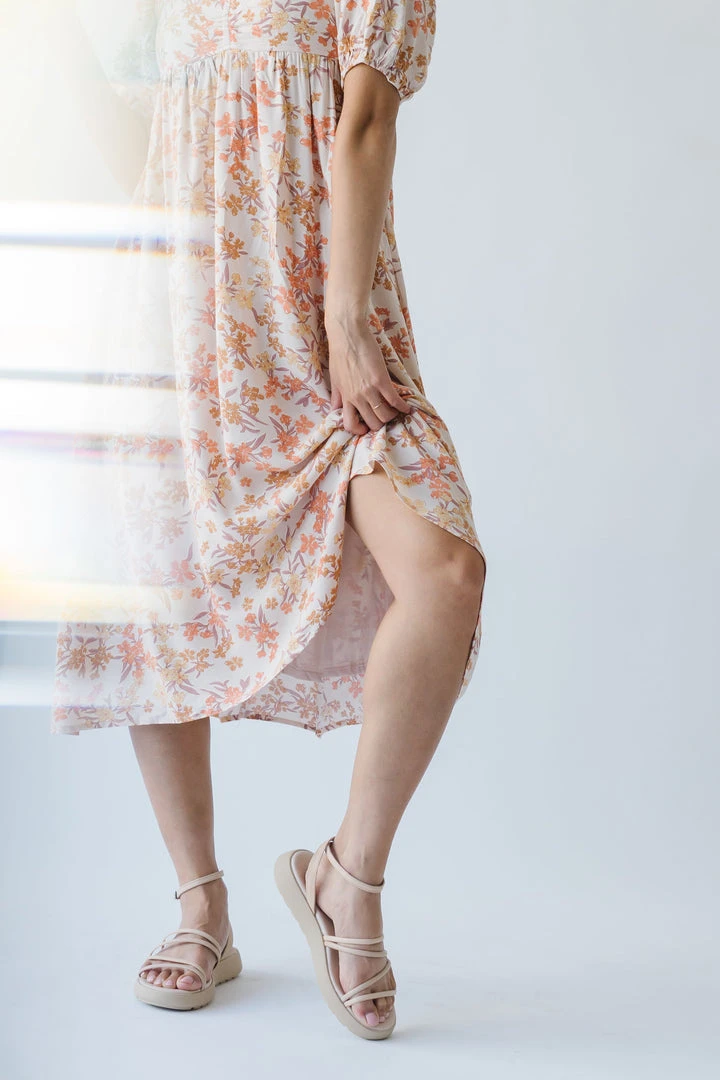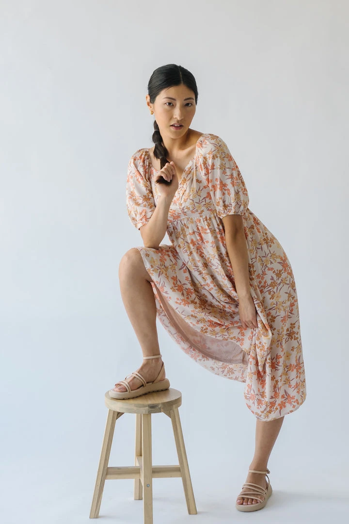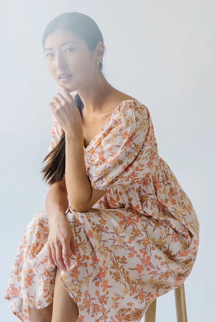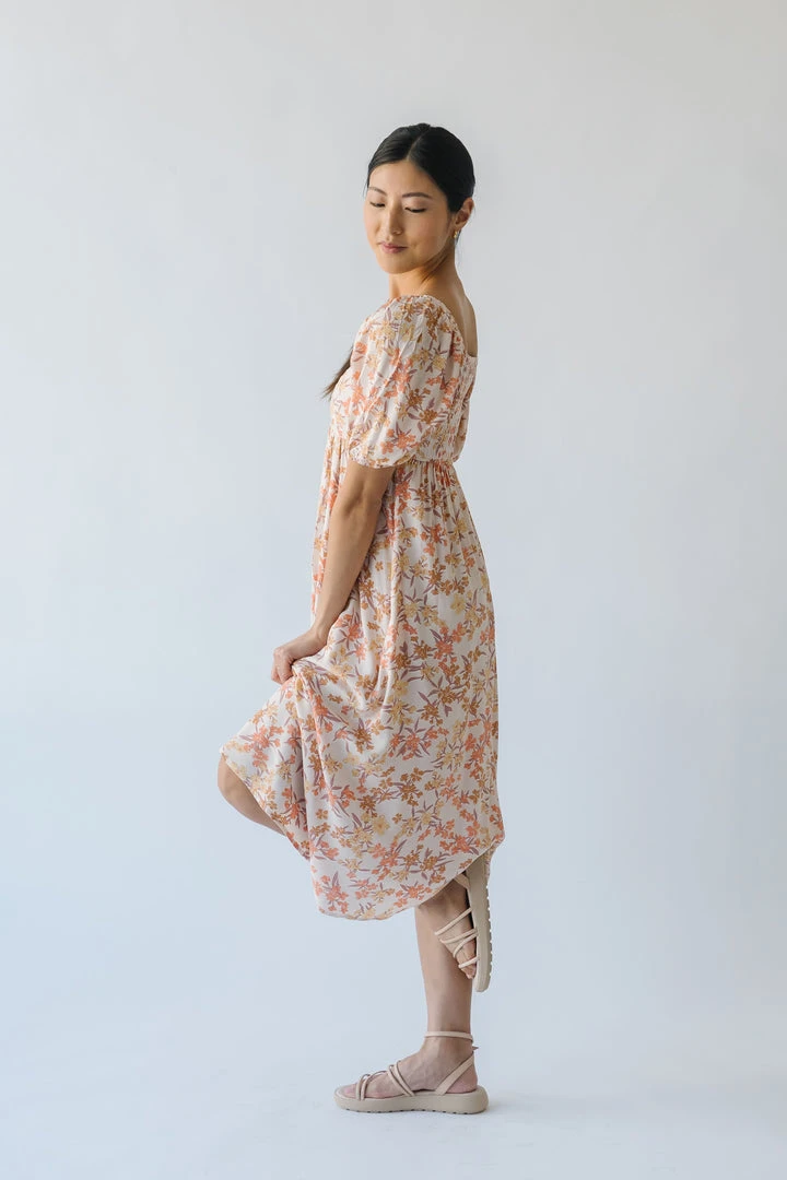 The Kepler Floral Midi Dress has a ruched neckline with a flexible smocked panel in the back. The empire waistline provides a flattering + flowy silhouette with a tiered skirt. It is maternity-friendly.