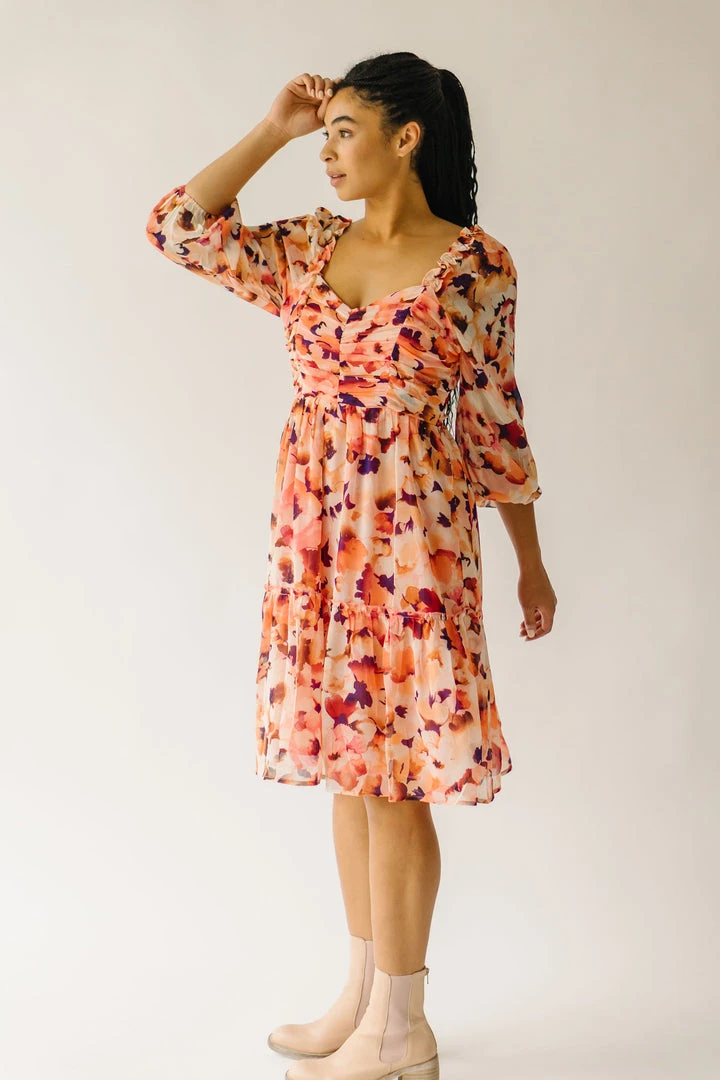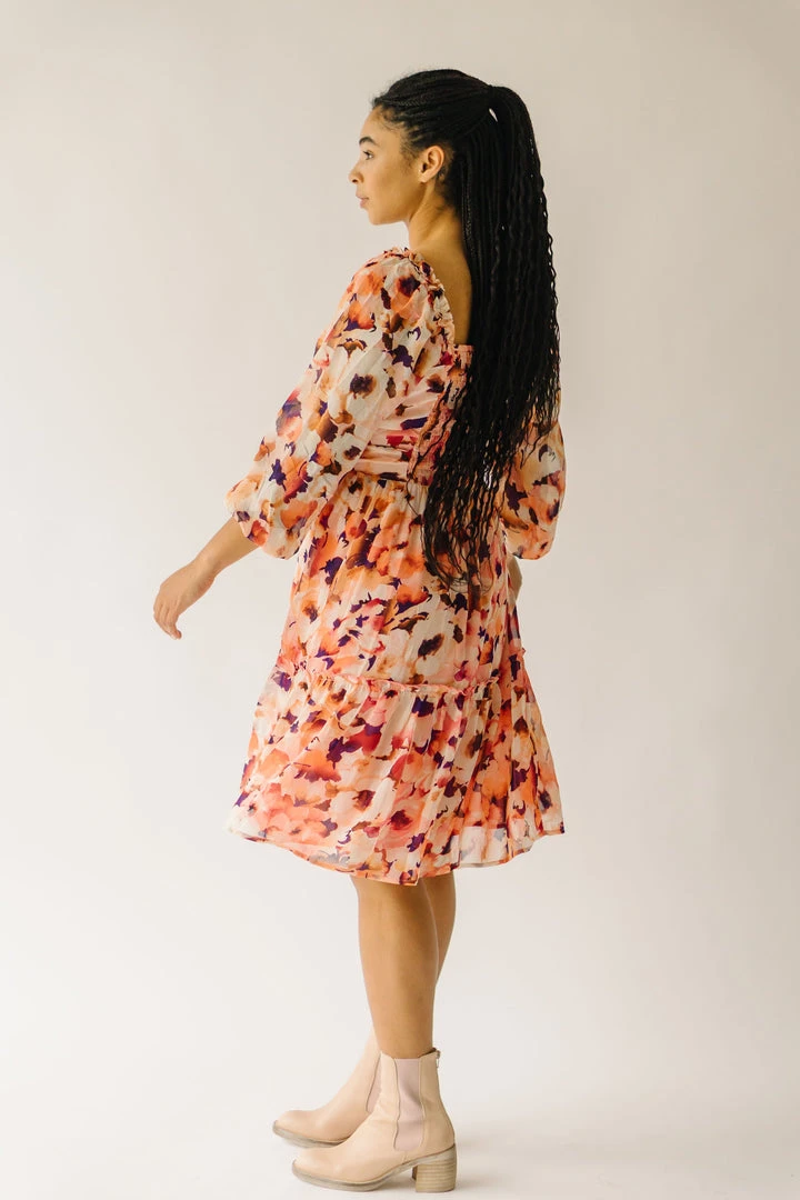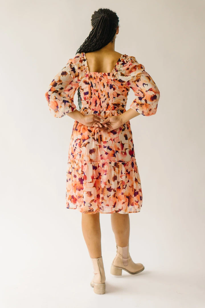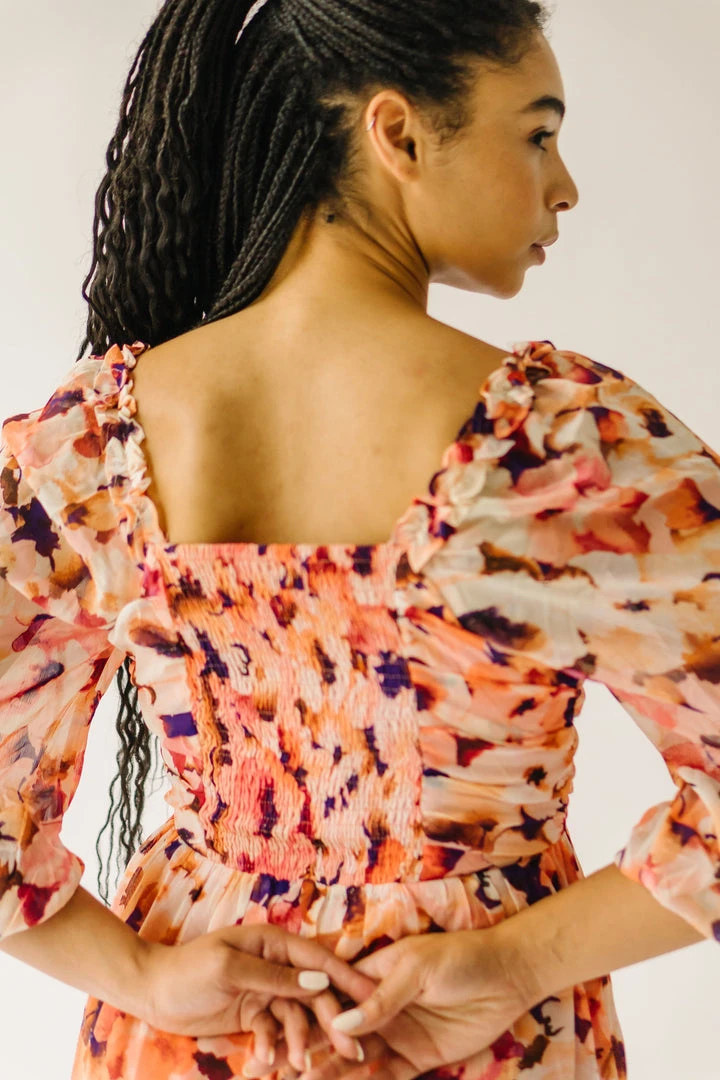 The Killpack Sweetheart Neckline Dress has a smocked panel in the back that makes it flexible + flattering. It has an artistic floral print with a sweetheart neckline, empire waistline, and hemline that hits around the knees.Â