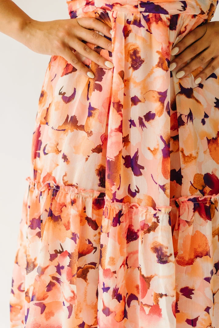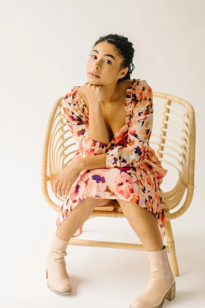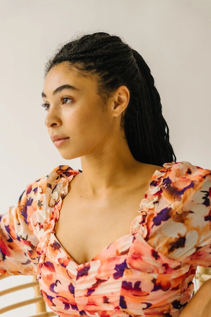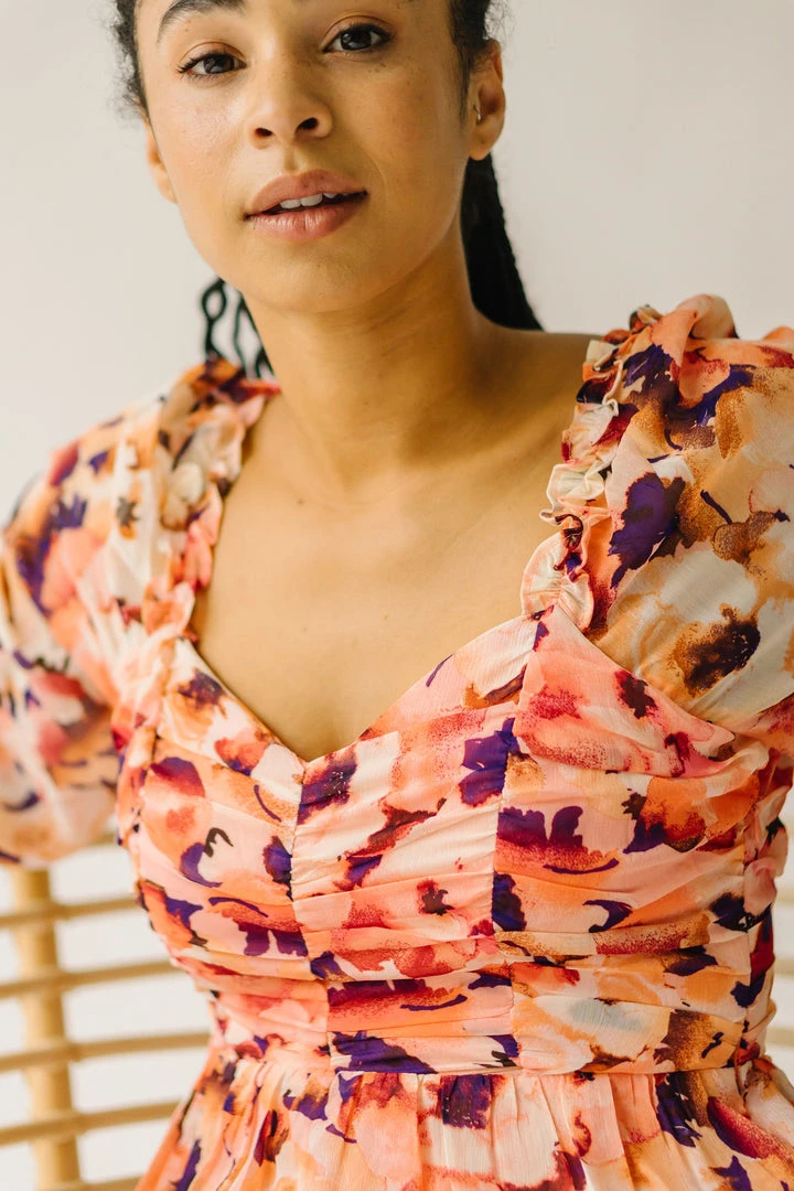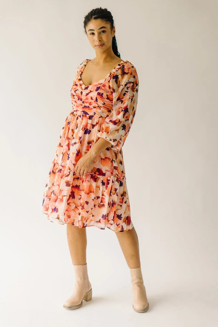 The Killpack Sweetheart Neckline Dress has a smocked panel in the back that makes it flexible + flattering. It has an artistic floral print with a sweetheart neckline, empire waistline, and hemline that hits around the knees.Â