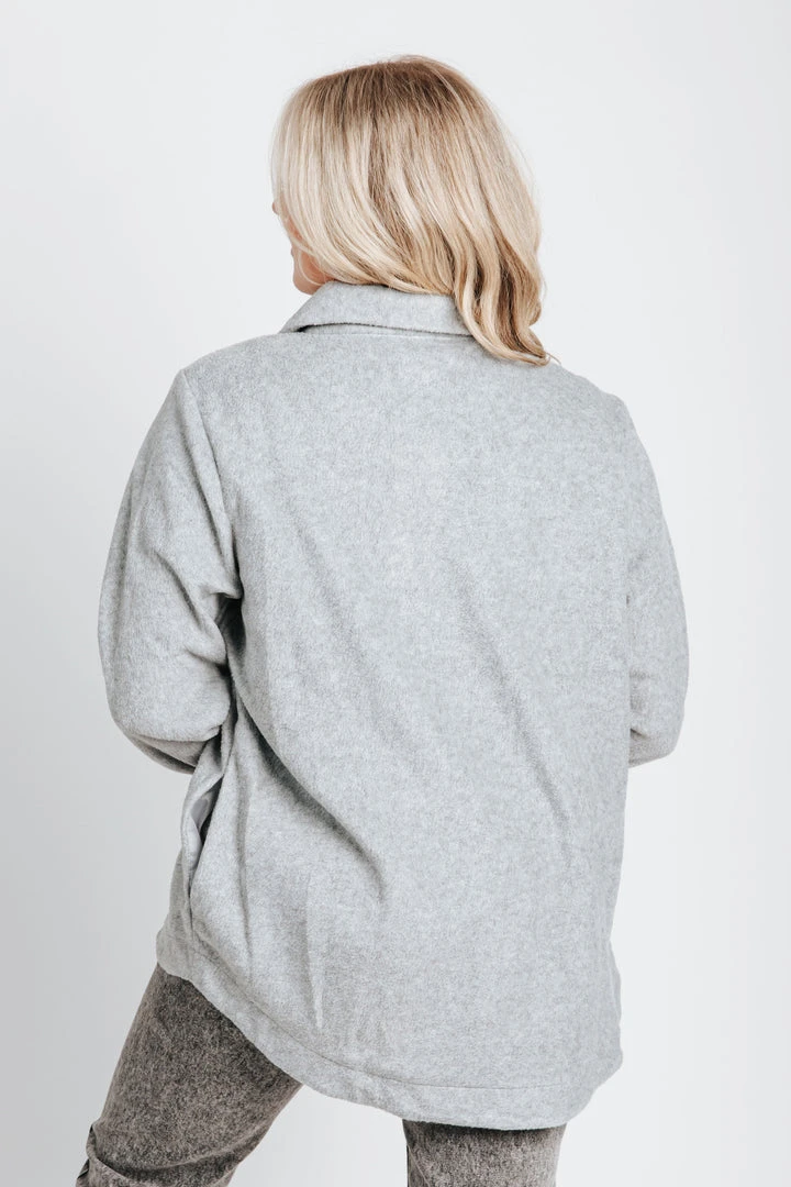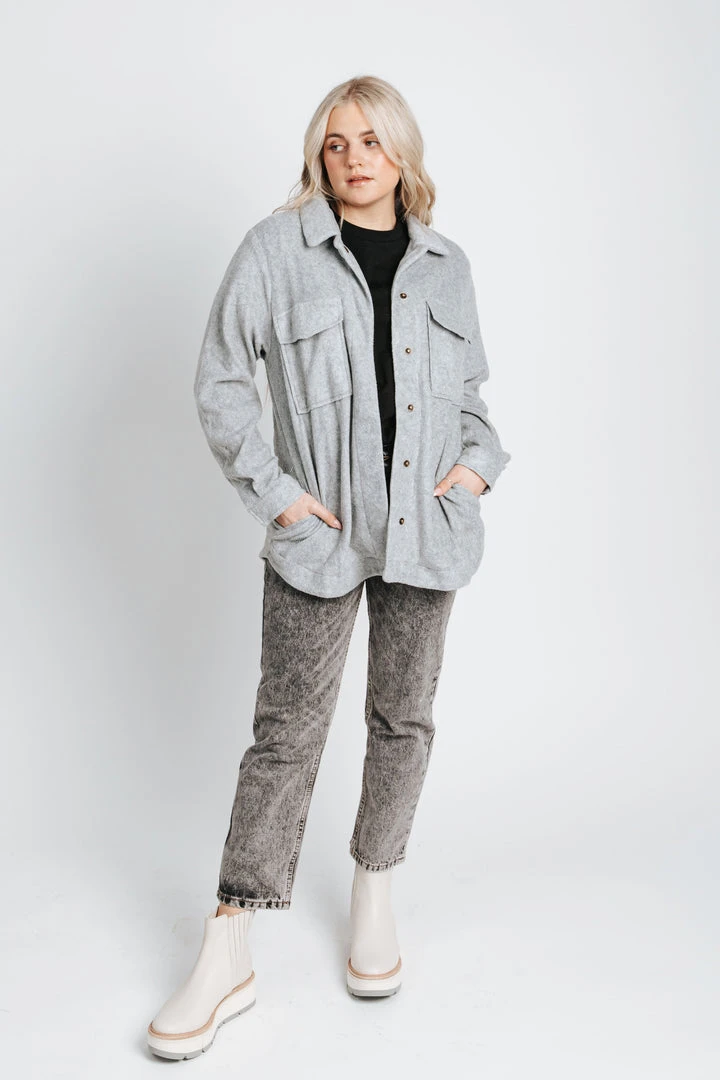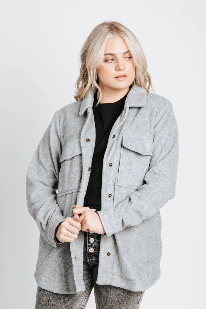 The Kirby Shacket will keep you cozy + warm. It is grey with front pockets, hidden side pockets, and an oversized fit. It has a collar + snap closures down the front.Â