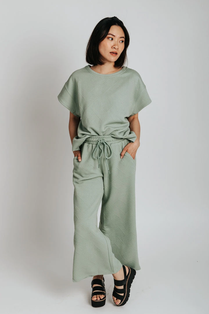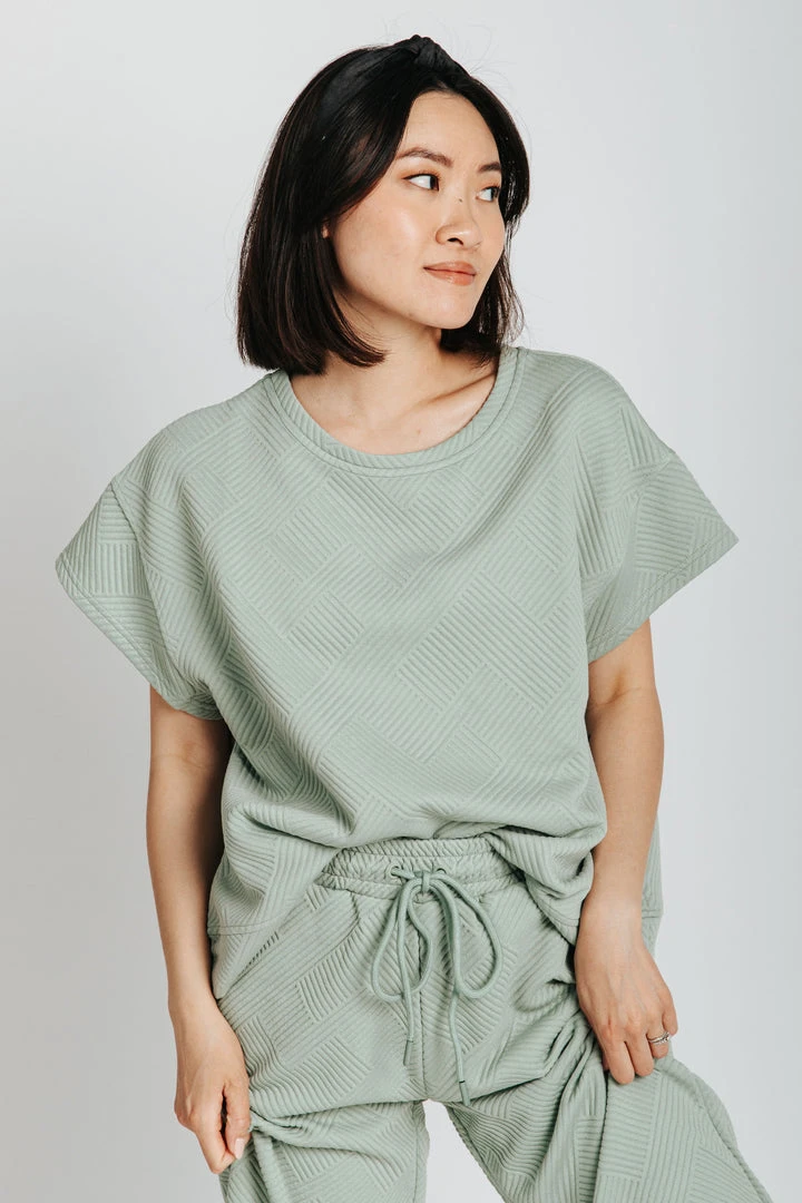 The Lenny Textured Top is comfy, cute, and a must-have for ALL the things. It has a relaxed fit + can be worn year-round. It is luxe leisurewear that comes in multiple colors + can be paired with The Ronnie Textured Wide Leg Pants to make it a set.Â