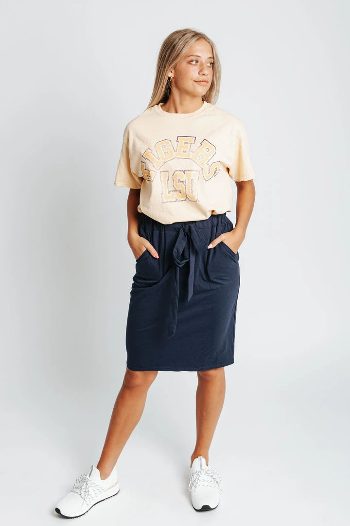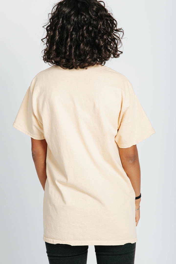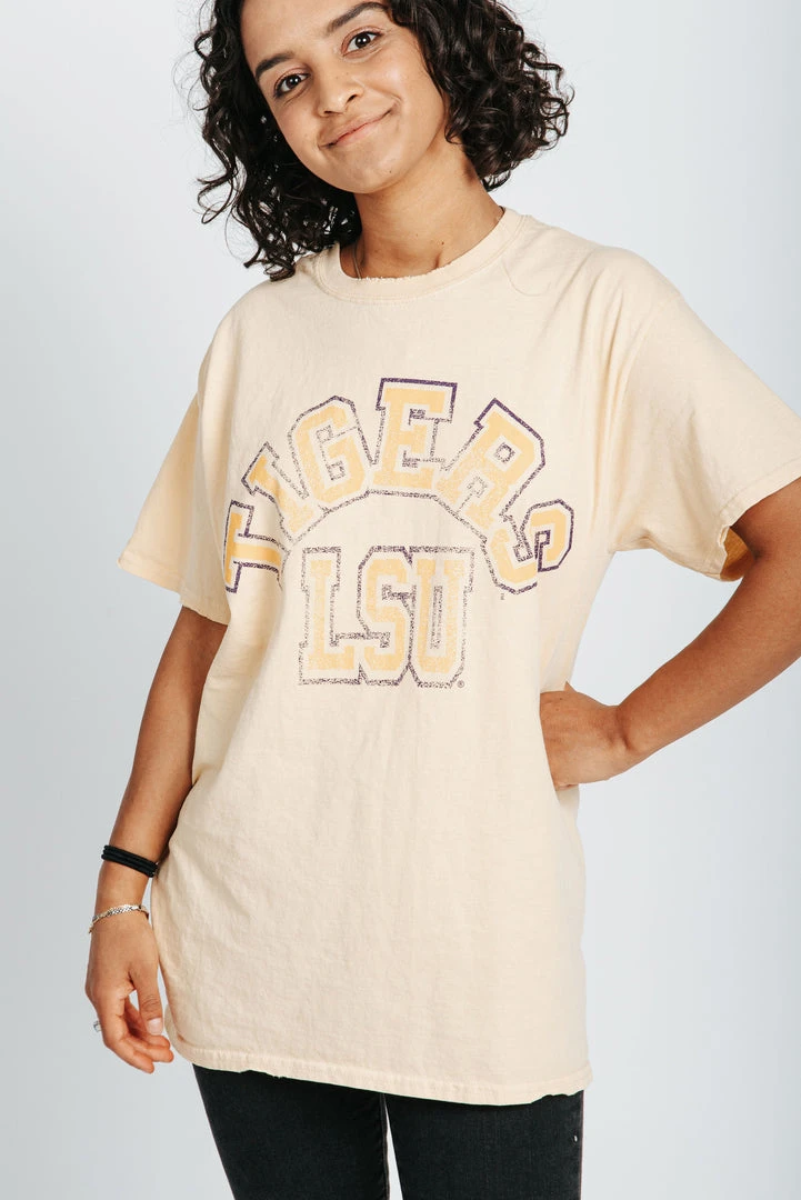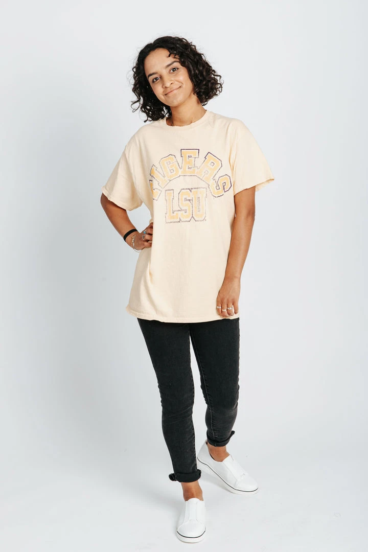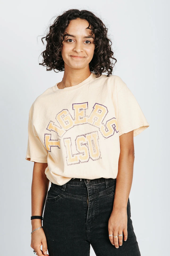 Bring the school spirit with The LSU Vintage Tee. This throwback tee is a pale yellow with a faded graphic to make it feel aged to perfection. It has a loose + longer fit.Â