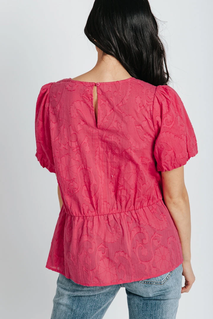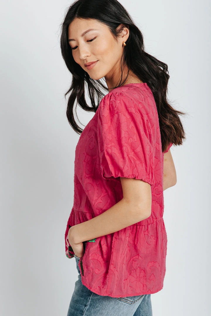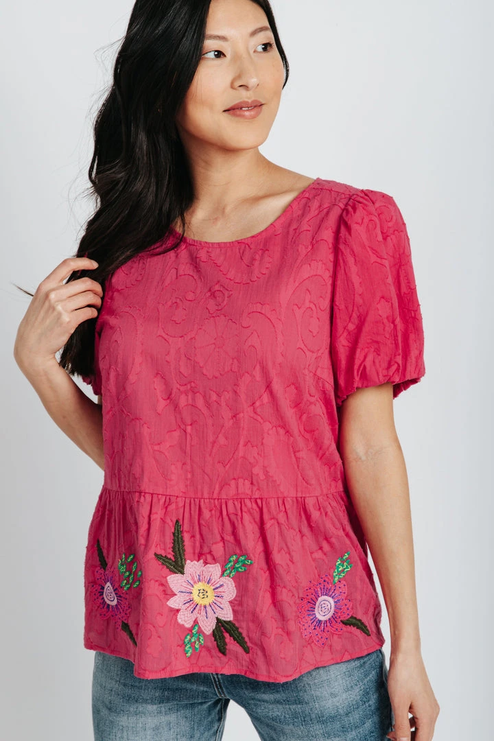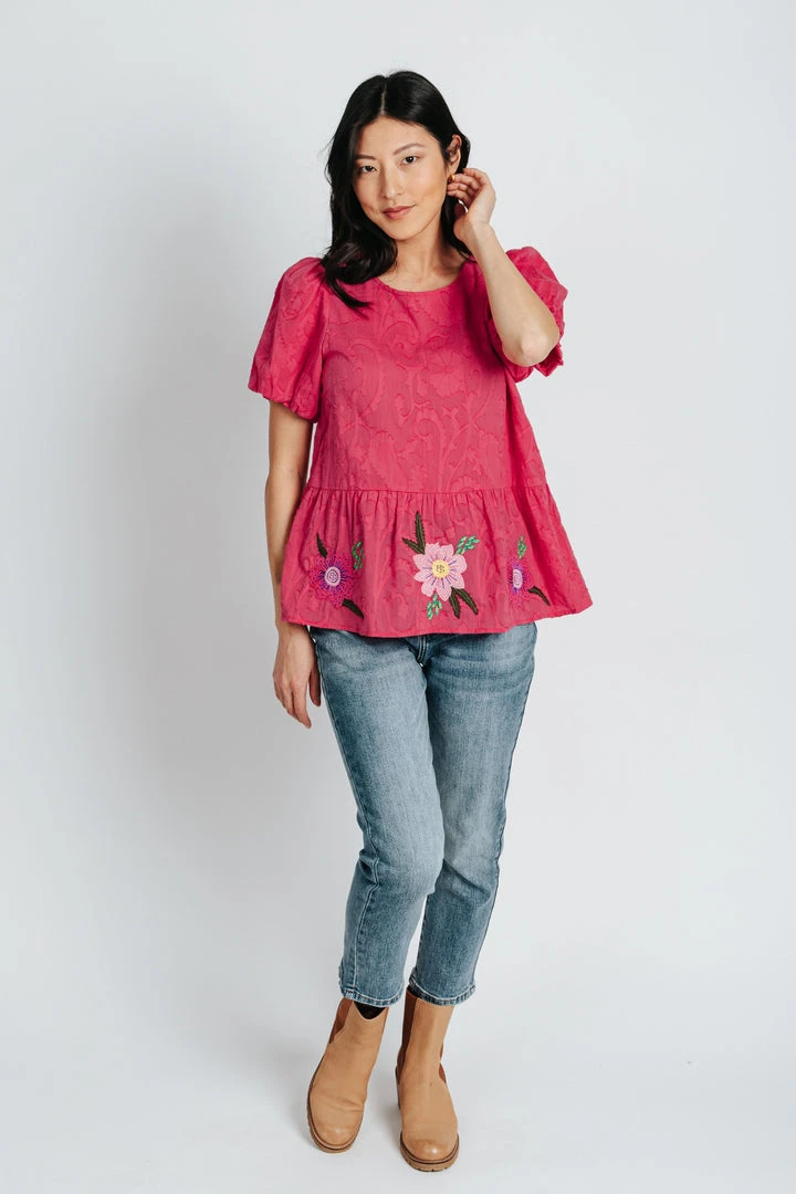 Spring has sprung with this floral + colorful blouse. It is a textured pink peplum with floral embroidery on the hemline. It has a traditional length + fit.