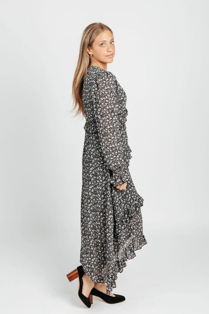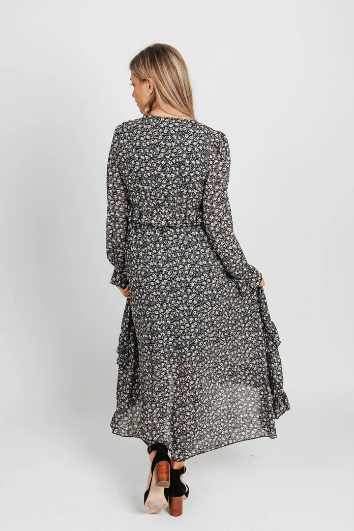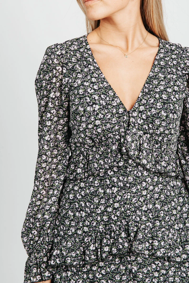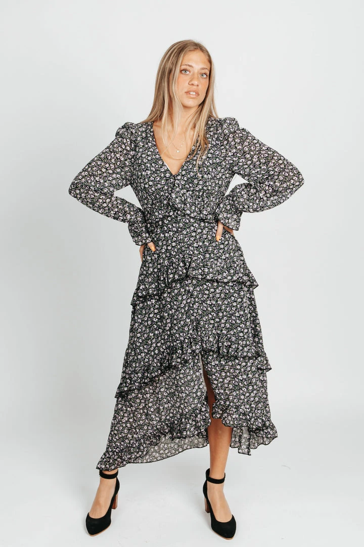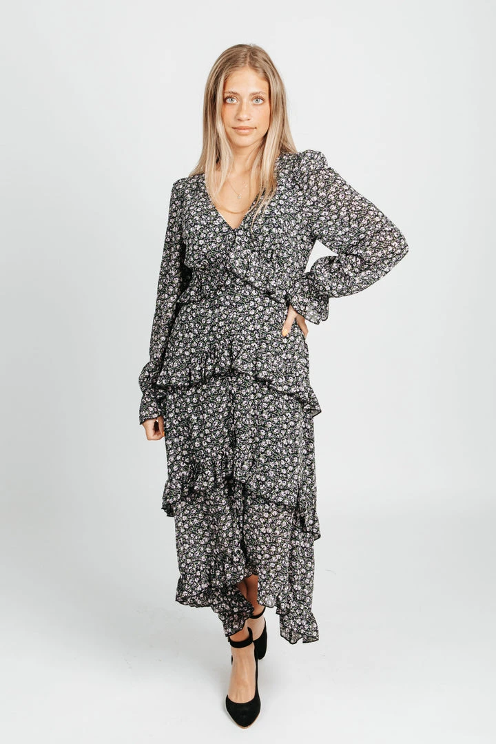 The right way to ruffle. The Madsen Floral Ruffle Detail Dress is black with a small-scale floral print. It has a v-neckline, long sleeves, a flexible waistline, and a tiered skirt with a hi-low hemline. The ruffles add texture + movement.