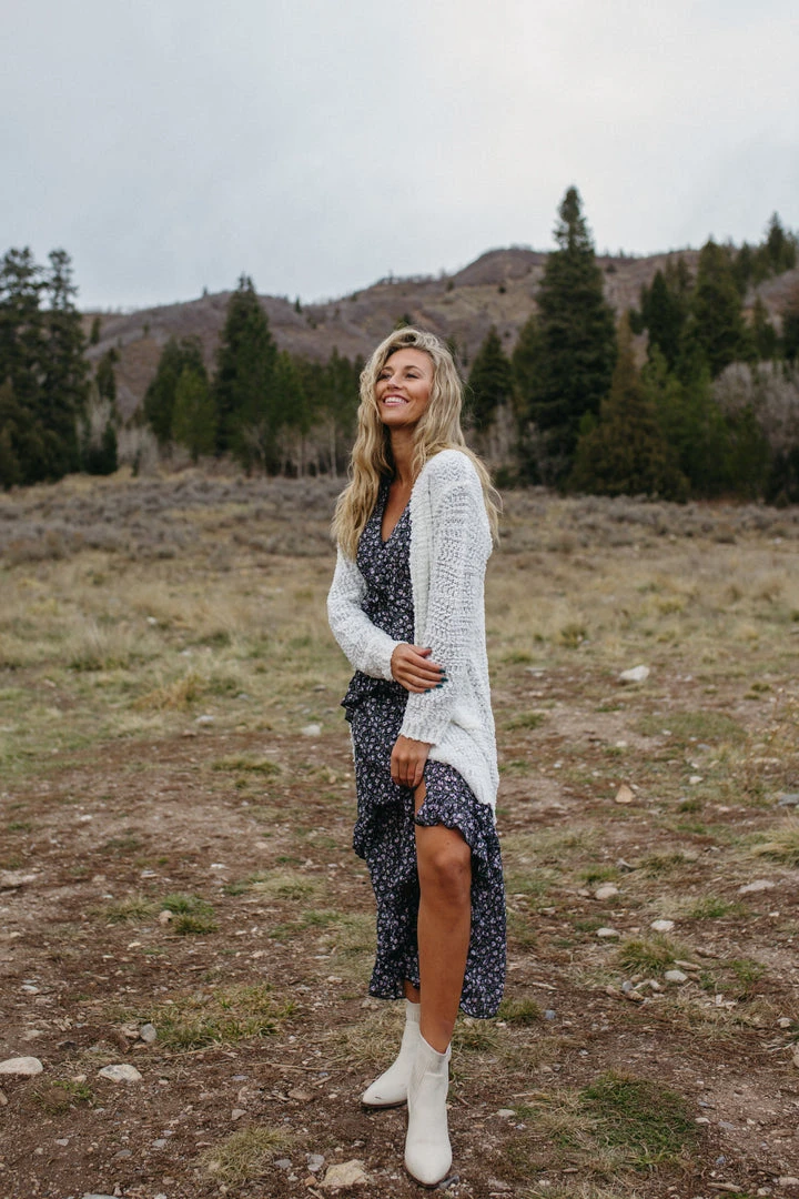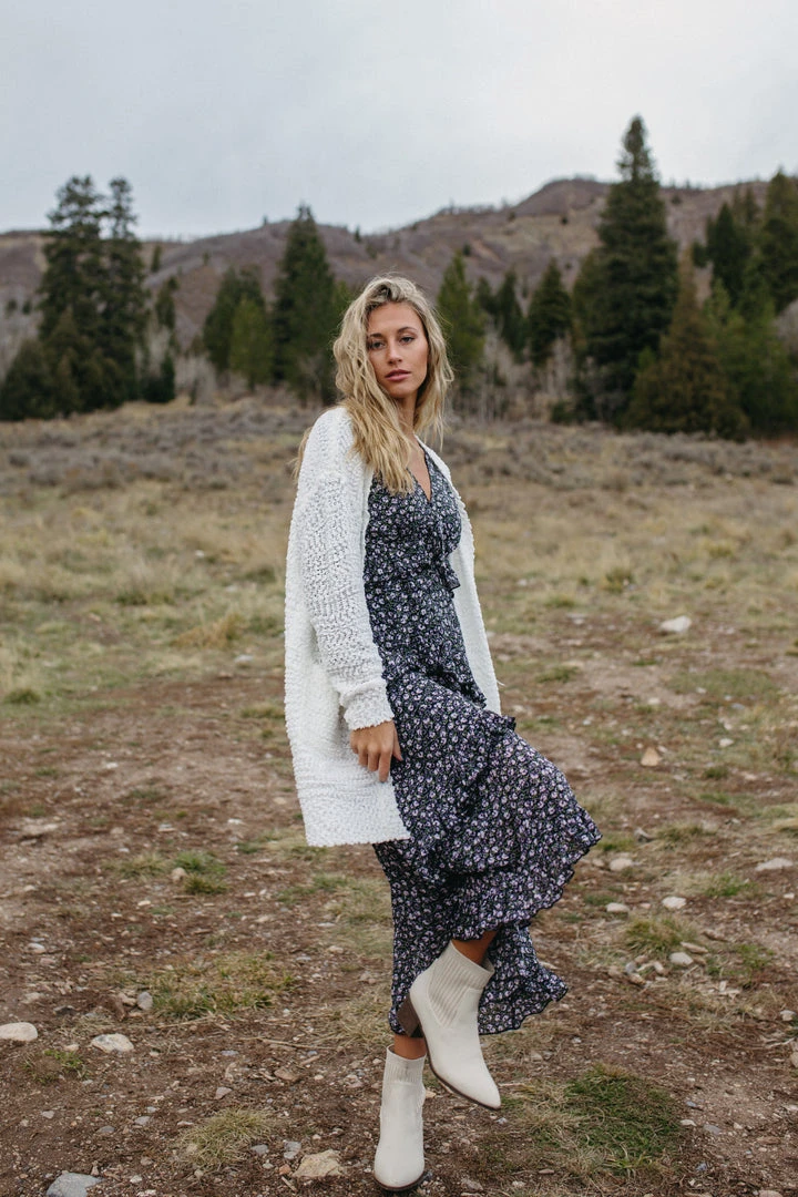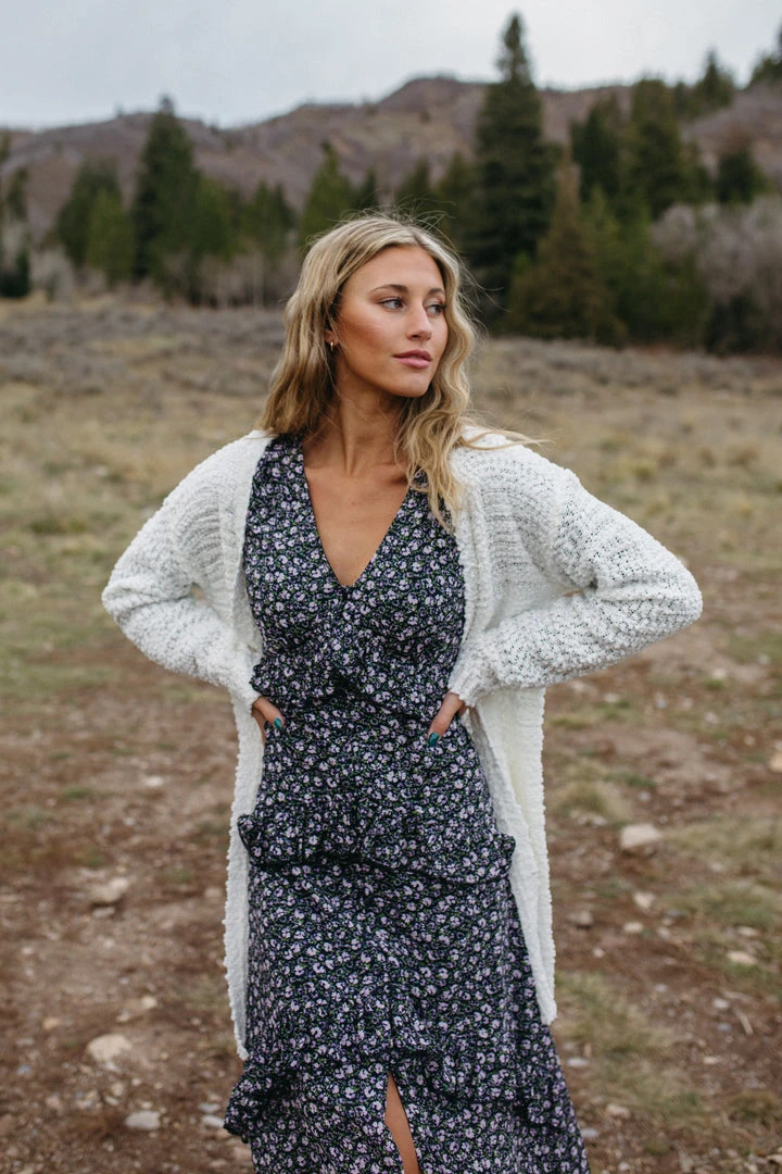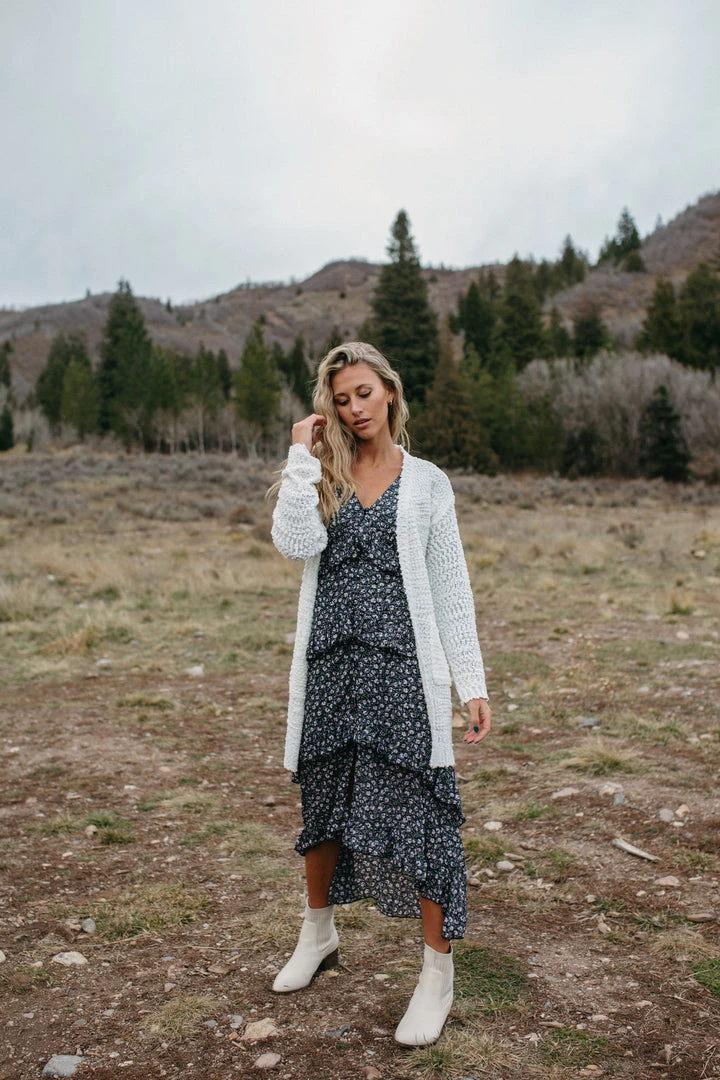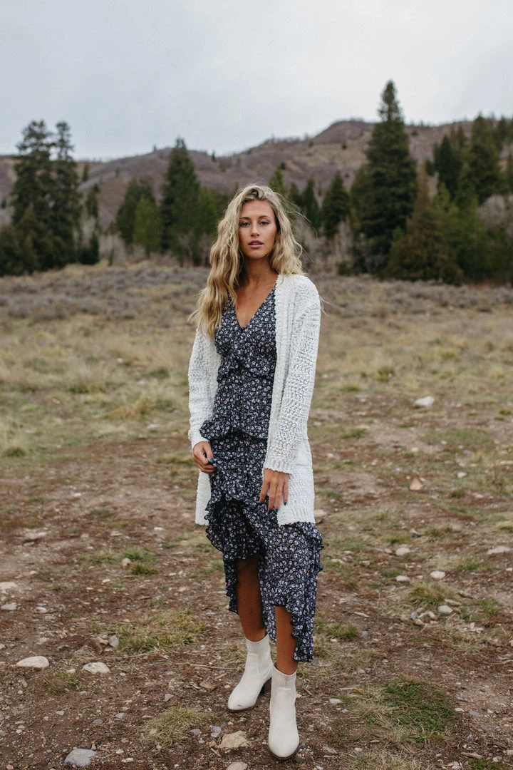 The right way to ruffle. The Madsen Floral Ruffle Detail Dress is black with a small-scale floral print. It has a v-neckline, long sleeves, a flexible waistline, and a tiered skirt with a hi-low hemline. The ruffles add texture + movement.