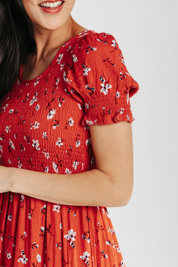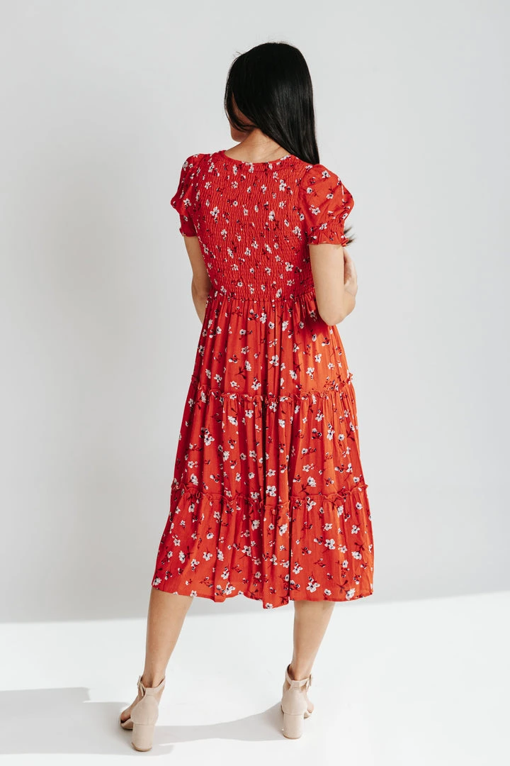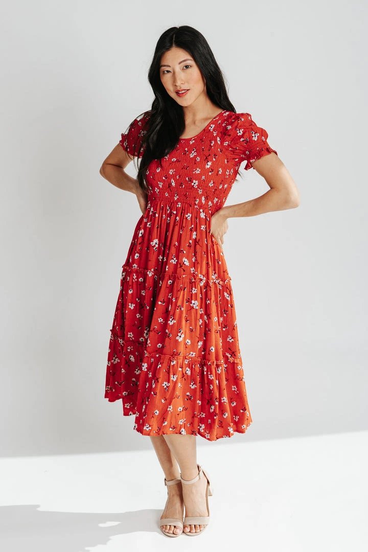 The McCall Floral Dress bodice has smocked puff short sleeves with a smocked back. It has a tiered + ruffled skirt. The floral print in french blue feels fresh + feminine.ย
