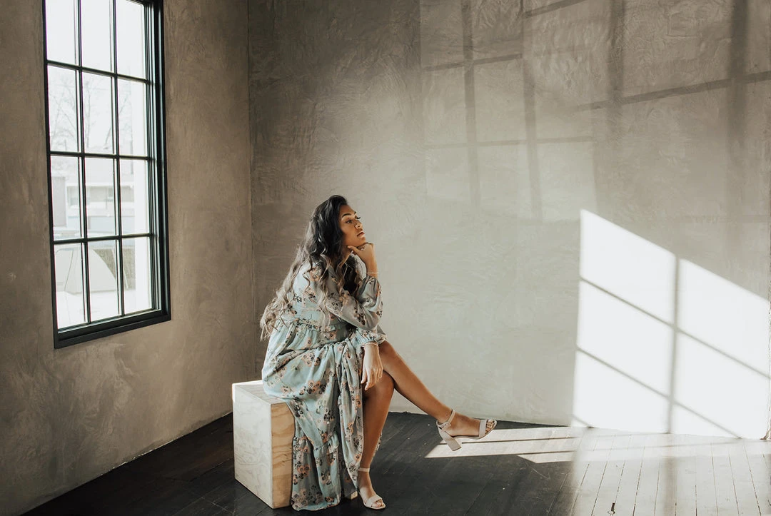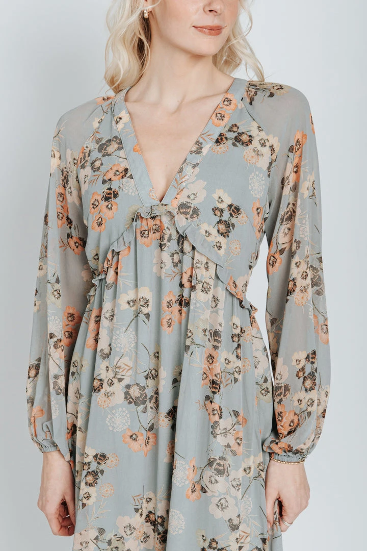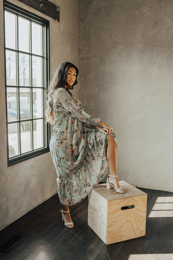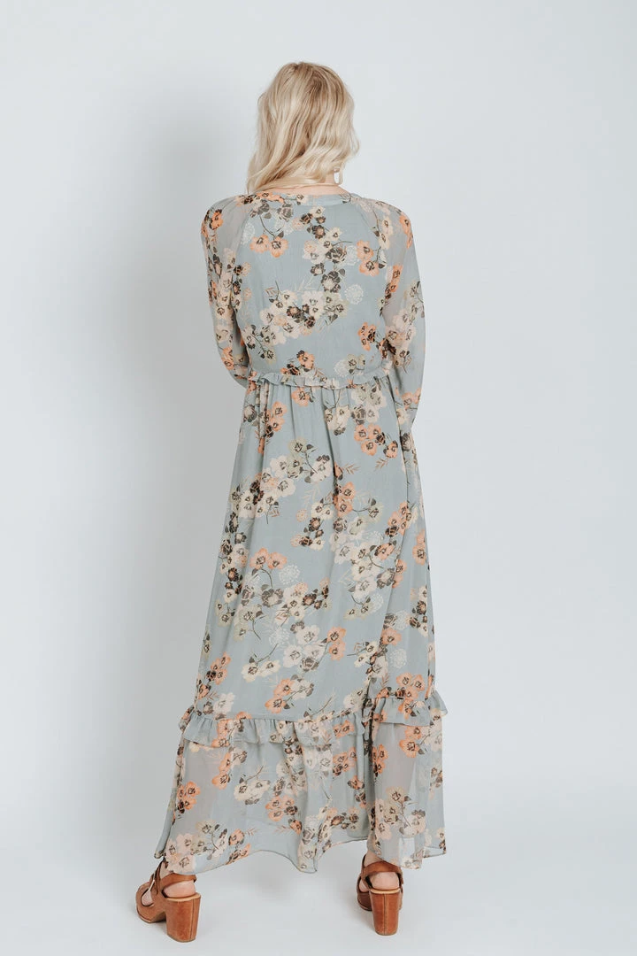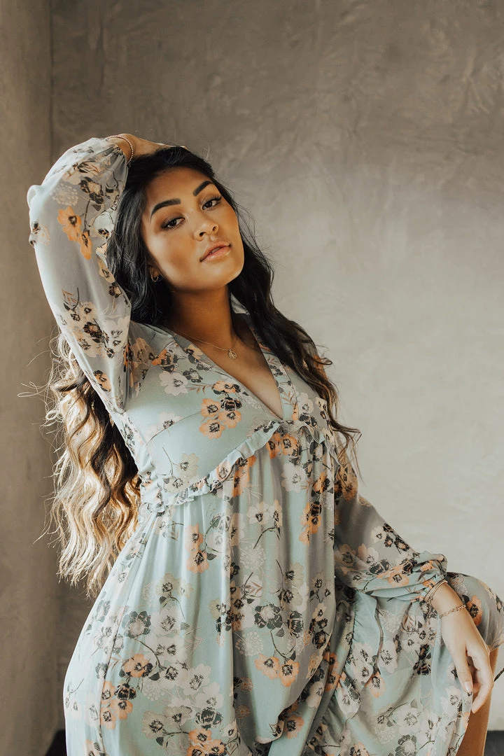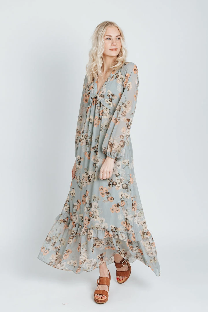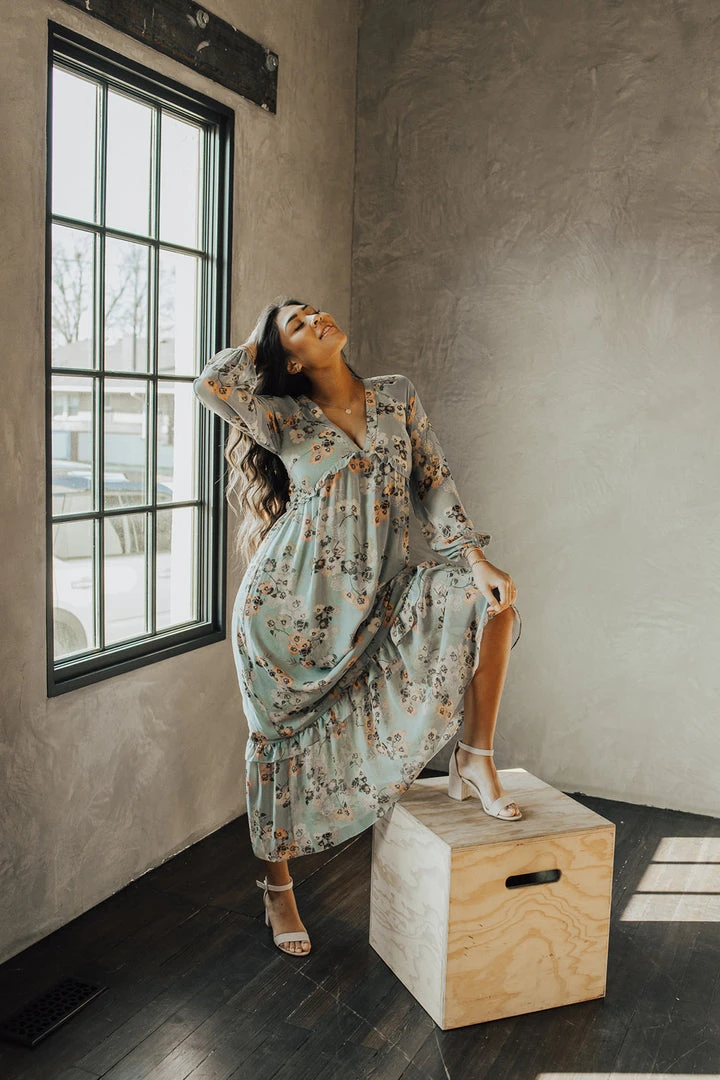 The Moulton Floral Maxi Dress has dusty hues with a feminine floral print. It has a v-neckline with a ruffled empire waistline. It has sheer long sleeves with elastic cuffs. It has a maxi length with a ruffled hemline. It is lined through the bodice + skirt.Â