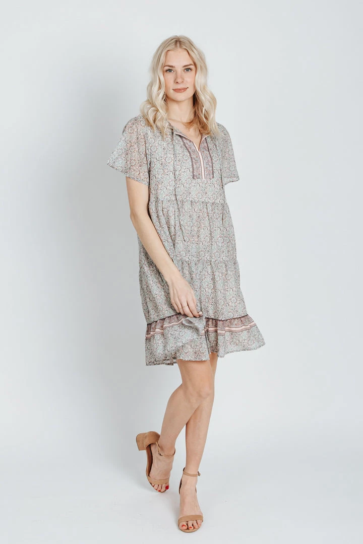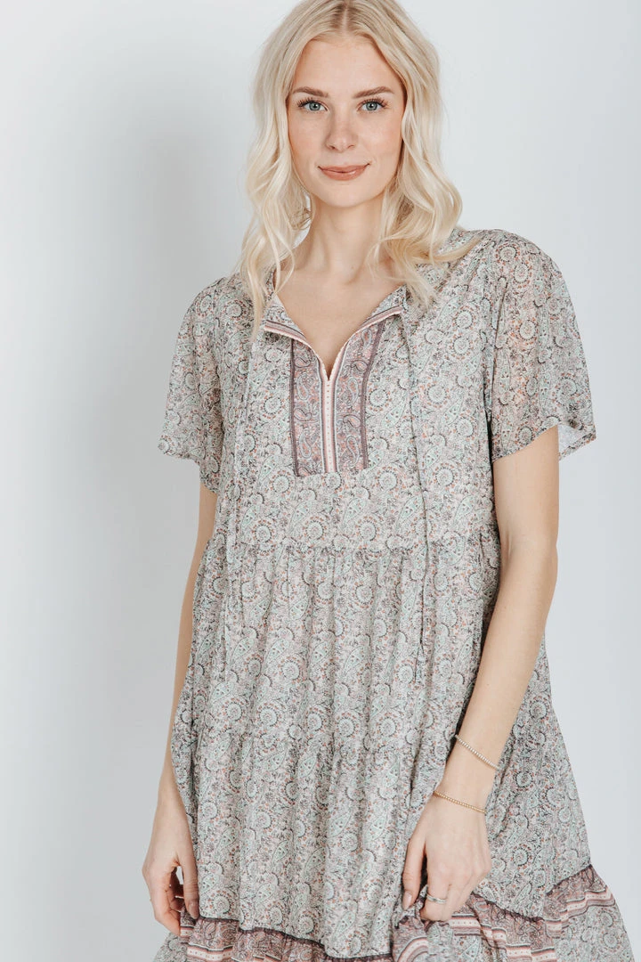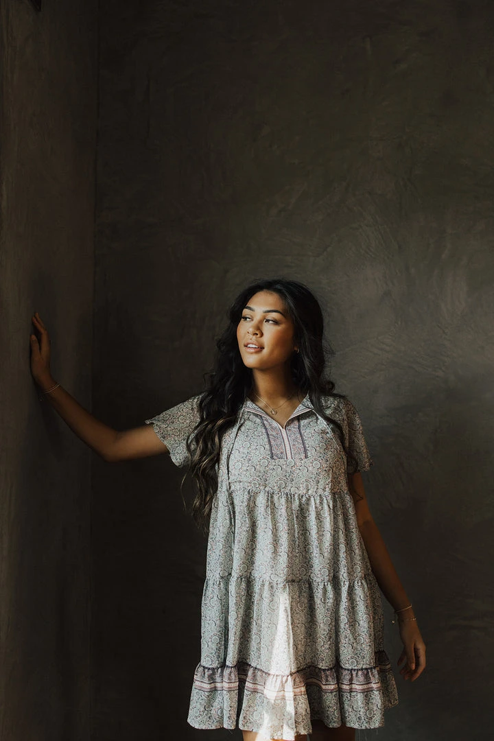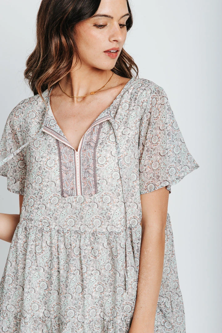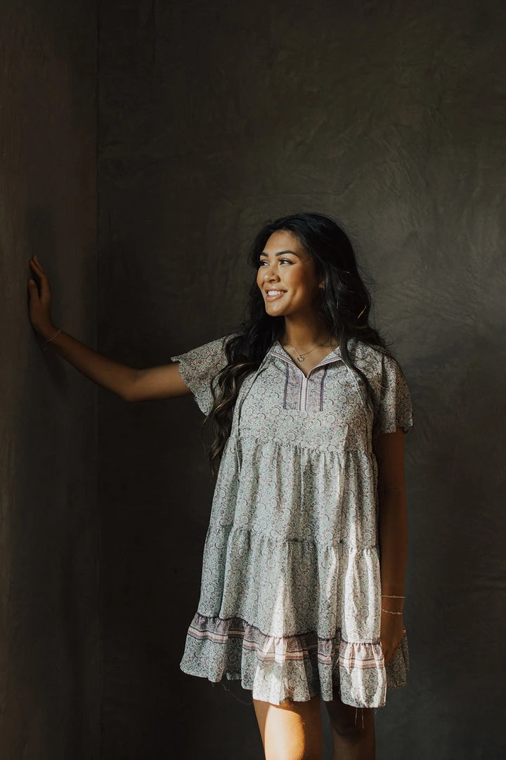 Short + sweet. The Musgraves Paisley Dress is a shorter style with a structured empire waistline. It has ties at the neckline with a tiered skirt. The paisley print is paired perfectly with a contrasting color in the same paisley print. It is lined.Â