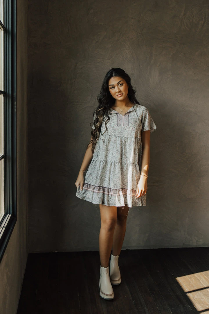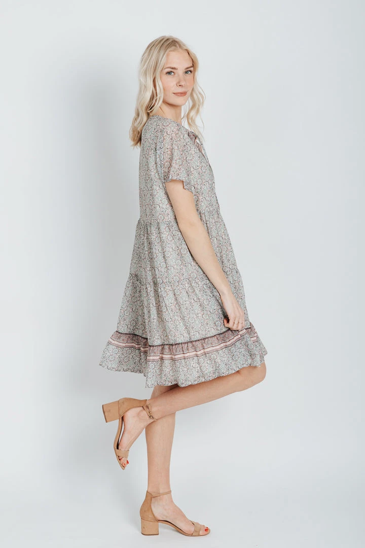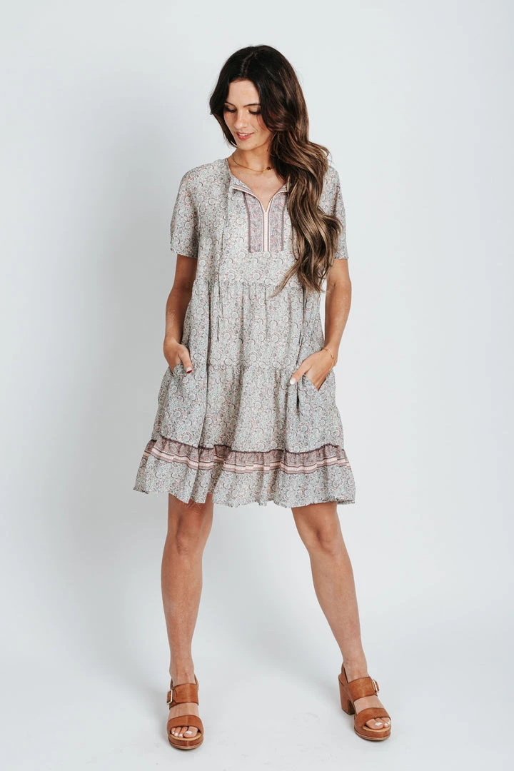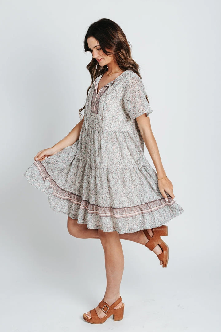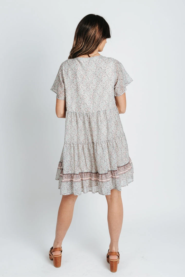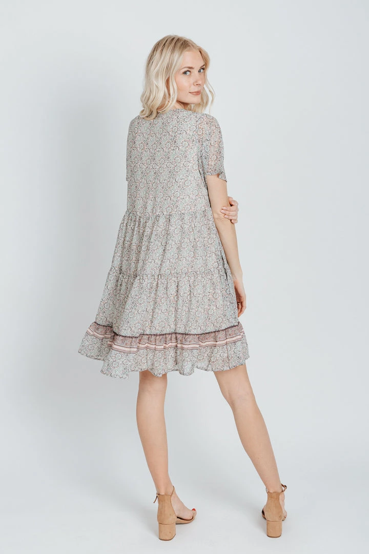 Short + sweet. The Musgraves Paisley Dress is a shorter style with a structured empire waistline. It has ties at the neckline with a tiered skirt. The paisley print is paired perfectly with a contrasting color in the same paisley print. It is lined.Â