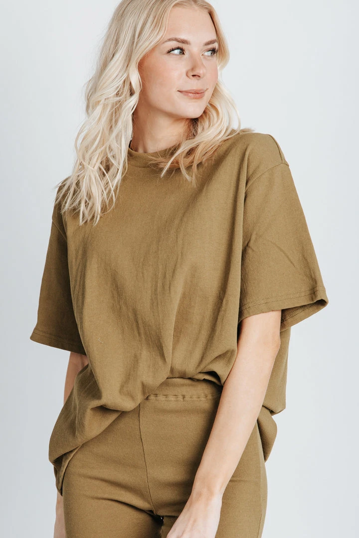 The Niall Oversized Tee is an earthy green that is trendy + timeless. It is made from thick + breathable cotton + has an oversized fit. Mix + match them with The Horan Biker Shorts.