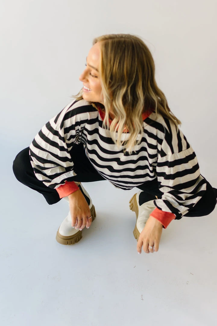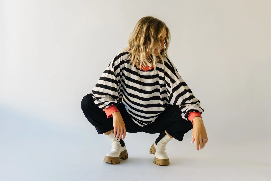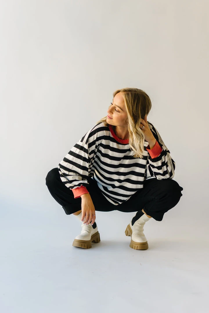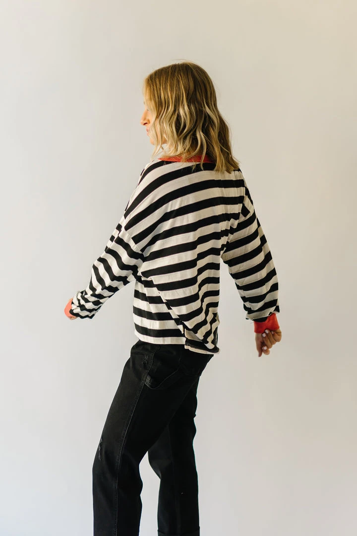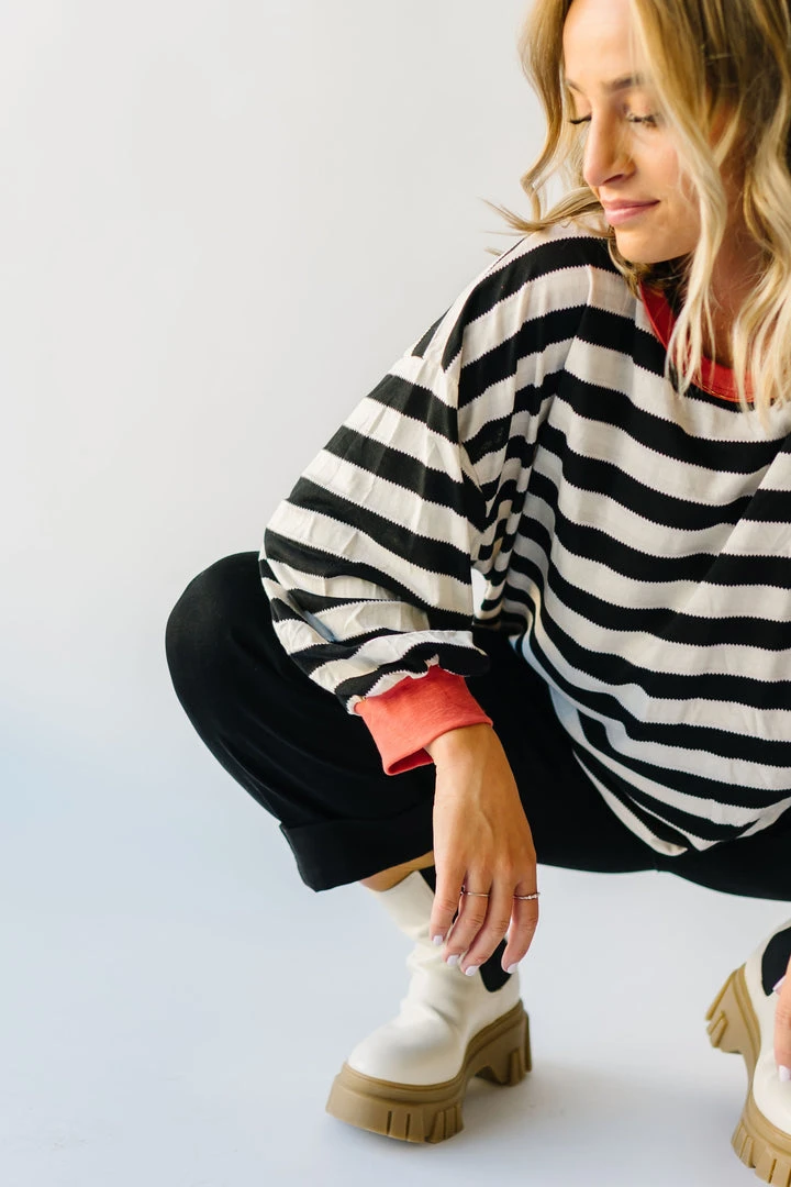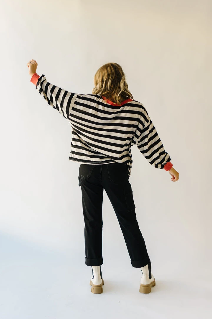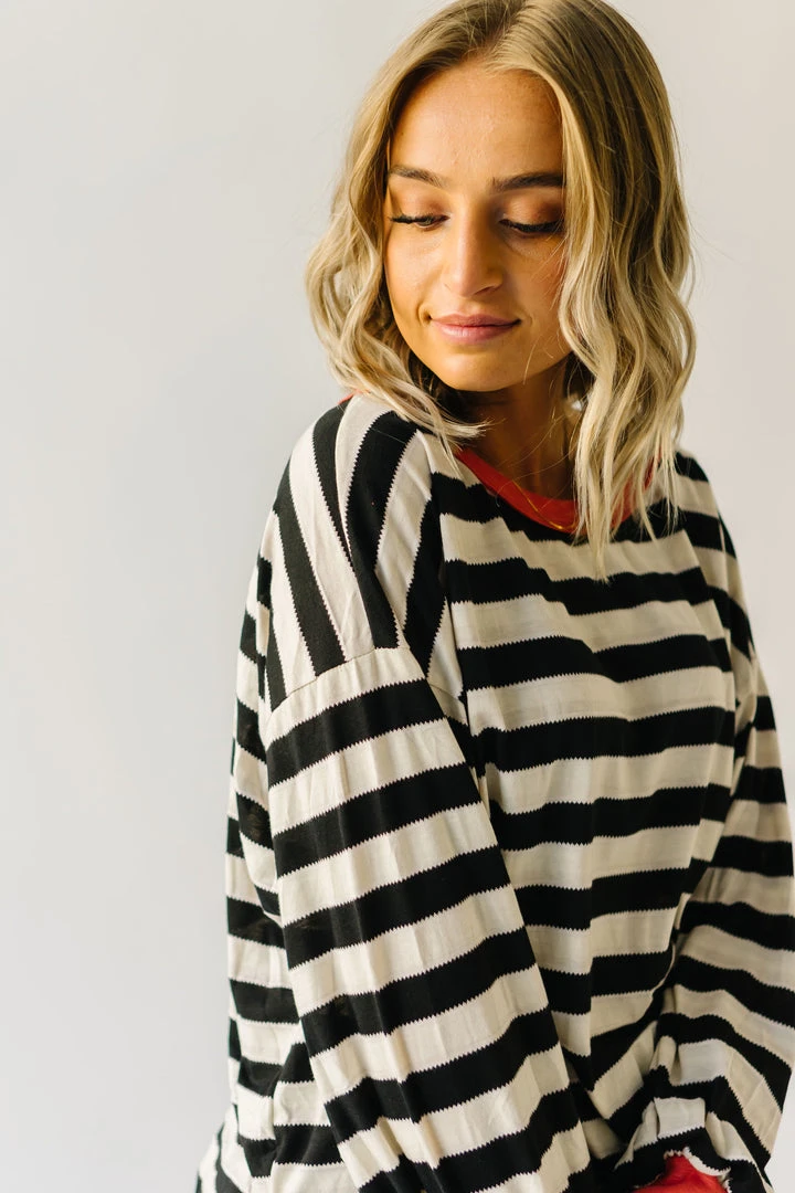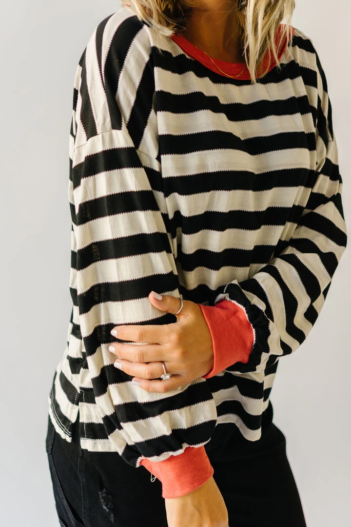 The Orson Dolman Sleeved Blouse has black + white horizontal stripes with a contrasting neckline + sleeve cuffs. It has a relaxed fit + a longer length.