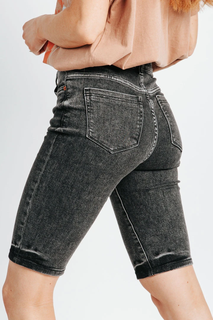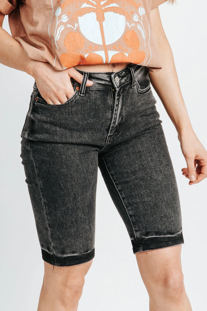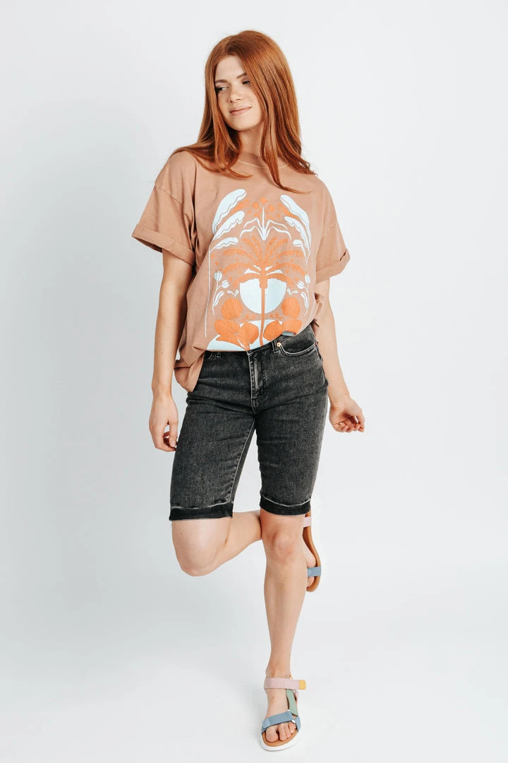 The Raydon Bermuda Shorts are stretchy with an acid black wash. They have a higher waistline with a raw hemline. Paired here with The Palm Foliage Tee.Â