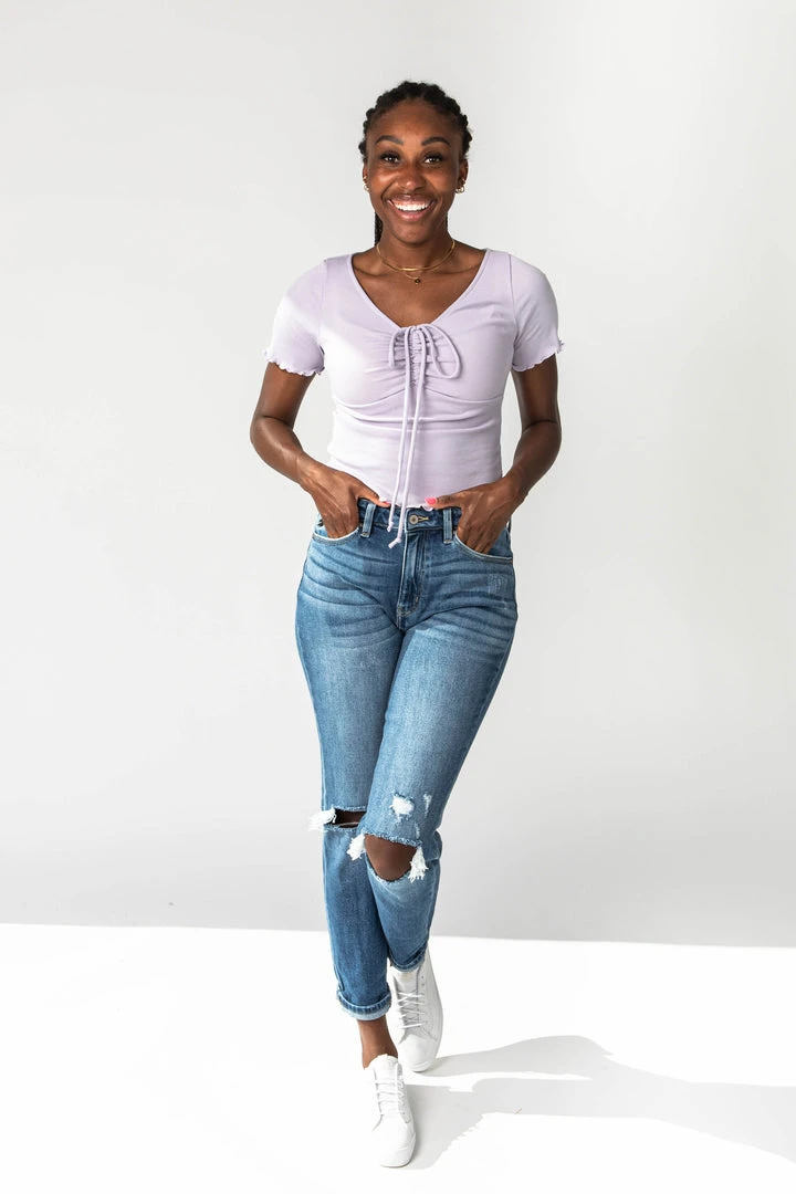 The Rayla Ruffle Detail Blouse is ribbed + lavender-colored. It has a slim fit with a ruched neckline + bow. It has a ruffled hemline + sleeve cuffs.