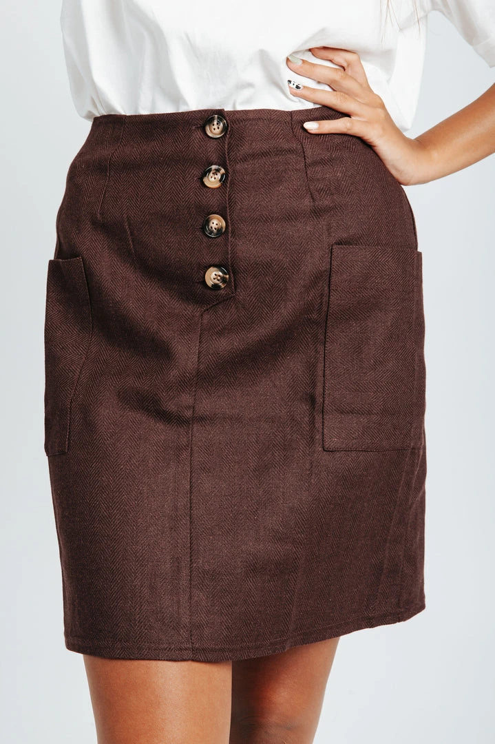 The Rocco Button Front Skirt is a tailored + tasteful approch to a fall-ready option. This plum skirt has buttons down the front, exposed pockets, and a slim + flattering fit.Â