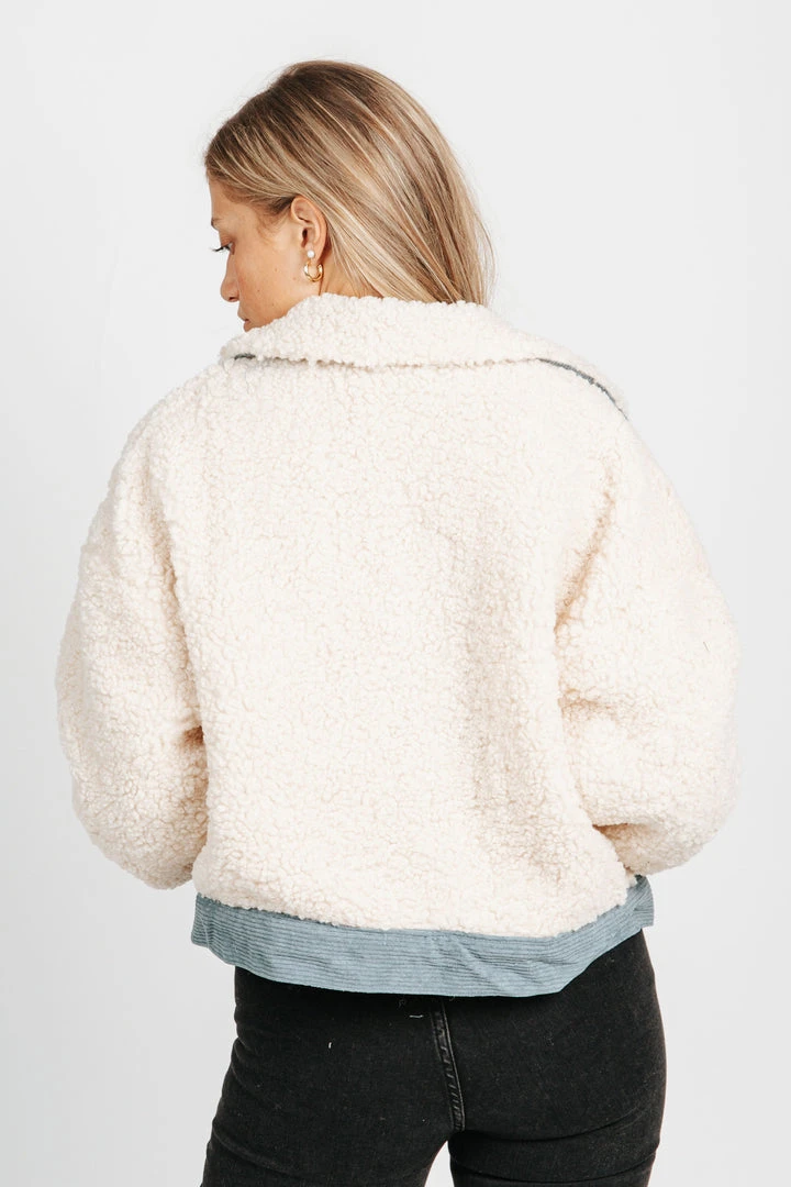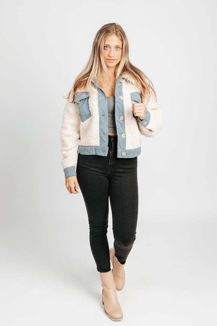 The Sawtell Denim Accent Sherpa Jacket has a cropped + boxy fit. The soft sherpa detailing is accented with corduroy trim +Â front pockets. It has a collar with buttons down the front.Â