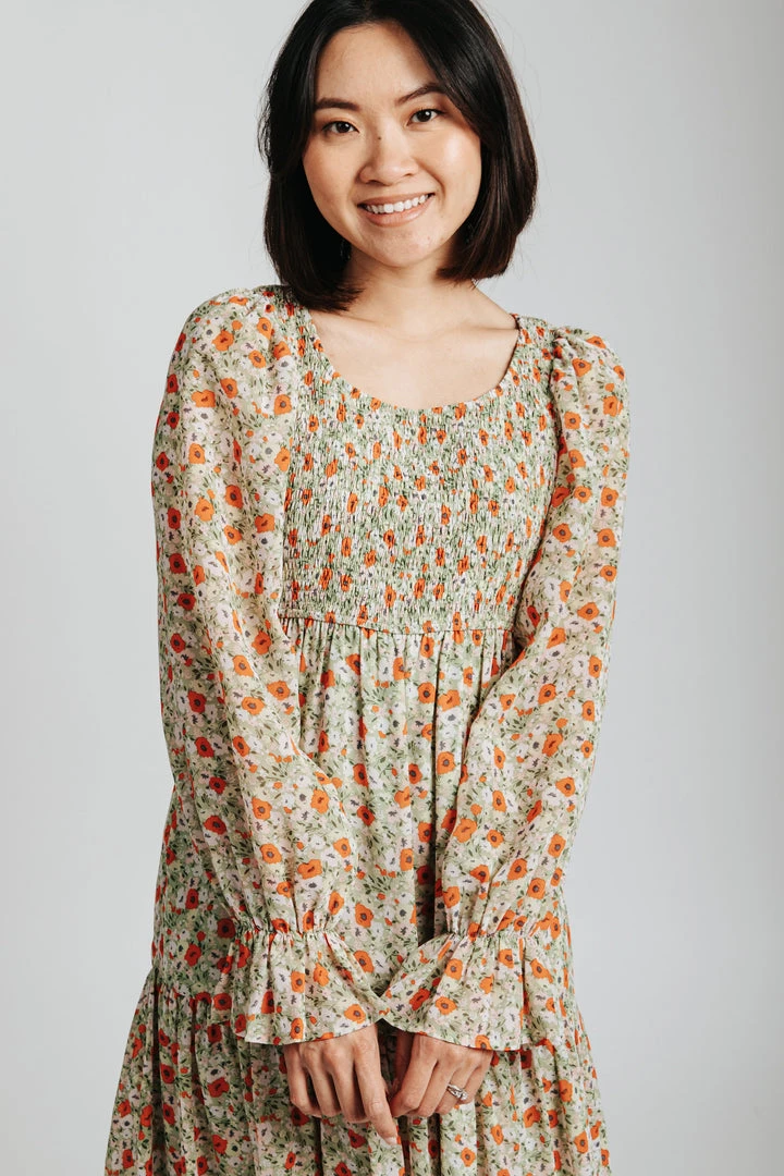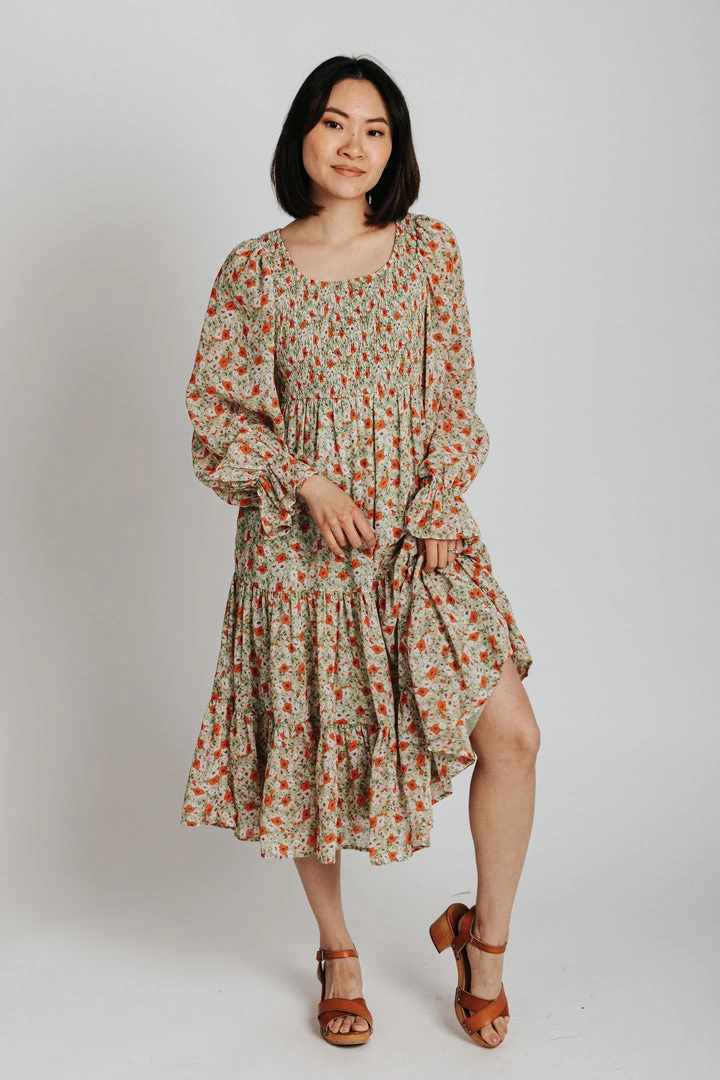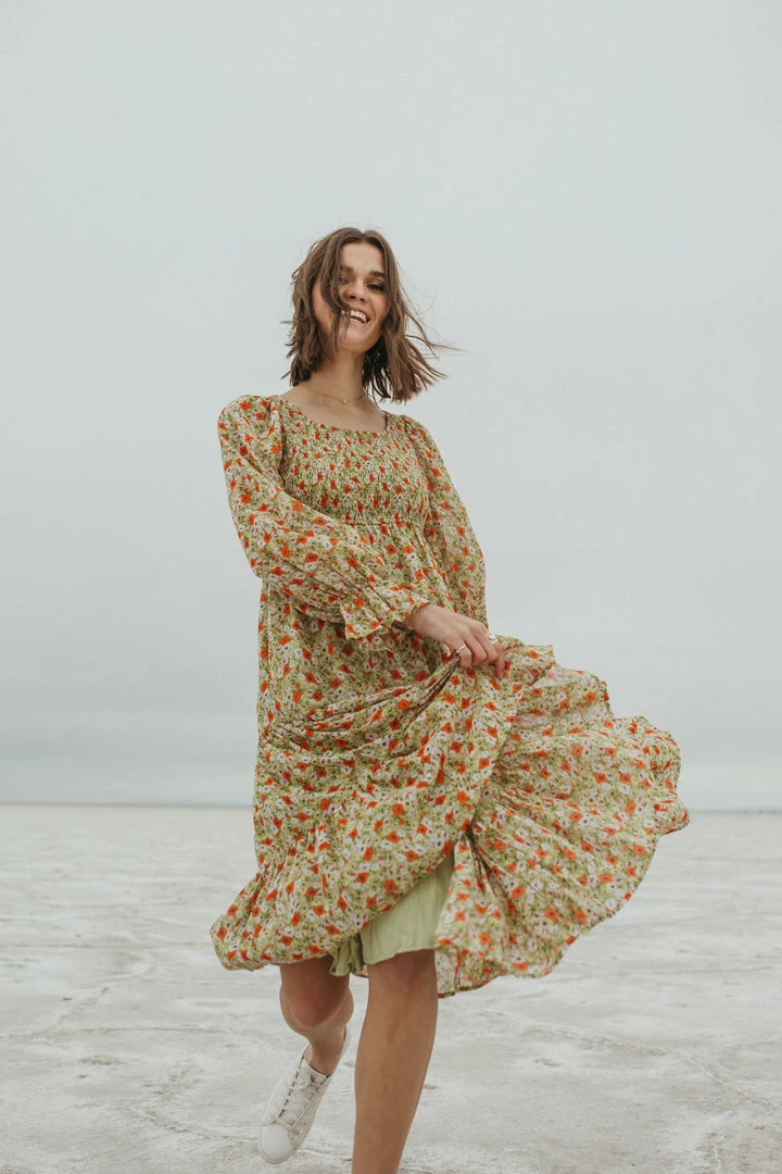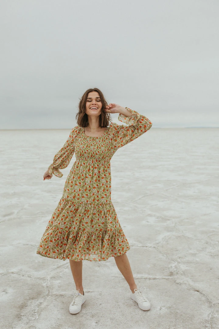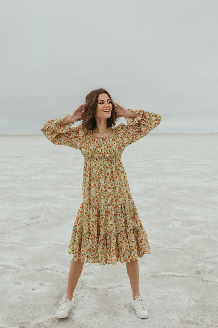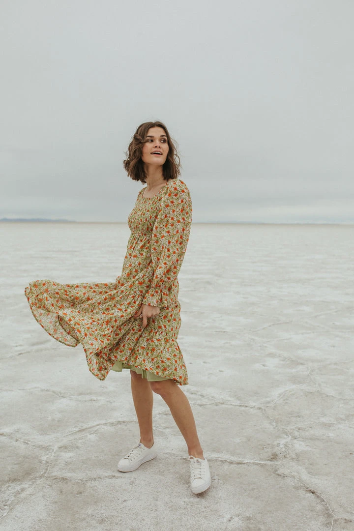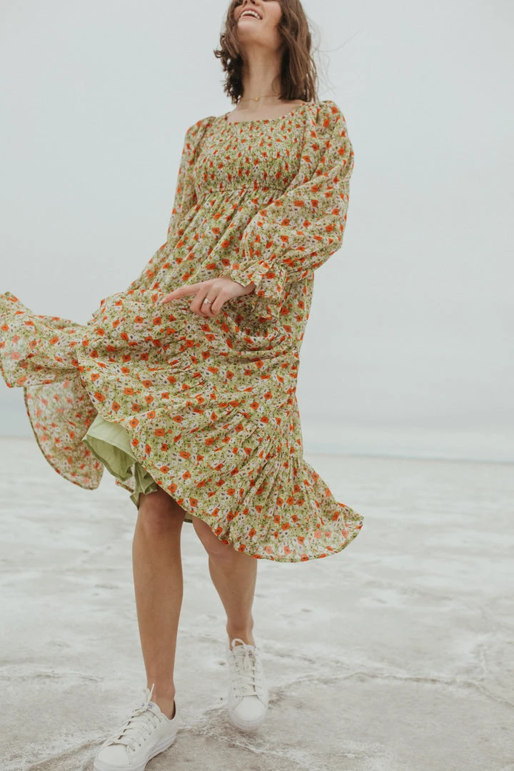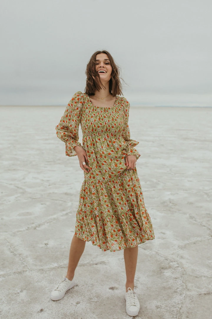 Named after a city that is effortlessly cool, just like this dress. The Seattle Floral Midi Dress has a smocked bodice with an empire waistline. It has sheer long sleeves with ruffle cuffs to match the ruffled hemline. It is lined.