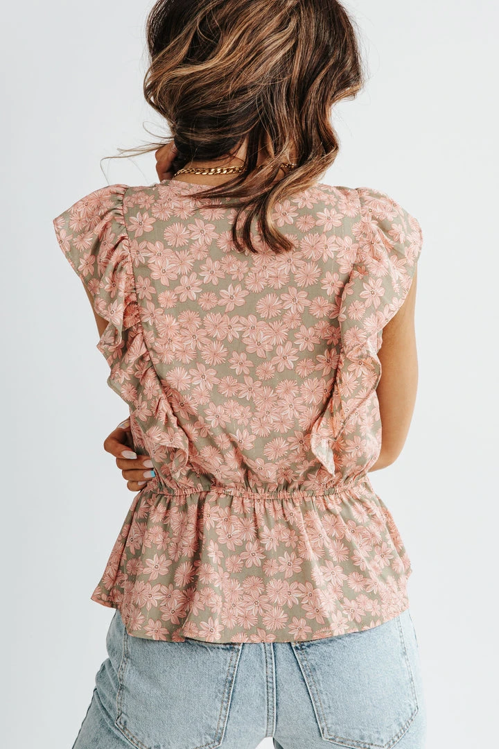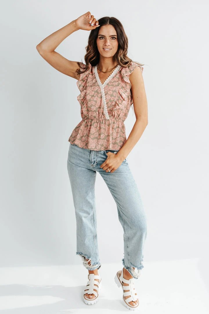 Trim detailing + ruffles take this top to the next level. It has a faux wrap style with an elastic peplum. The earth tones provide endless pairing potential.