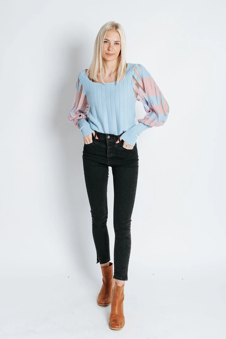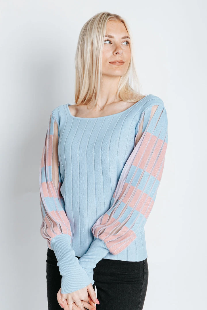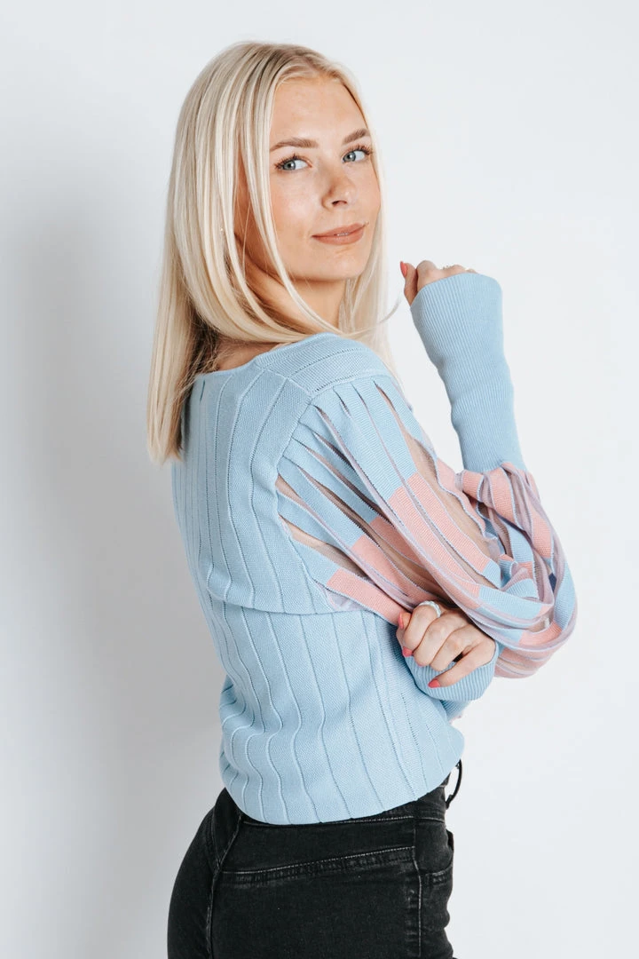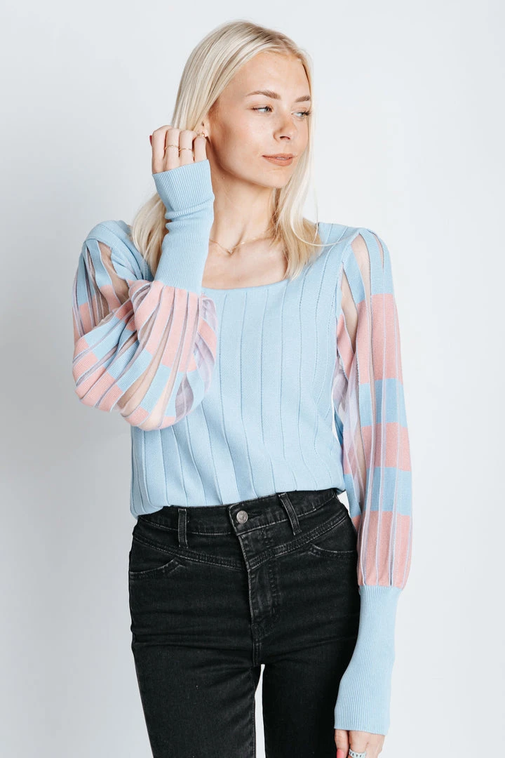 Unexpected statement sleeves leave a fashionable first impression. The Simla Sleeve Detail Blouse is baby blue with a slightly wide neckline and a traditional fit + length. The long sleeves have sheer pleating with color panels to create a complementary contrast.Â