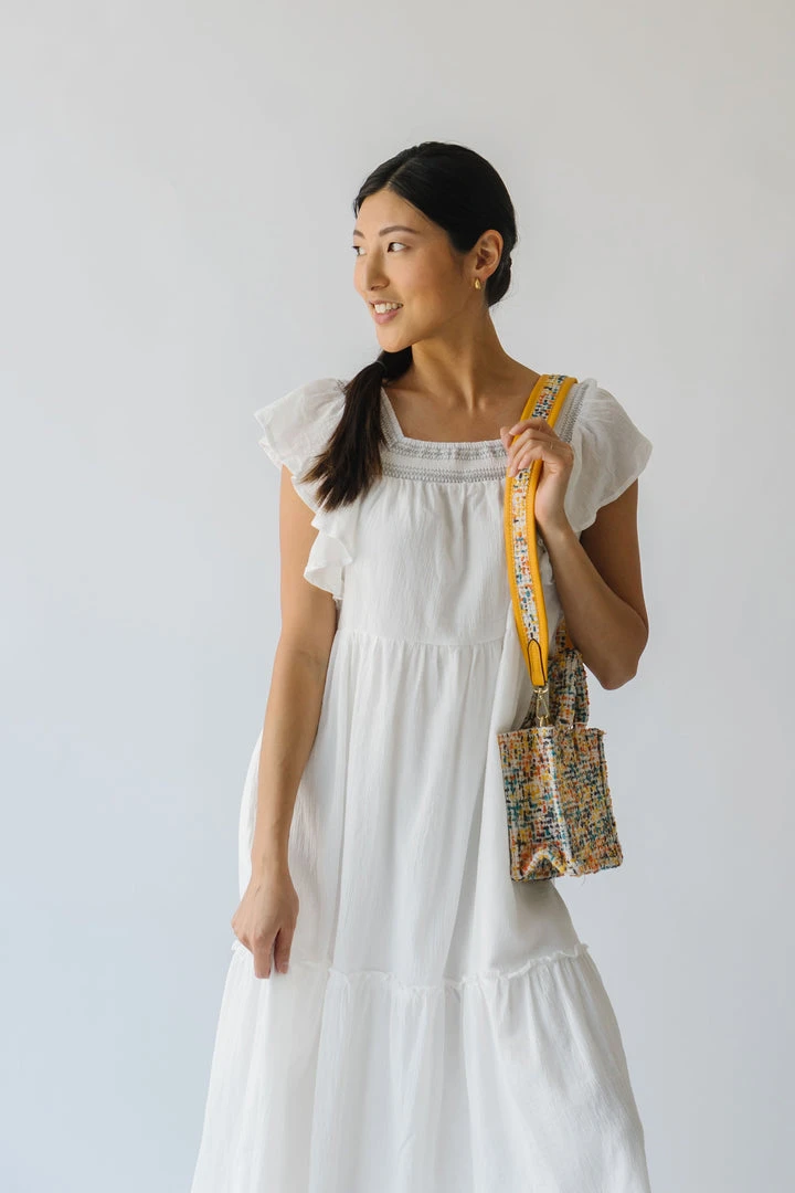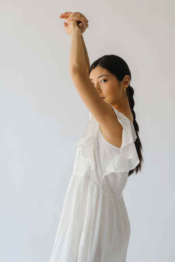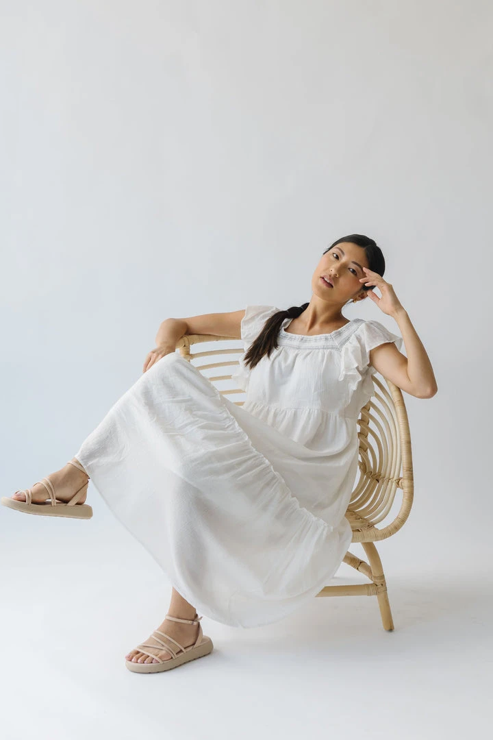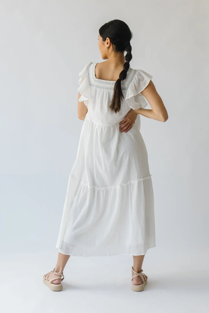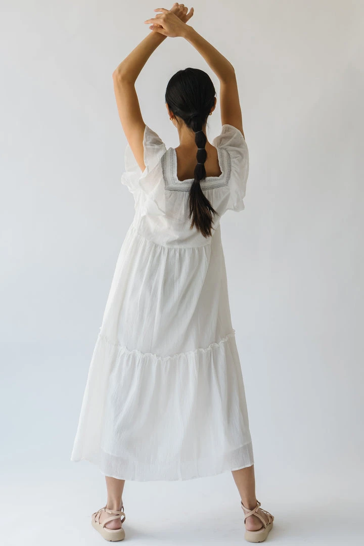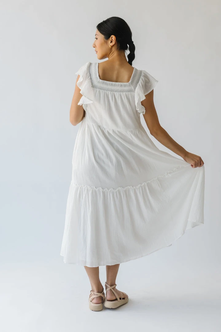 This lovely lightweight dress has a square neckline, ruffled sleeves, and a tiered skirt. It is a gauze-cotton material that is breathable + easy to care for. It is lined.Â