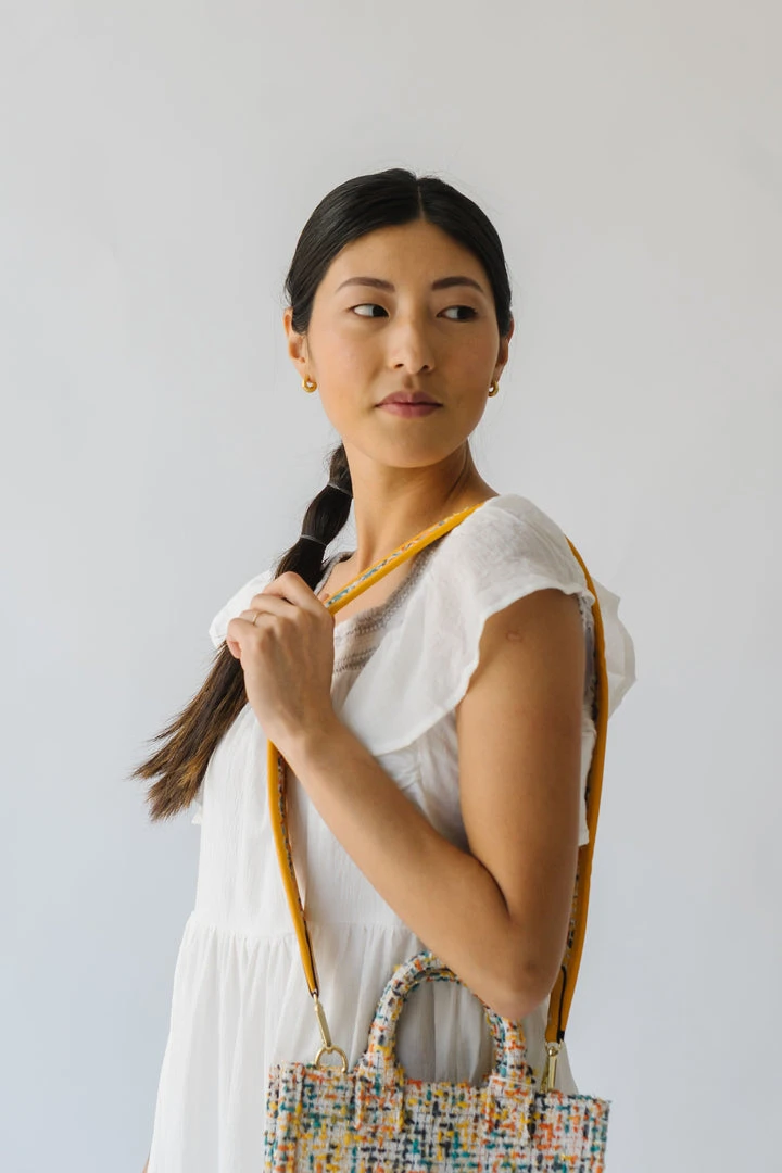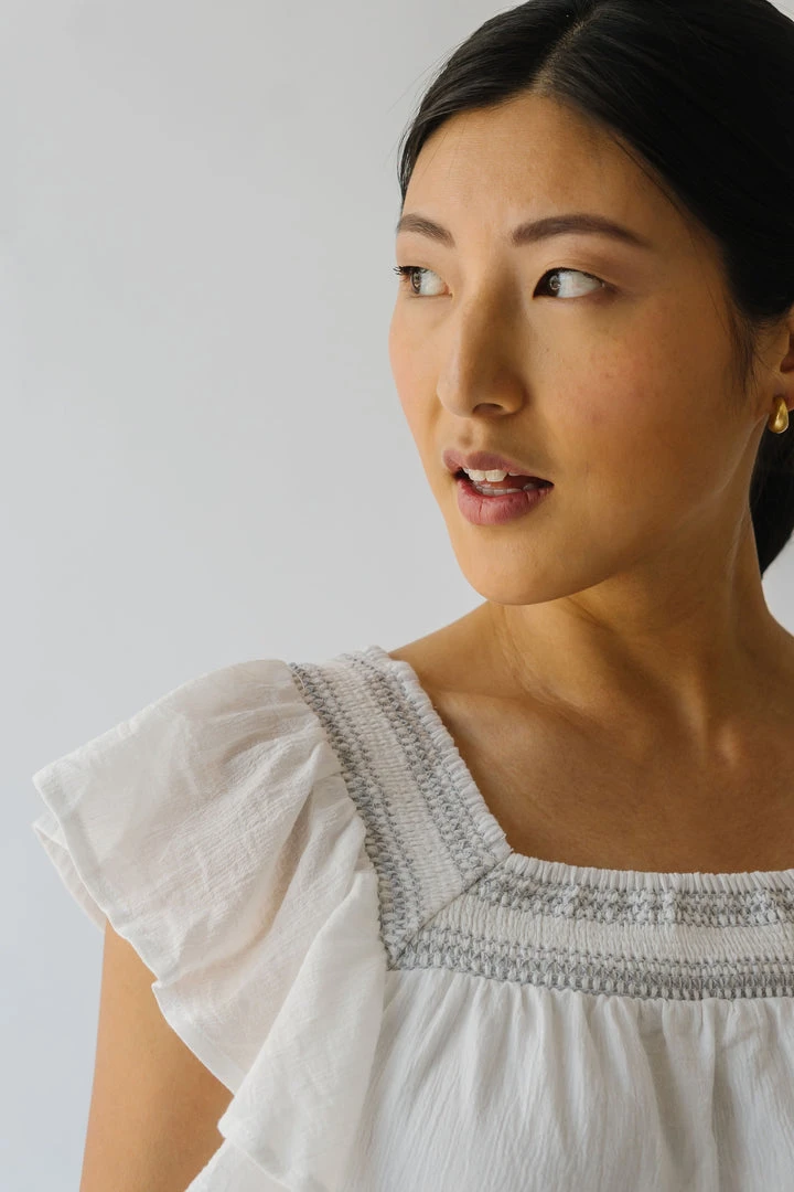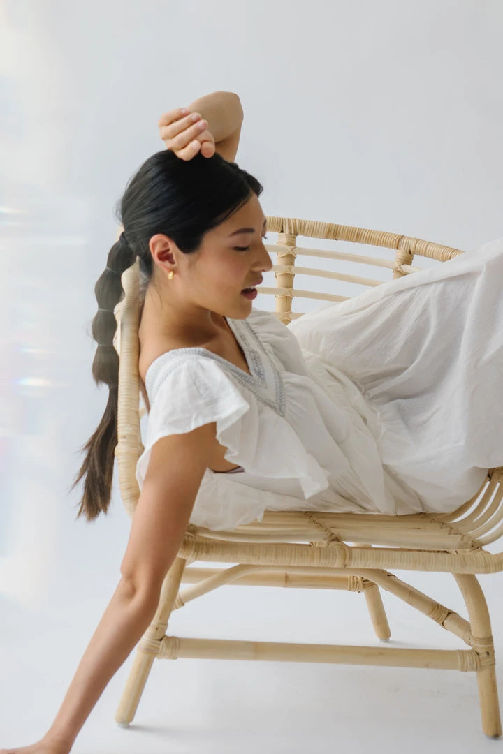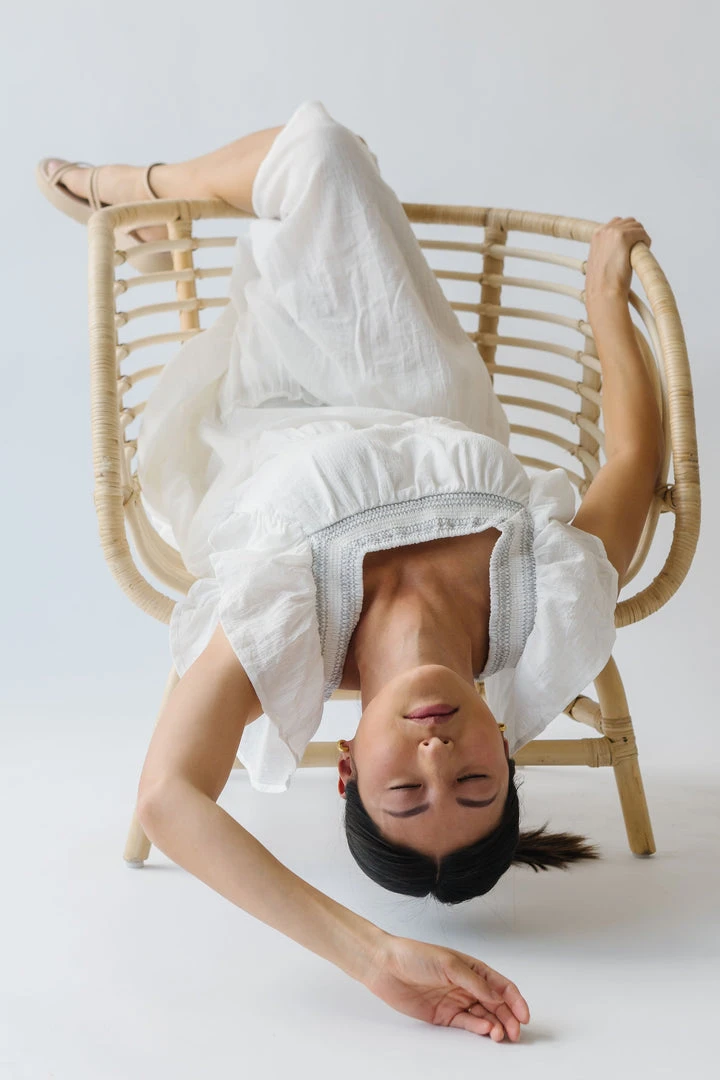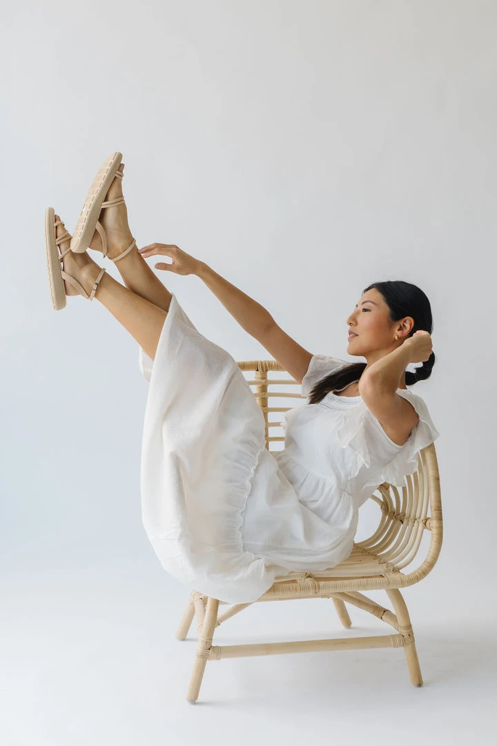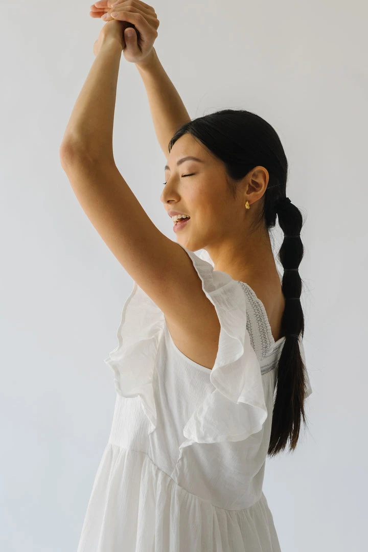 This lovely lightweight dress has a square neckline, ruffled sleeves, and a tiered skirt. It is a gauze-cotton material that is breathable + easy to care for. It is lined.Â