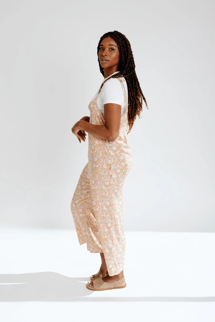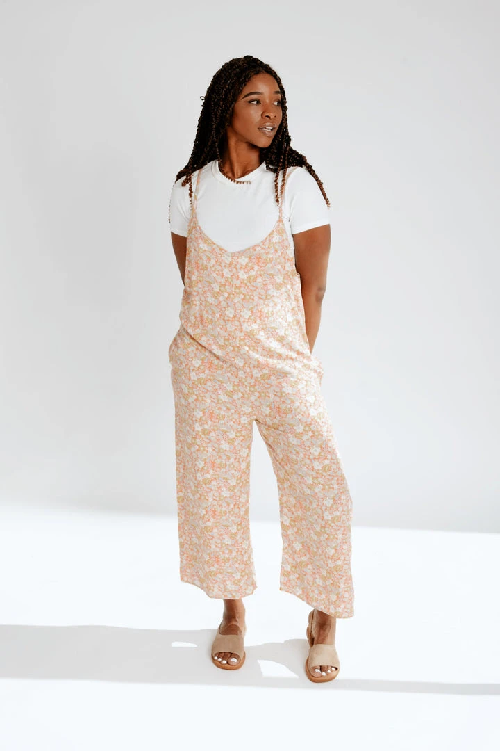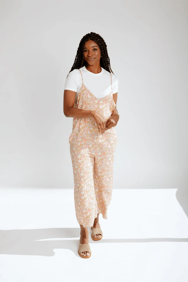 The Stan V-Neck Jumpsuit has adjustable tie straps with a v-neckline. It has a fun floral print with hidden side pockets. It can be dressed up for date night or kept casual.Â