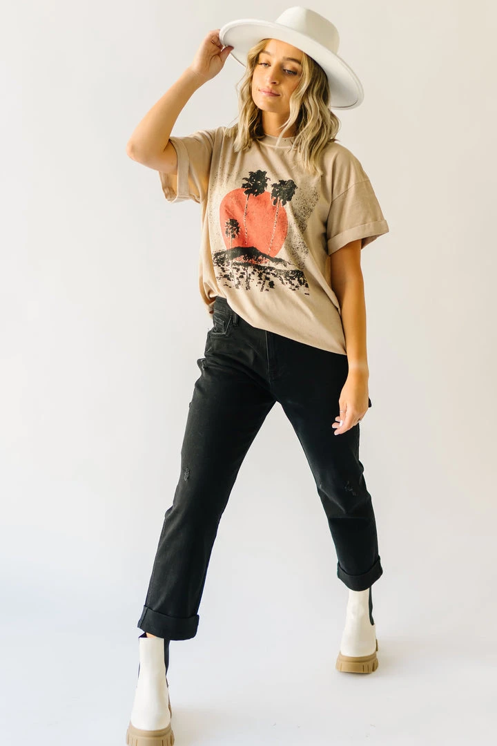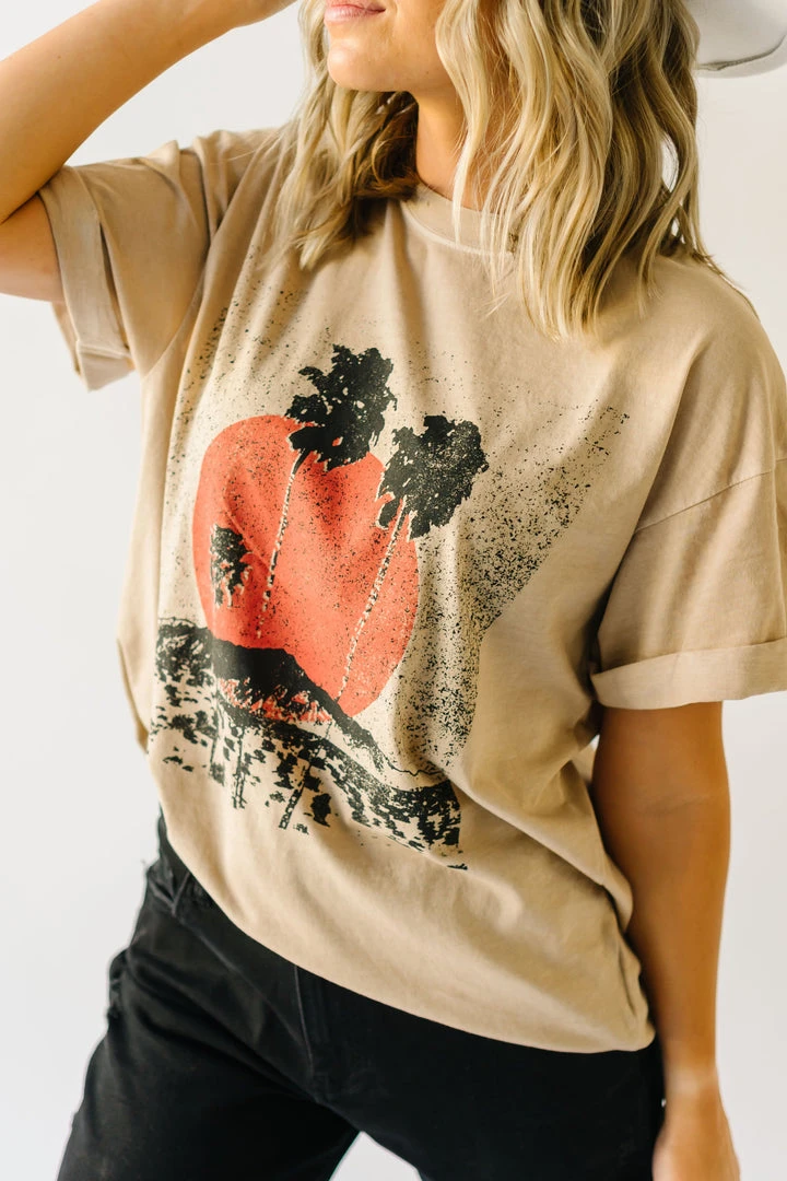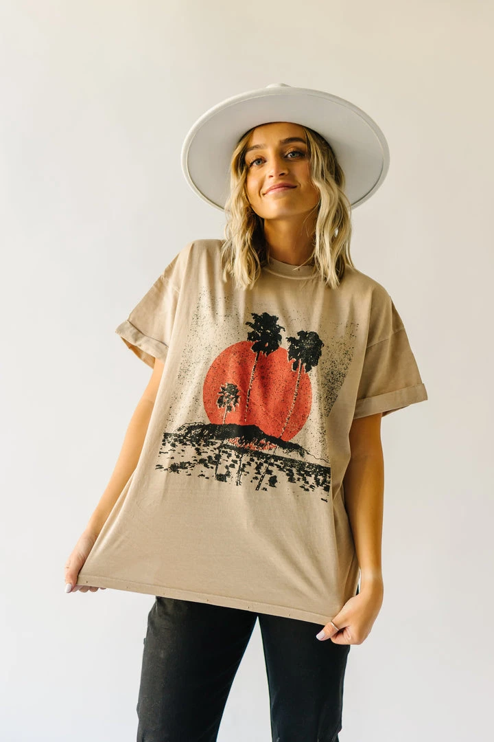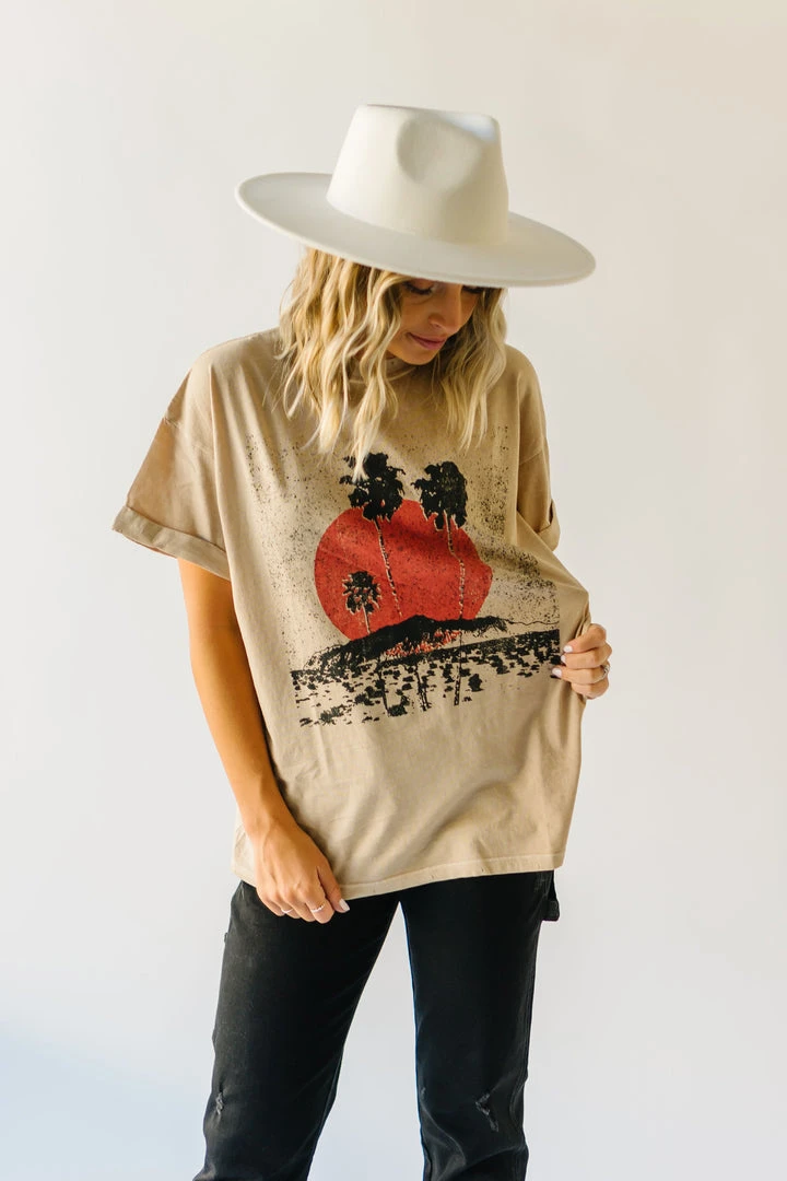 This comfy cotton tee has vintage vibes with its graphic + typography. It looks like it could’ve been found in a souvenir shop at your favorite destination (except even better)! It has an oversized + longer fit. The short sleeves are tacked and cuffed.Â