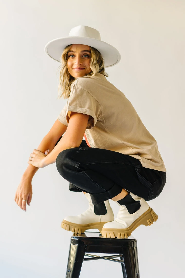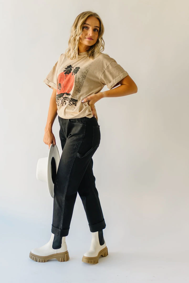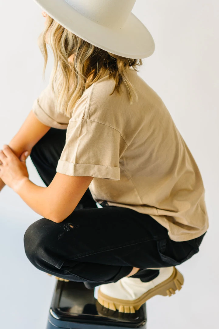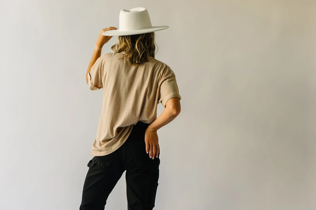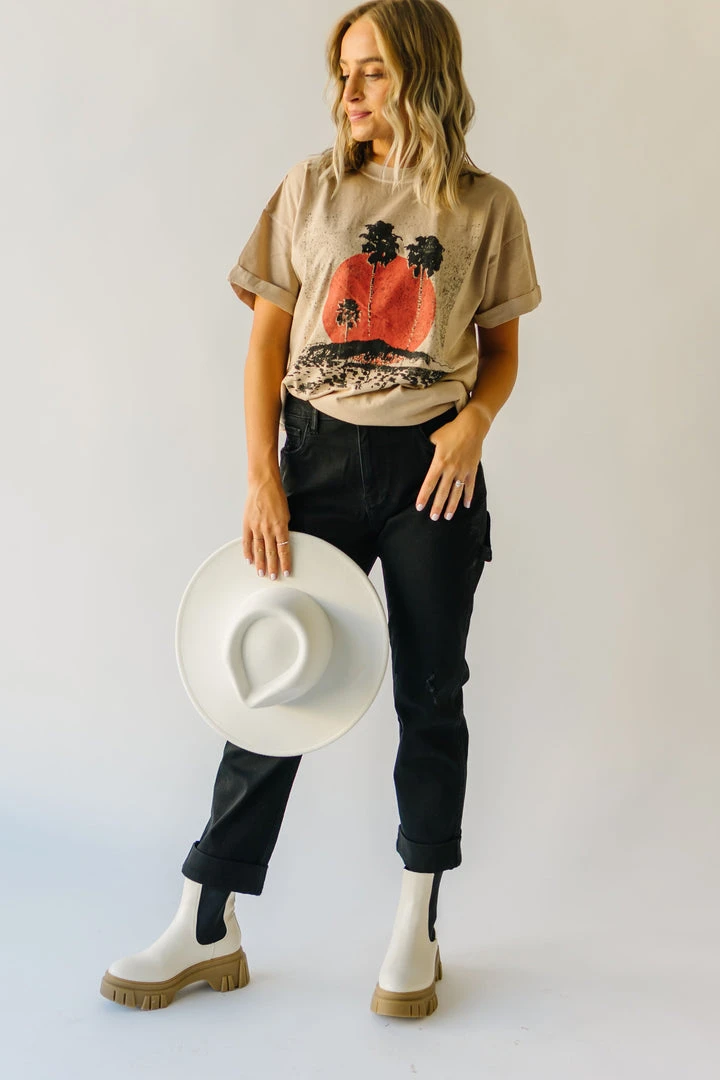 This comfy cotton tee has vintage vibes with its graphic + typography. It looks like it could’ve been found in a souvenir shop at your favorite destination (except even better)! It has an oversized + longer fit. The short sleeves are tacked and cuffed.Â