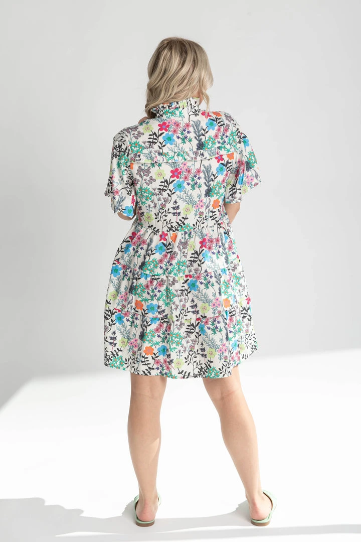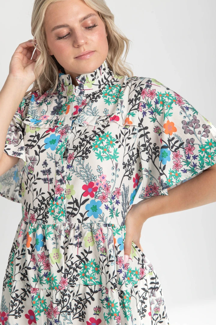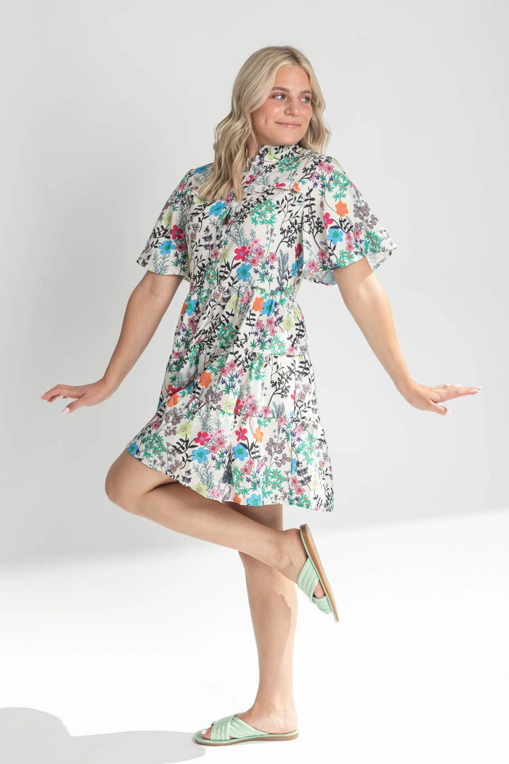 The Tilly Floral Dress feels fresh + fun for summer. It has flutter short sleeves, buttons down the front, and a tiered skirt. It has a structured silhouette + is a shorter style.