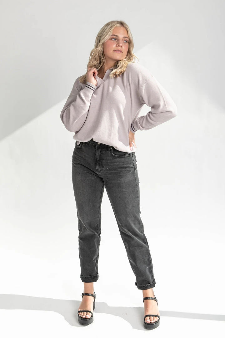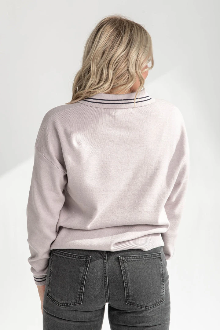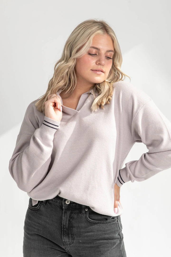 The Tove Collared Top is for when things cool down. Maybe at nighttime, on an early morning walk, on rainy days, etc. It has a collar with a v-neckline. It is a lighter-weight knit with a traditional length + fit.Â