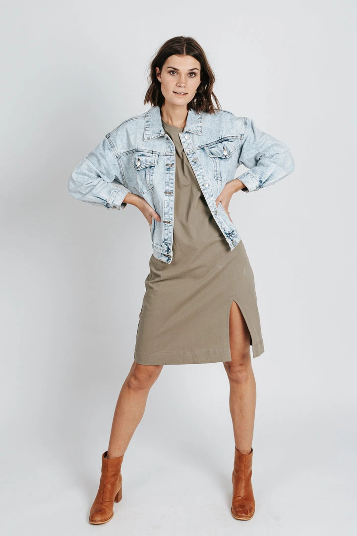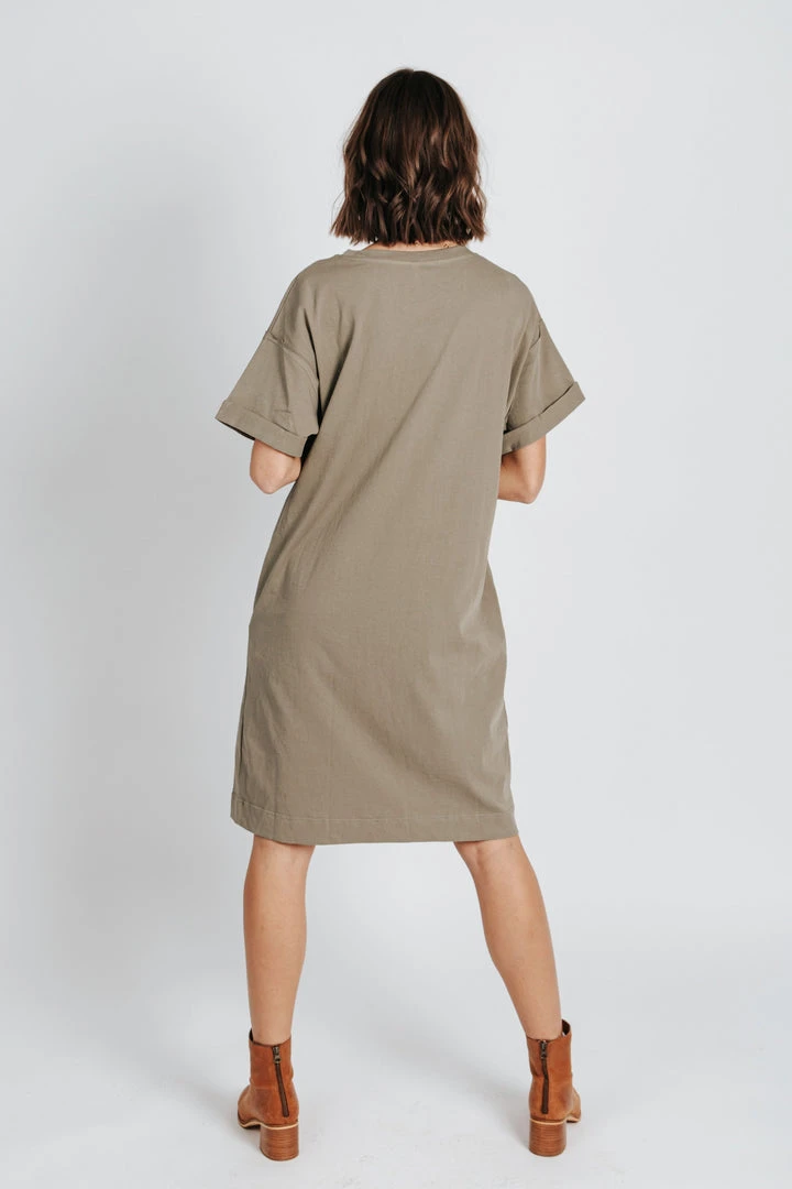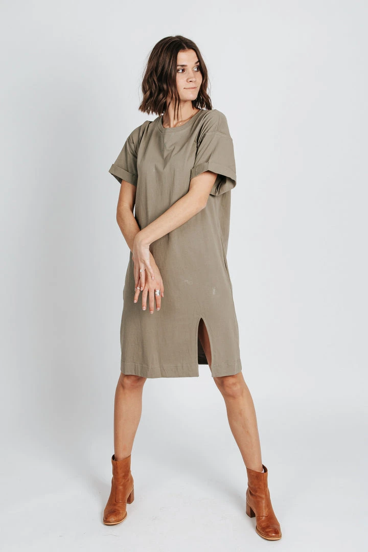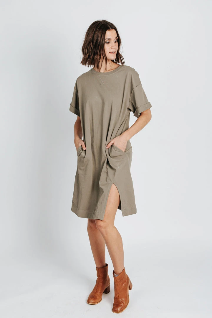 An everyday dress that has a versatile fit + color. The Tyler Casual Dress has drop shoulder cuffed short sleeves. It has a loose + stretchy fit since it is 100% cotton. It has hidden side pockets. It has a stylish slit.