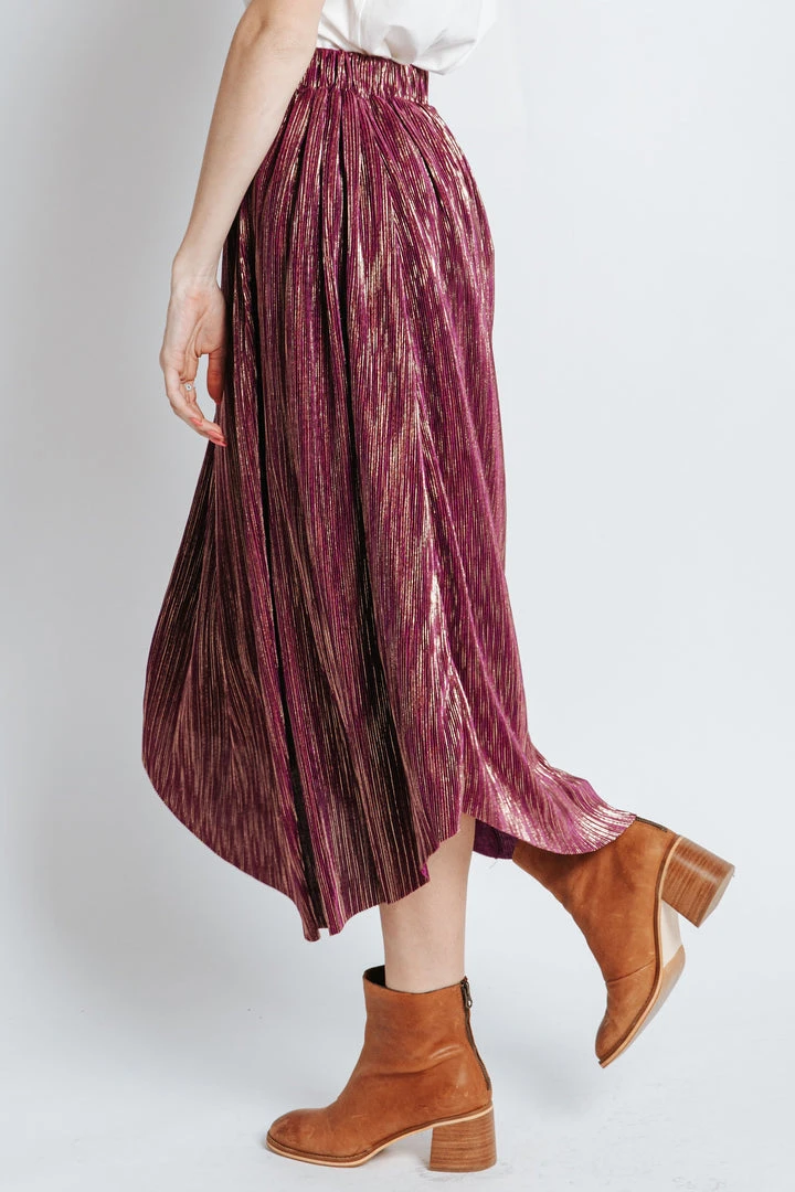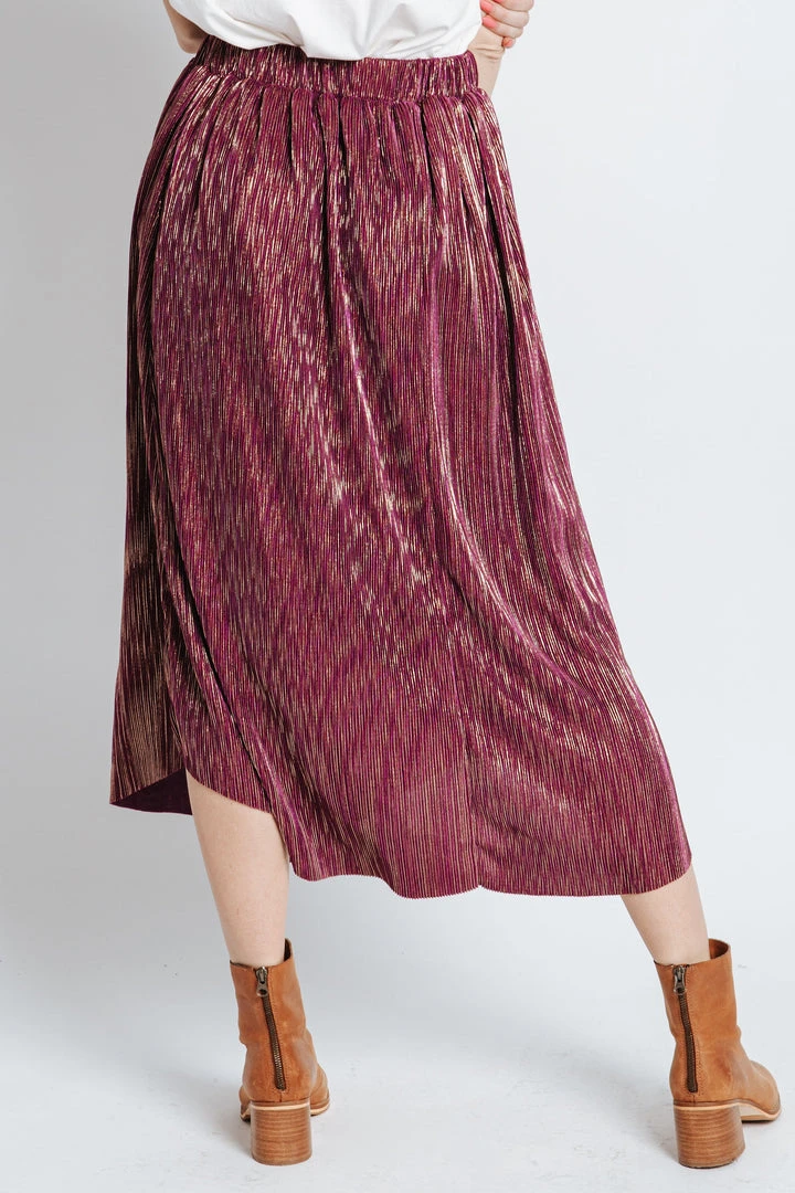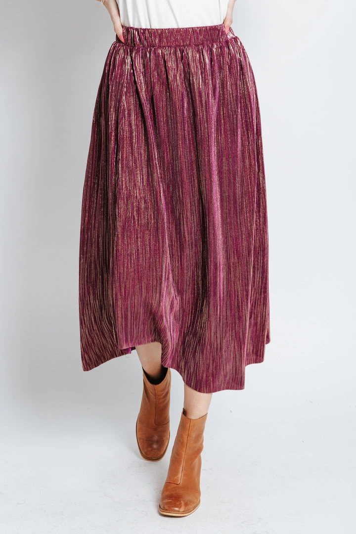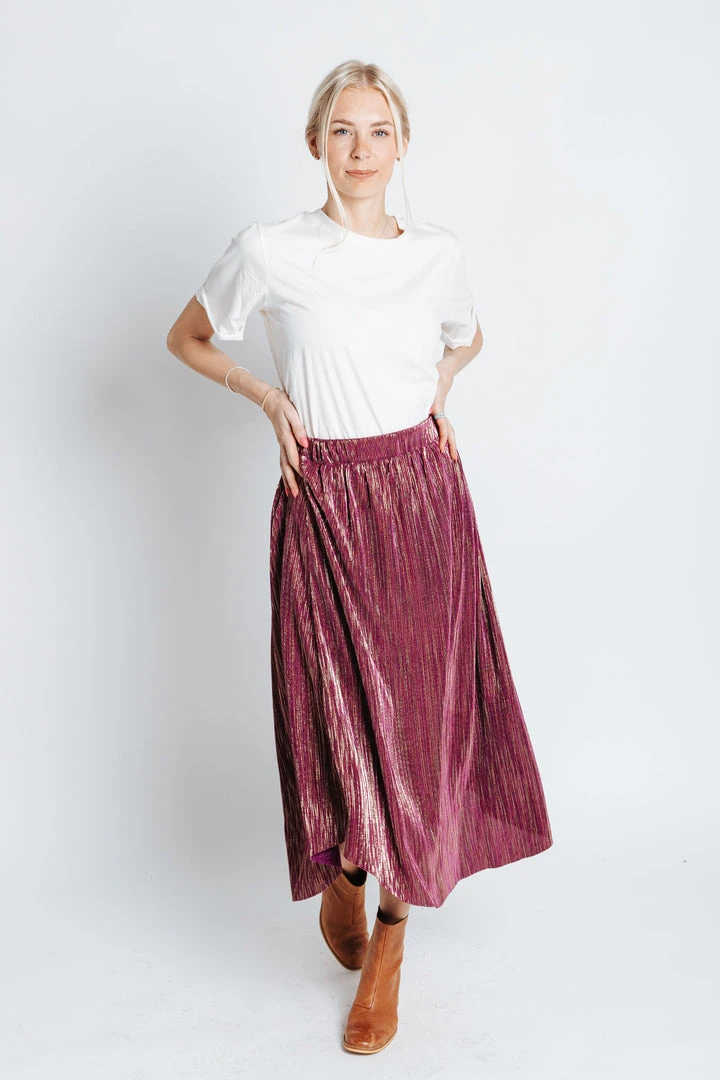 The Ugoh Shimmer Skirt is essential for any upcoming special event. It has an elastic waistline while the fabric of the skirt is as stretchy as it is sparkly. It is a striking purple color that feels regal + versatile.Â