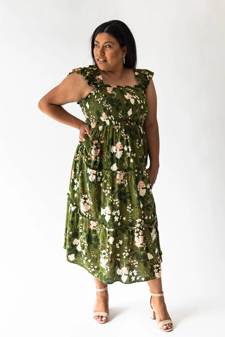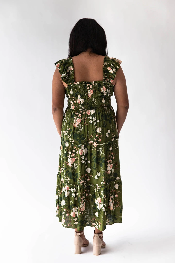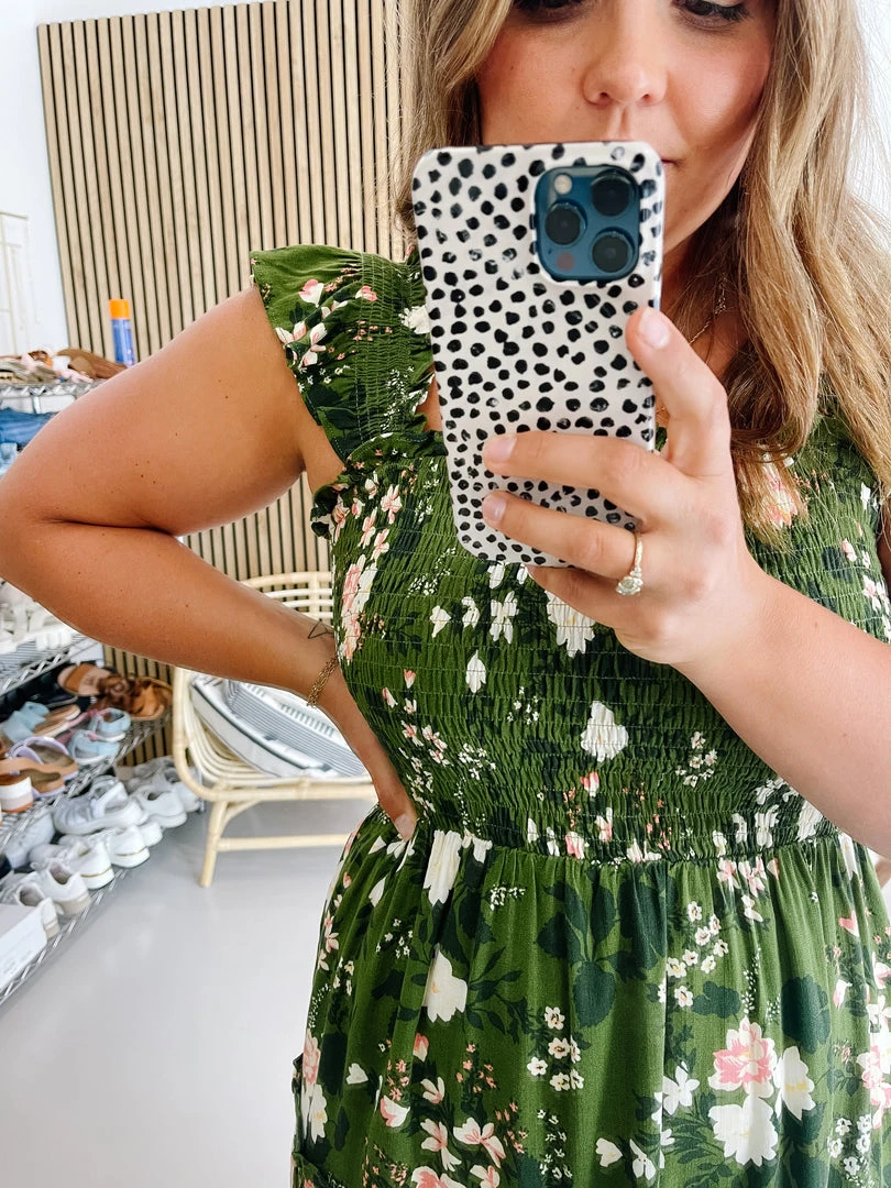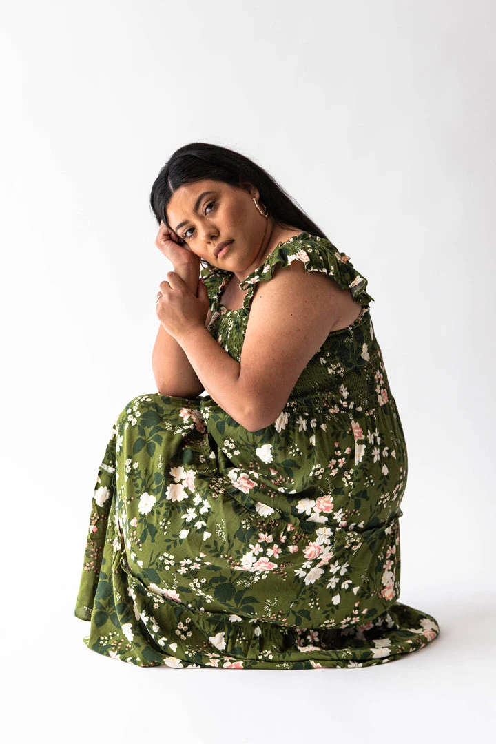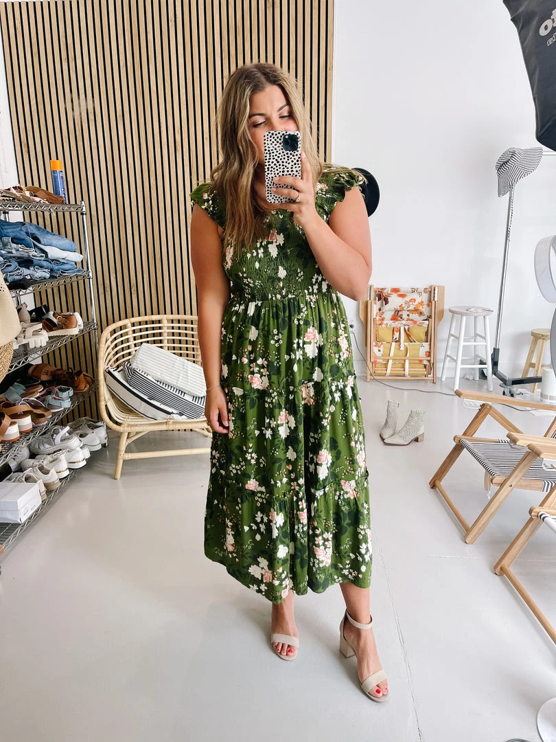 The Watson Floral Dress has vintage vibes with its floral print + green hues. It has tank-style straps, a smocked bodice, and a ruffled hemline.