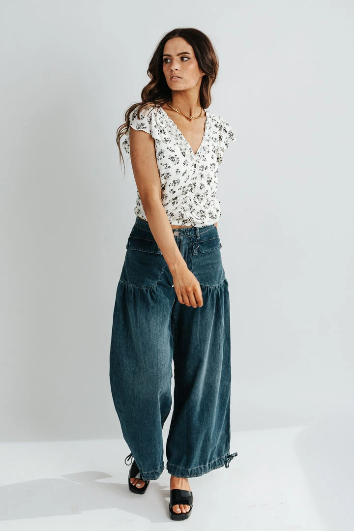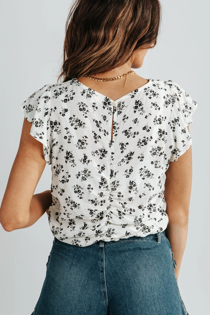 This cream-colored blouse has a timeless floral print with flutter sleeves. The ruched front adds texture + visual interest. It has a v-neckline + a slightly cropped length.