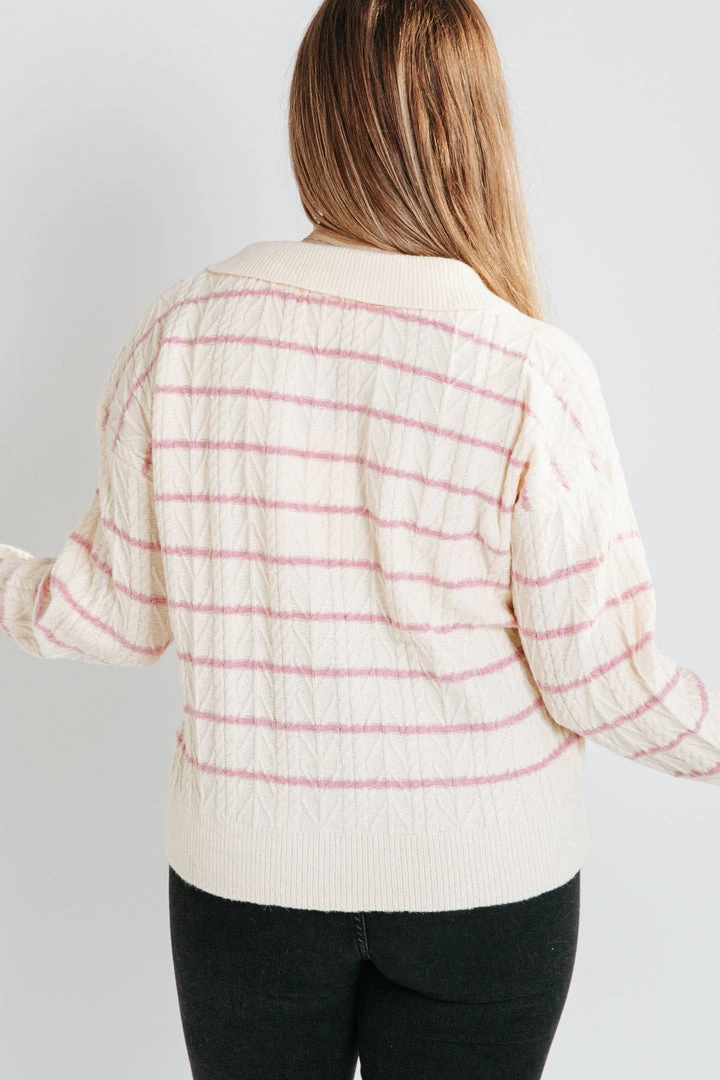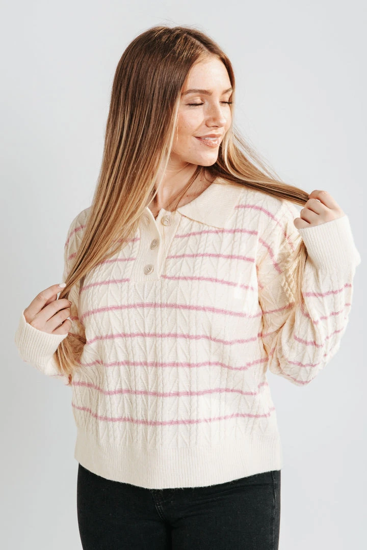 The Andrus Striped Detail Collar Blouse is a henley style knit with horizontal stripes. It has a subtle cable-knit texture + a cropped fit.Â