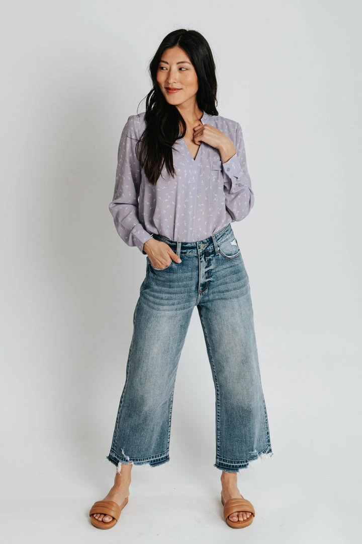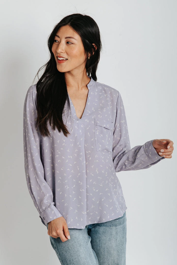 The Baxter Printed V-Neck Blouse has a banded collar with a v-neckline. It has long sleeves with button cuffs. It is a traditional length + fit. It is a perfect top for dressing up or keeping casual.